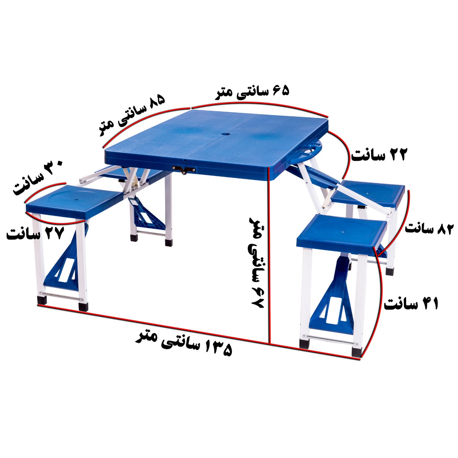میز و صندلی ۴نفره تاشو،تحمل هر صندلی تا ۱۲۰ کیلوگرم،جنس پلاستیک از مواد abs و پلیمر،جنس پایه ها و اتصالات آلومینیوم،شاسی زیر صندلی ها از پروفیل یک در یک آهن،رنگ استاتیک و قابل شست و شو،کیفیت بالا ،ساخت ایران با یک سال گارانتی