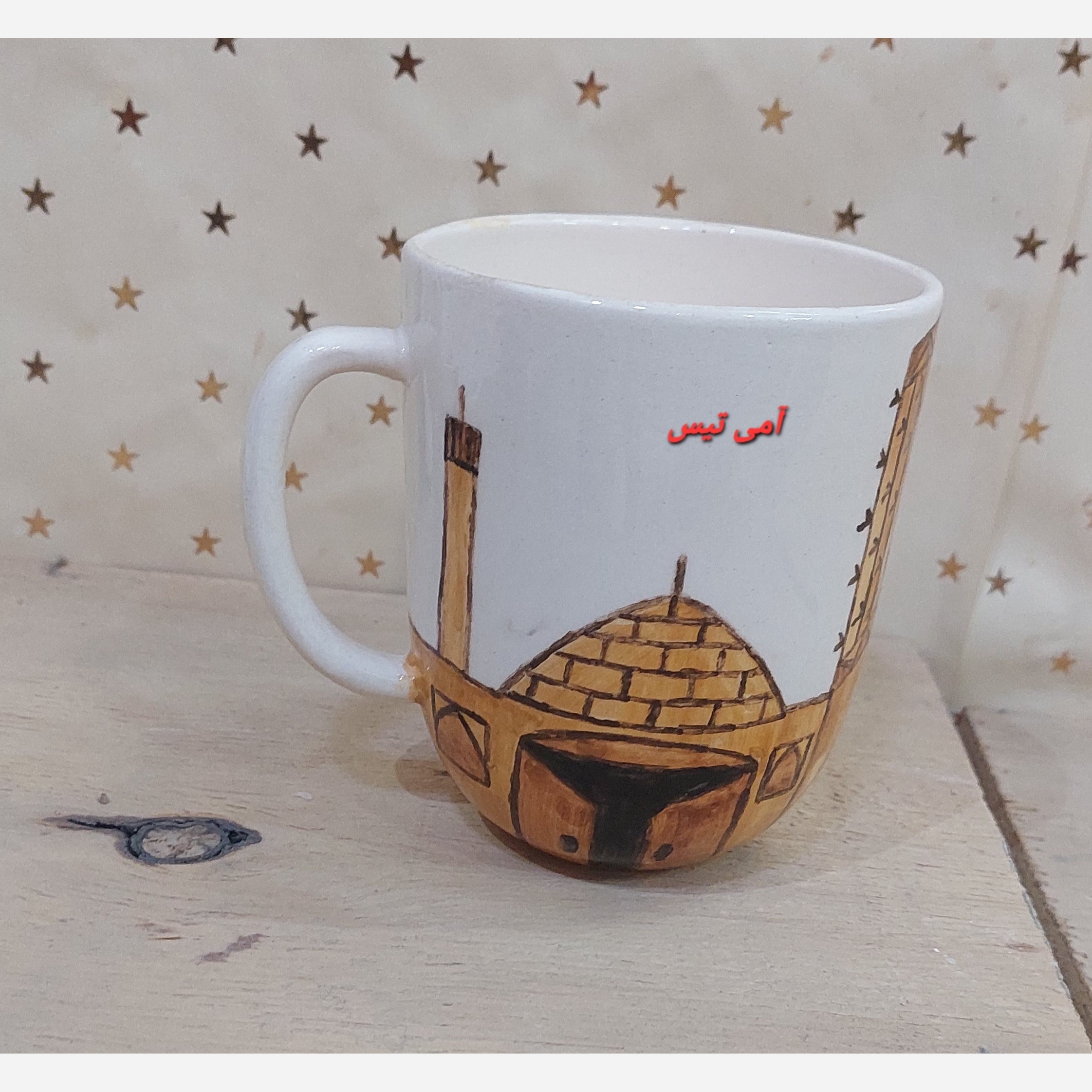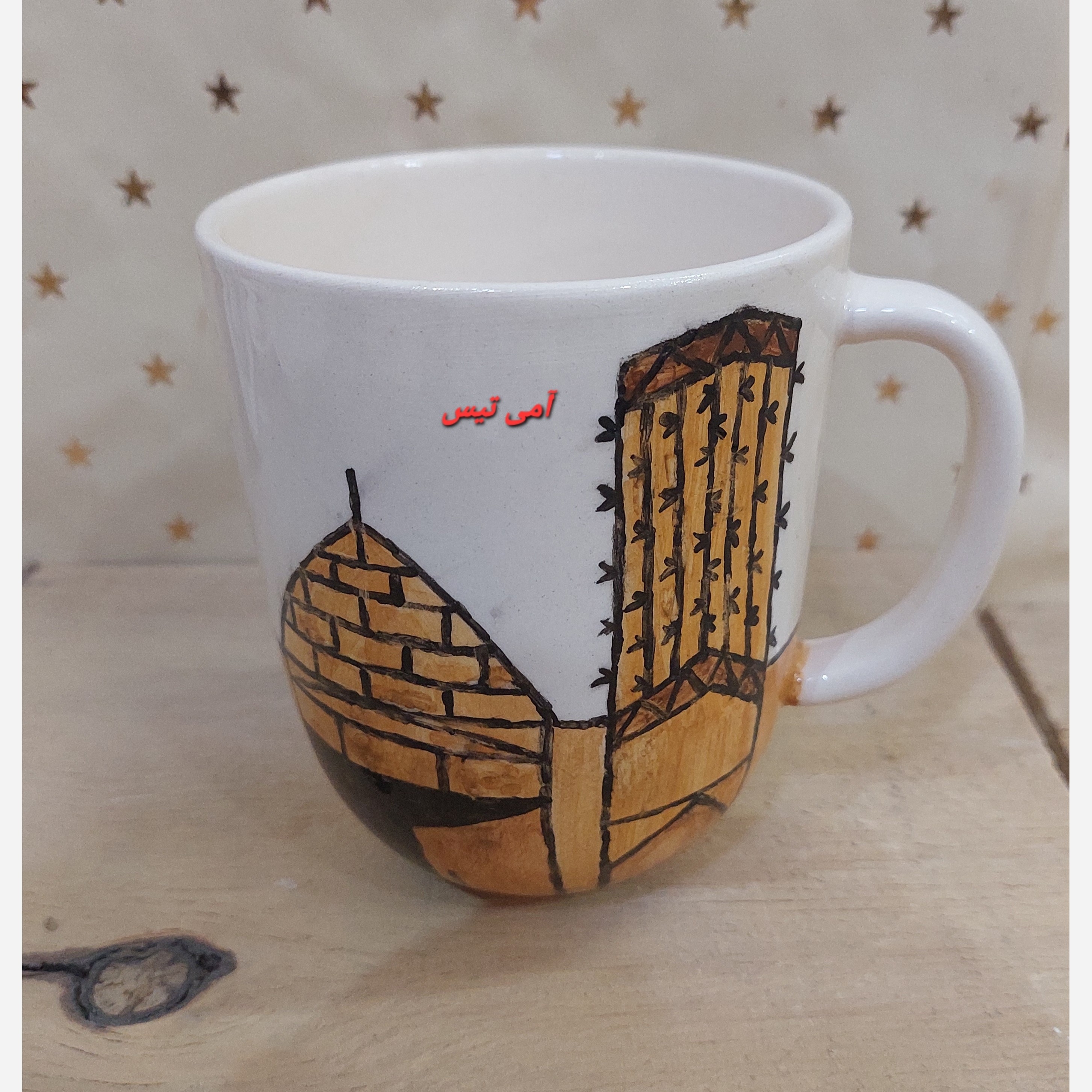 لیوان دسته دار سرامیکی طرح سنتی بادگیرهای یزد، دستساز و قابل شستشو و کاربردی و قابل استفاده، زیبا، برای سرو نوشیدنی مناسب هست، دستساز ونقاشی شده.