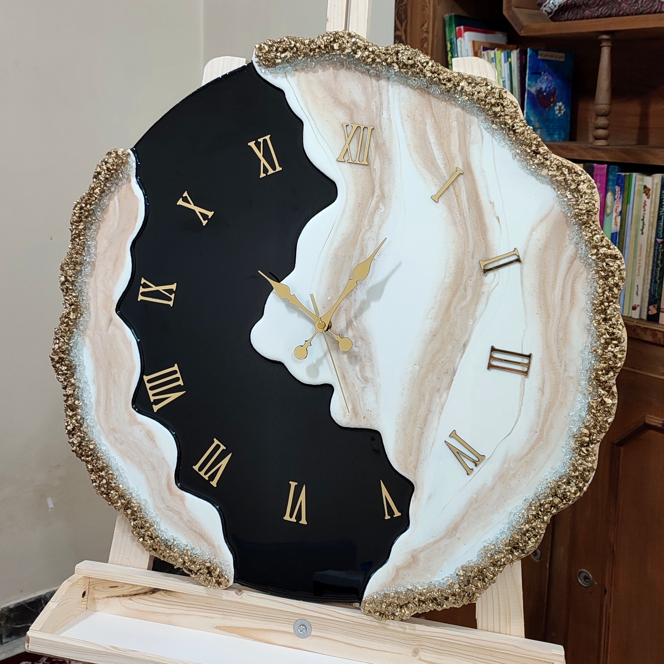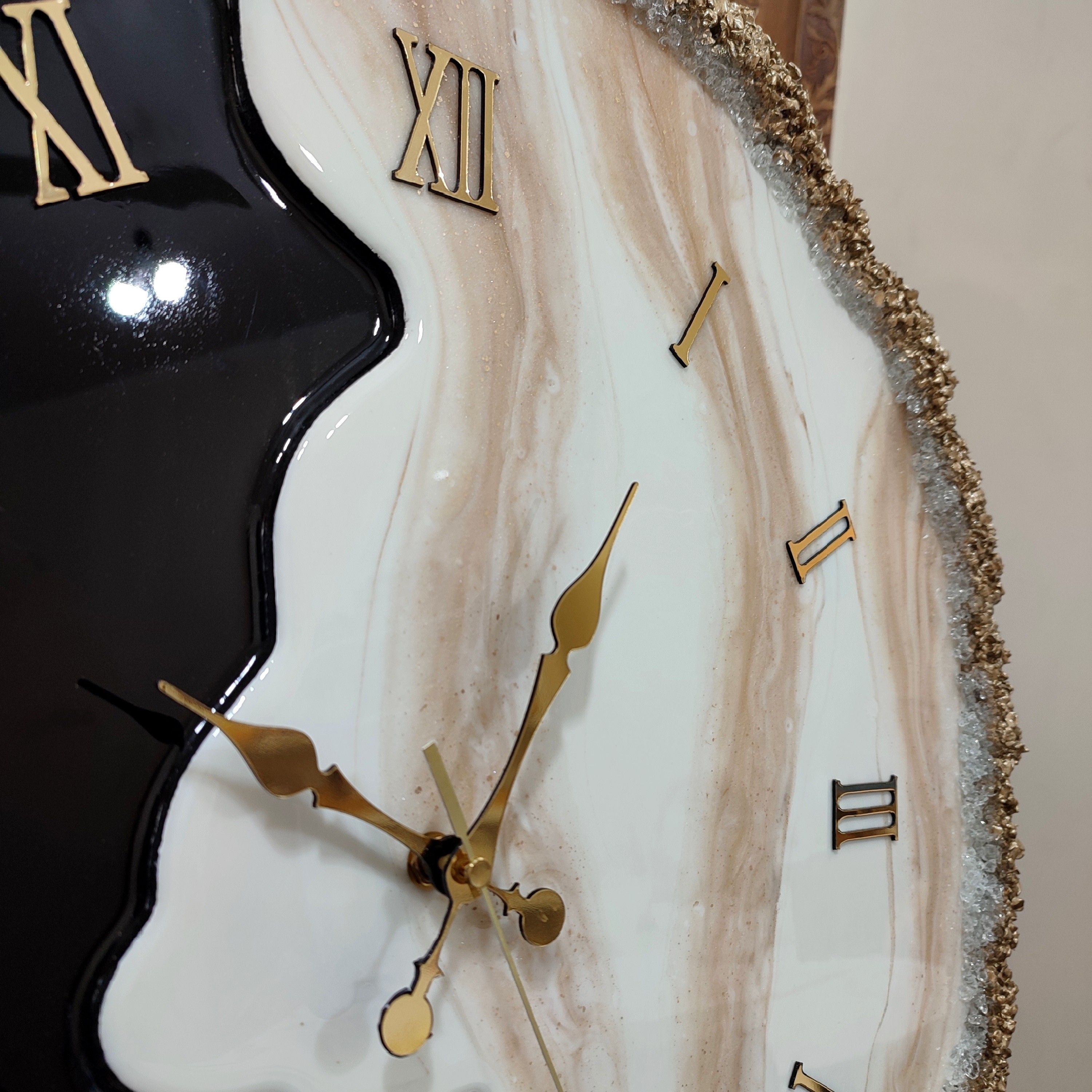ساعت دیواری رزینی طرح دفرمه کرم طلایی زمینه مشکی مبلمونسرا مدل 239823