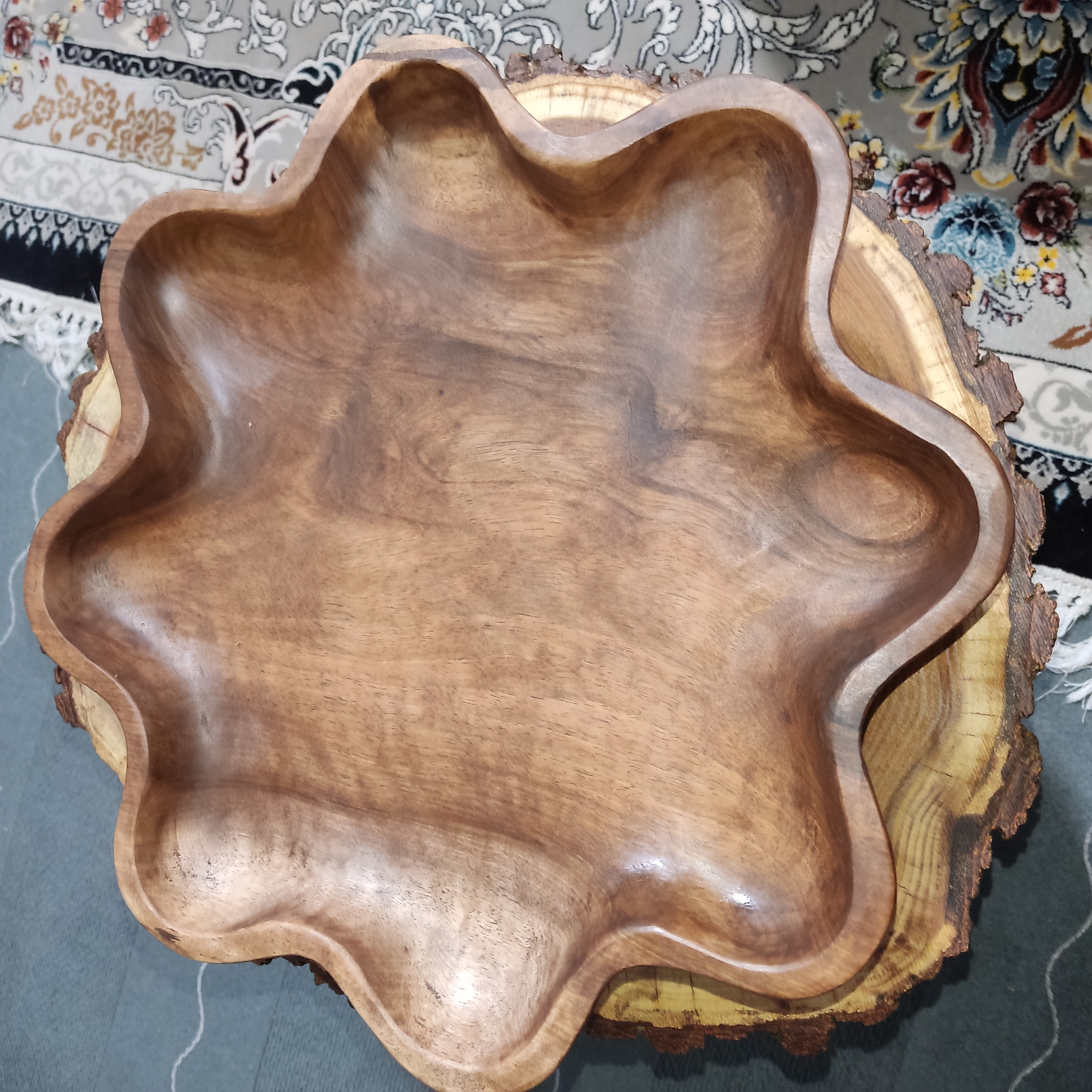 میوه خوری خوری پایه دار چوب گردو تیره قطر۳۴ ارتفاع۵ ظروف چوبی از جنس گردو قبل از سفارش موجودی بگیرین🙏 قابلیت اجرا این طرح بروروی چوب تیره گردو و روشن چوب سنجد امکان پذیر میباشد قابلیت سایز بندی و ست کامل ازین طرح . اجرا برای هفت سین