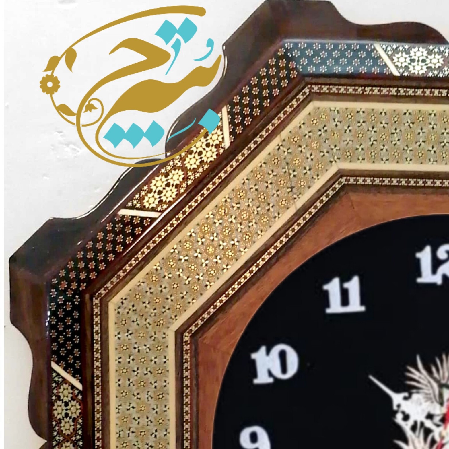 ساعت دیواری خاتم کاری شیشی دالبری به همراه صفحه اعداد لاتین و پلاک کوچک قلمزنی،