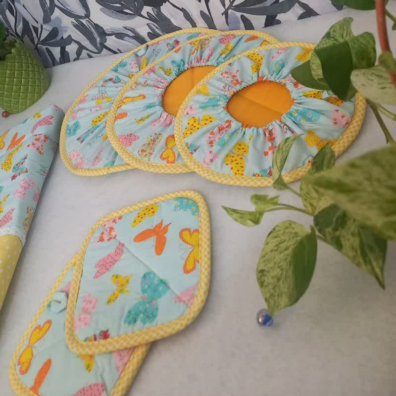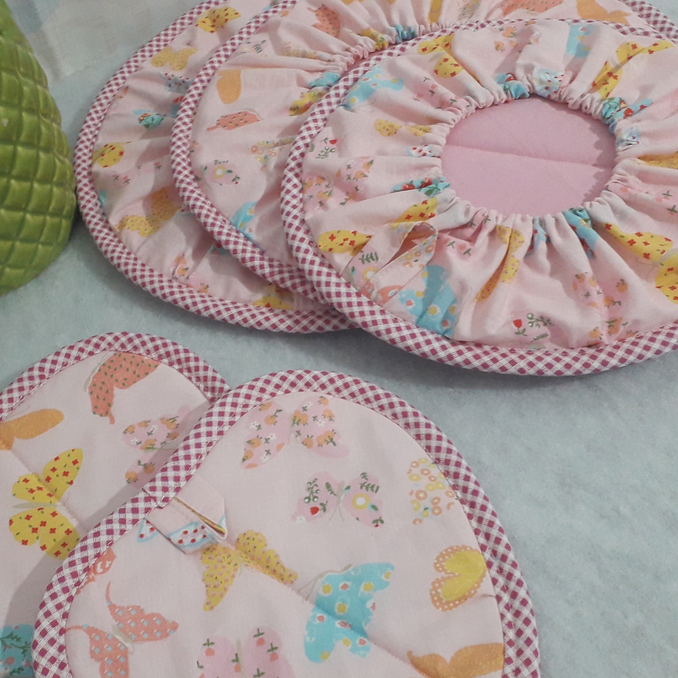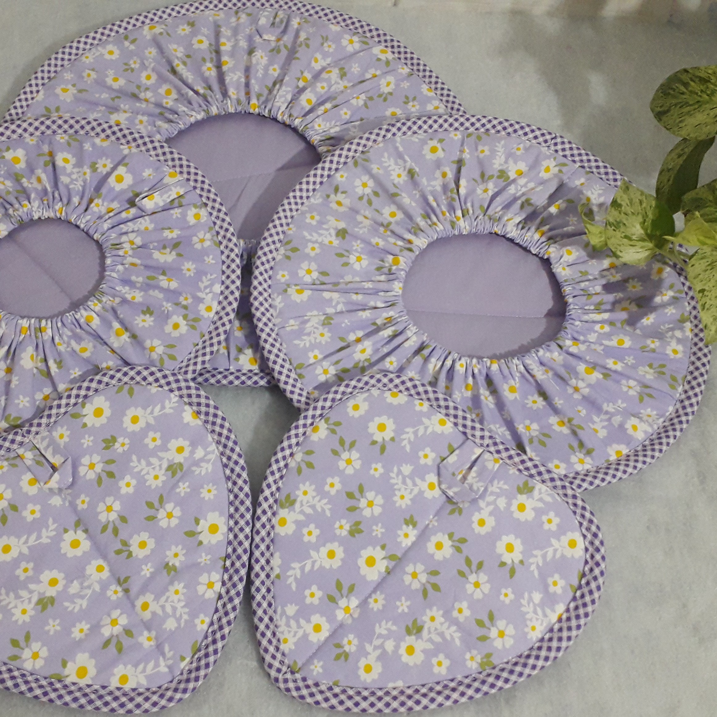 ست 5 تیکه ی دم کنی و دستگیره ی آشپزخانه در رنگهای متنوع با پارچه ی کتان و تمام نخ دوخته شده، دارای لایه ی پشم شیشه ی ضخیم و برای زیبایی و دوام بیشتر مطلسه دوزی شده. سایز دمکنی ها از 20 تا 34 قابل استفاده هست . شامل 3دمکنی و 2عدد دستگیره . لطفا برای انتخاب طرح و رنگ پارچه گفتگو کنید درغیر اینصورت رنگ و طرح به طور رندومی ارسال میگردد.