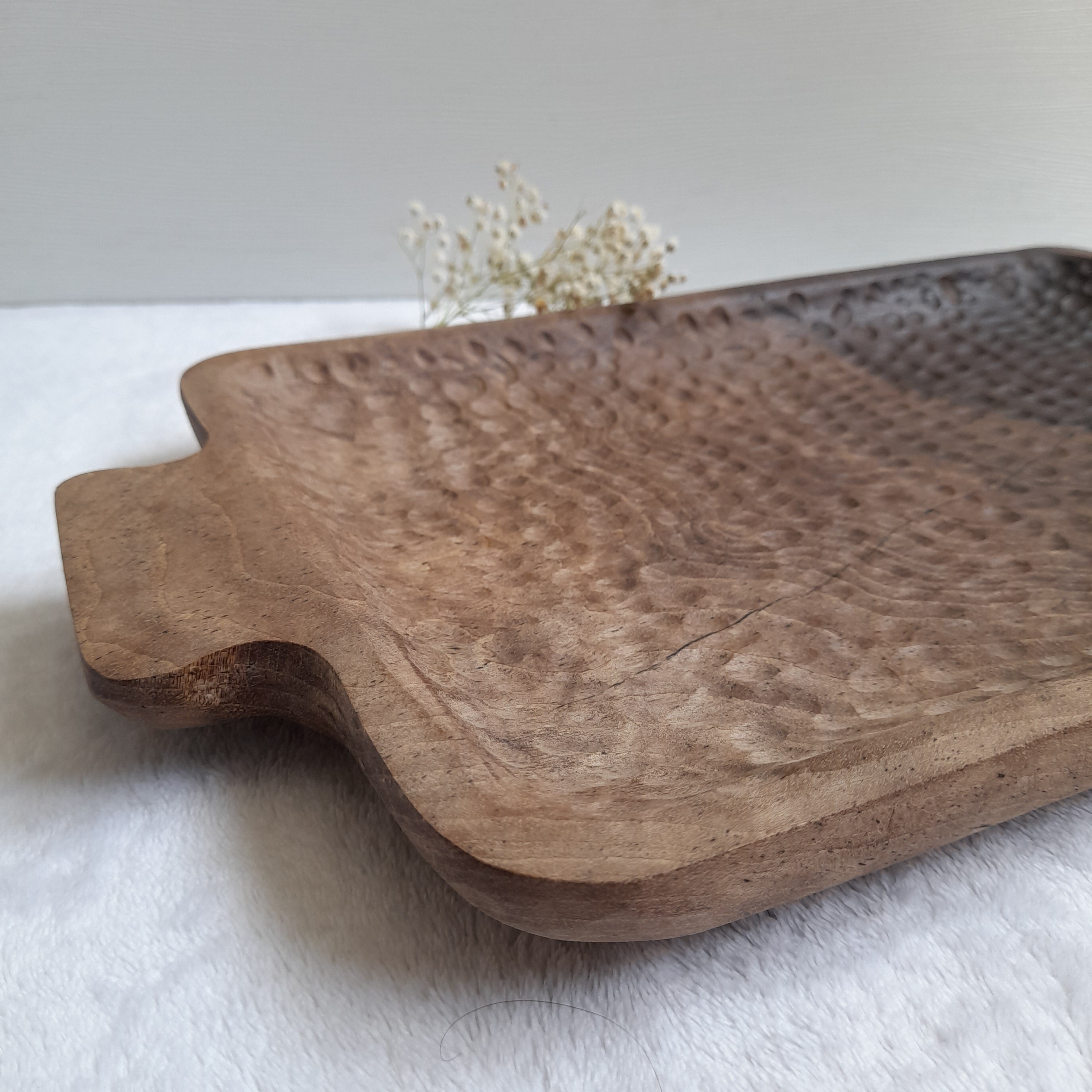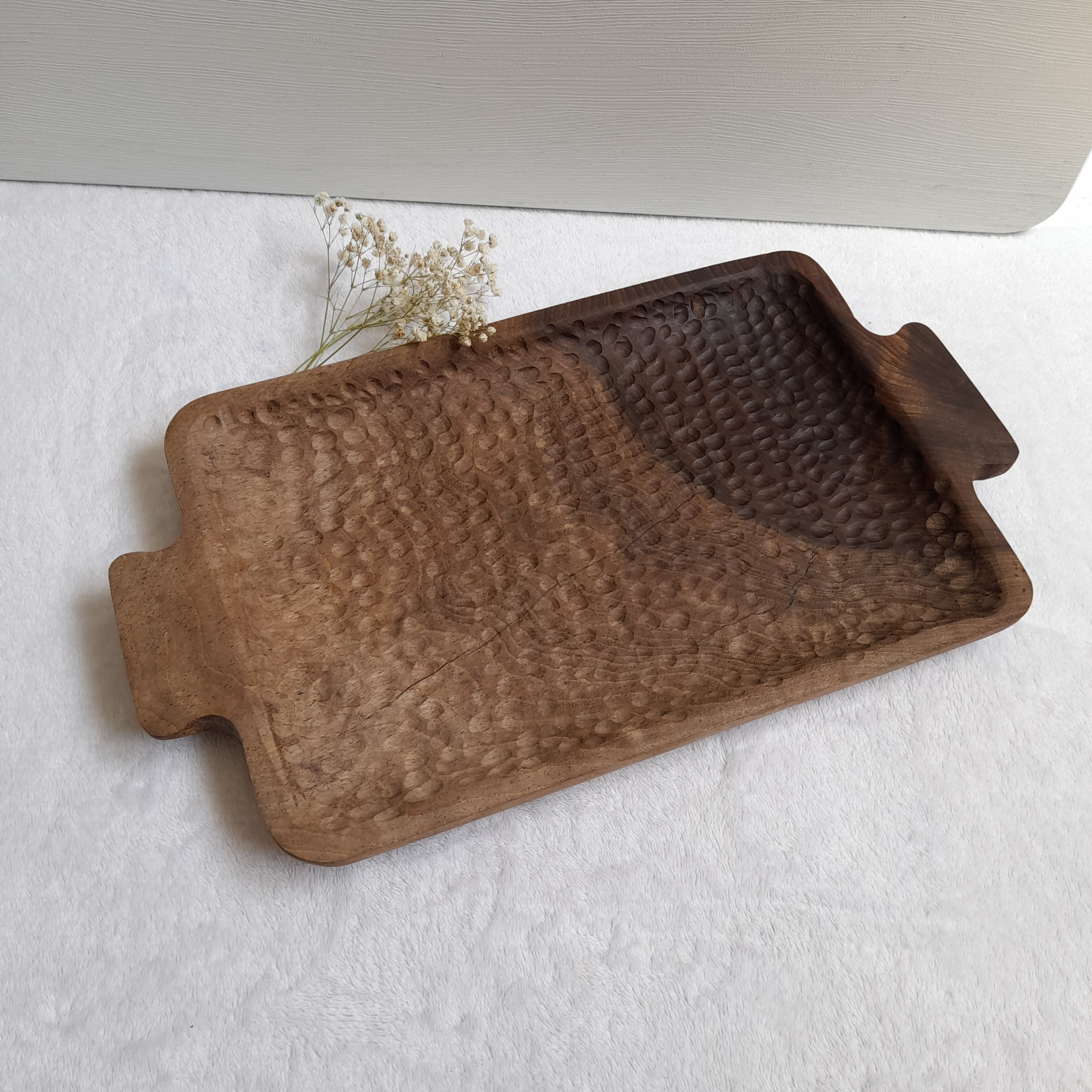 سینی چوبی طرح دار، ساخته شده از چوب زیبای گردو، کف سینی طرح نامنظم و دفرمه ایجاد شده، ترک وسط سینی با رزین پوشانده شده.
