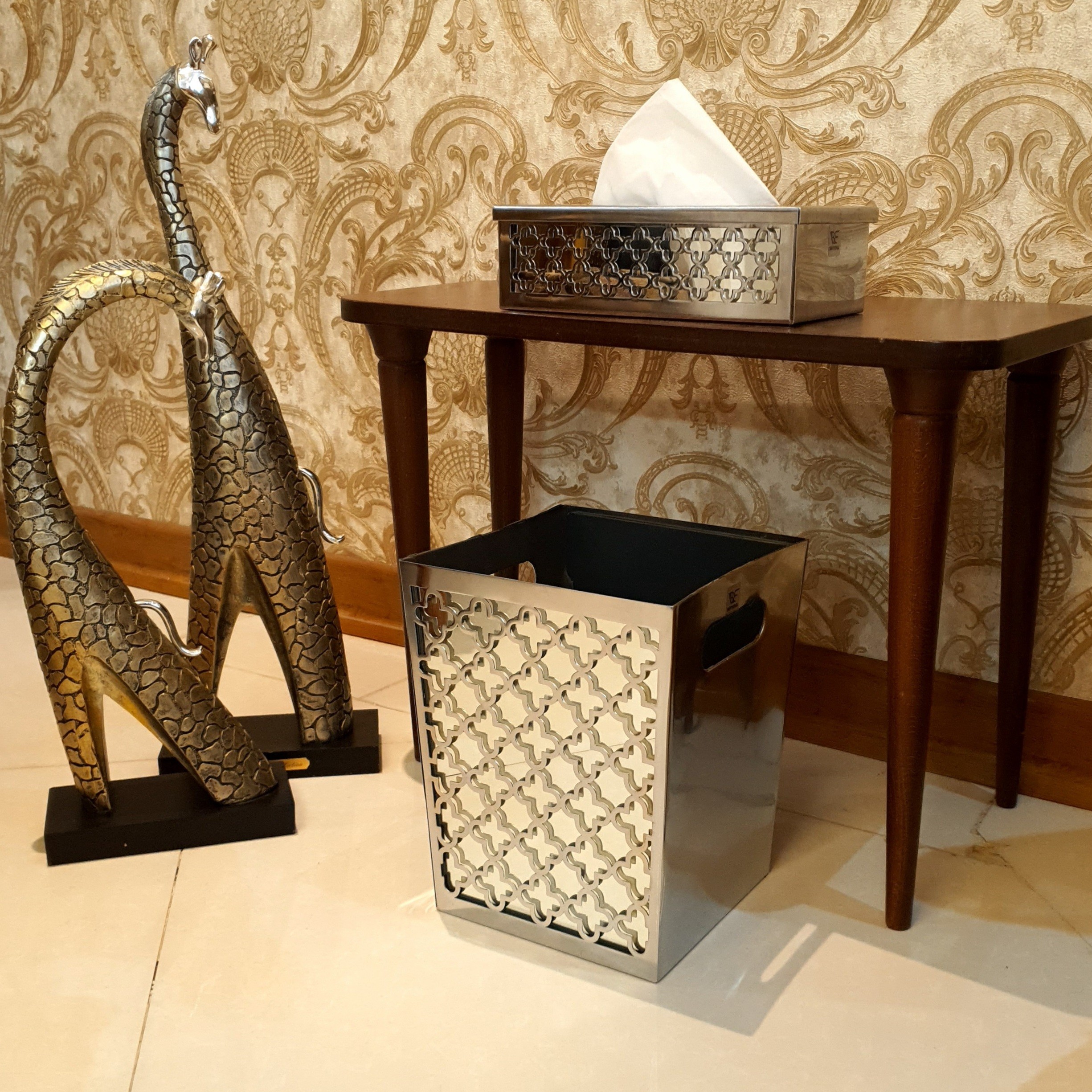 سطل و جعبه دستمال کاغذی فلزی و آینه برند برنوا مدل شکوفه رنگ نقره ای مبلمونسرا مدل 260244
