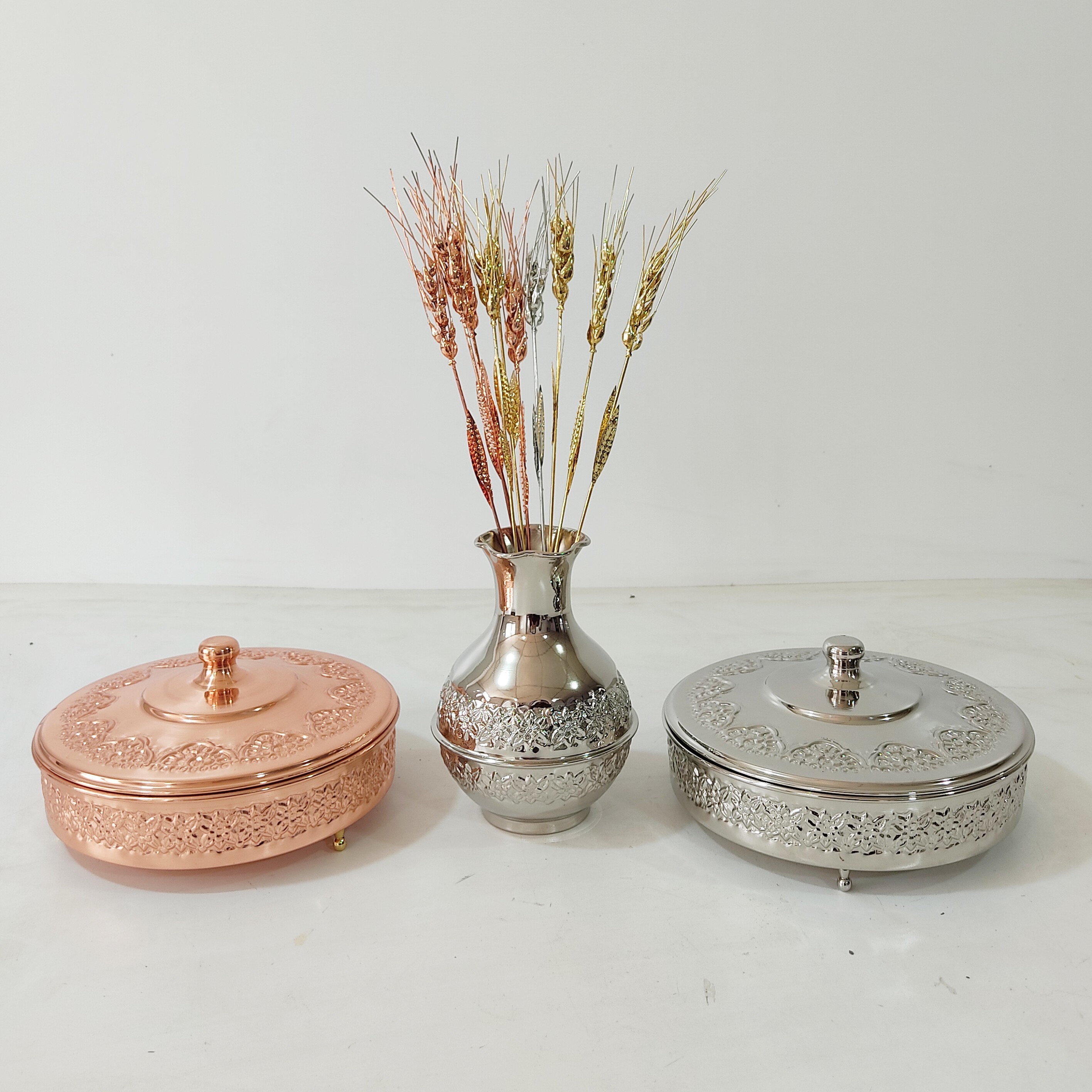 گز خوری یا تنقلات و شیرینی خوری مسی زنجان طرح برجسته کار شده رنگ ثابت در دار و مدل ۳ پایه بسیار شیک و درجه یک قطر دهانه ۲۰