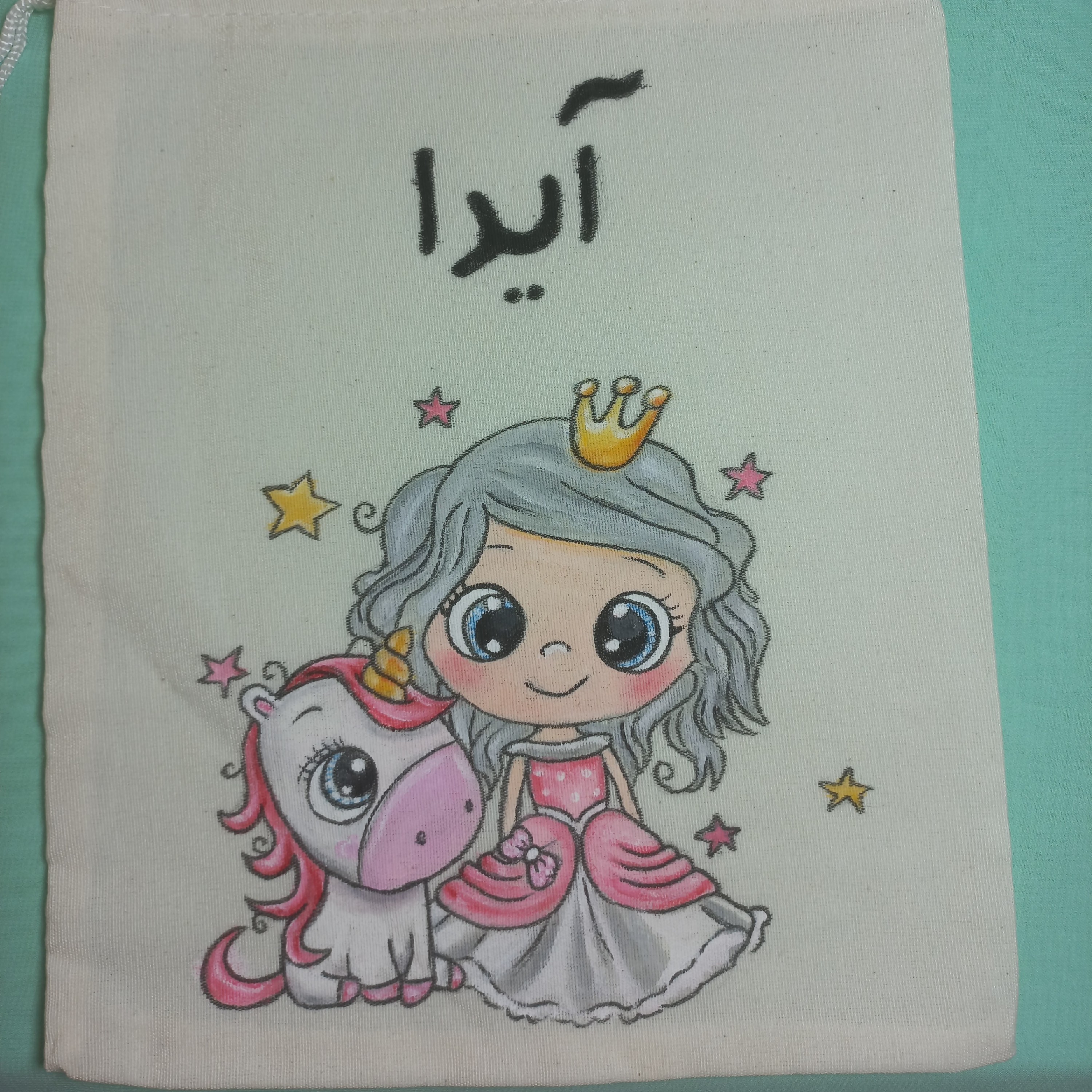 کیسه جمع شو نقاشی شده، جنس متقال با ابعاد ۲۰×۲۵ . دوستان نقاشی باطرح و اسم دلخواهتون انجام میشه و با سایز دلخواه