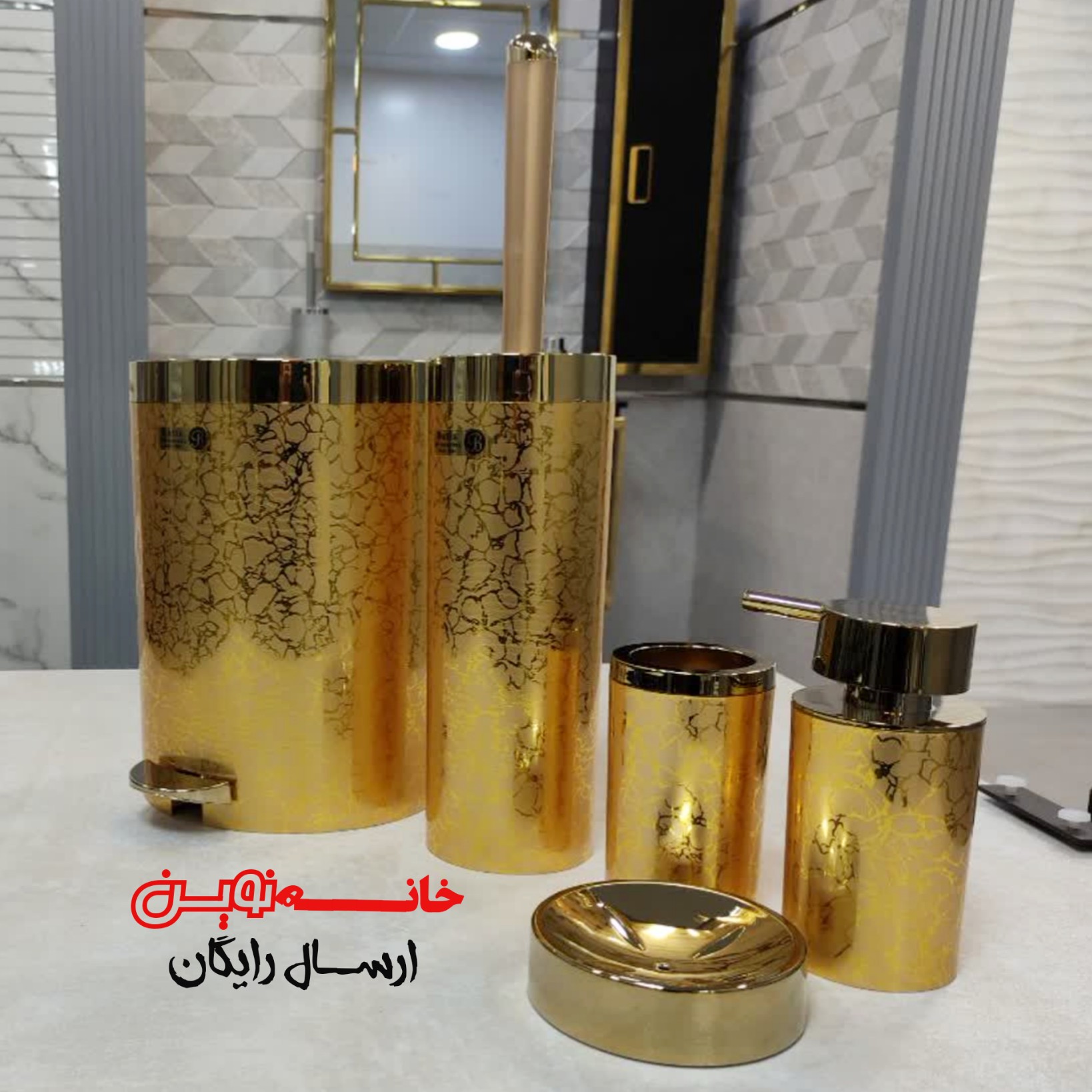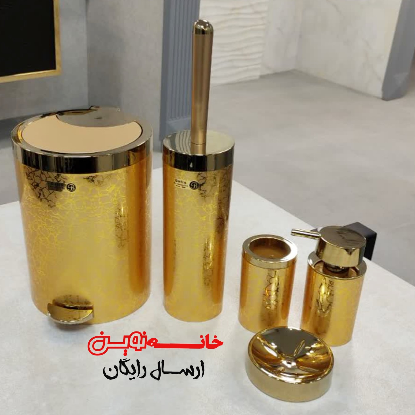 ست 5 پارچه سرویس بهداشتی بتیس مدل شاین رنگ طلایی براق درب دوحالته پدالی و بادبزنی مبلمونسرا مدل 266255