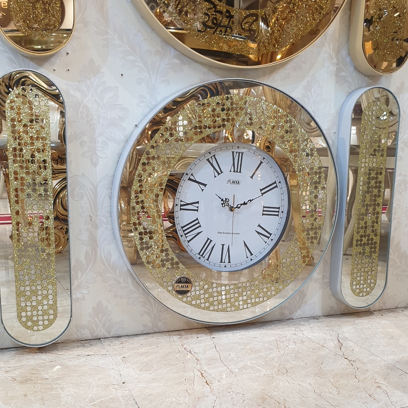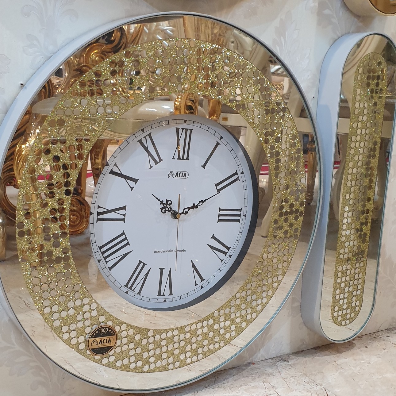 سفیدووطلایی ست پرفروش و اقتصادی 💰 قطر ۶۰سانت موتور تایوانی آرامگرد کارتن مادر یک عددی چوب های گلس نگین زیر شیشه با تراکم بالا آینه تمام تراش جنس آینه سوپر کلیر درجه یک صادراتی پشت جیوه نقره