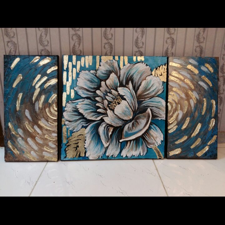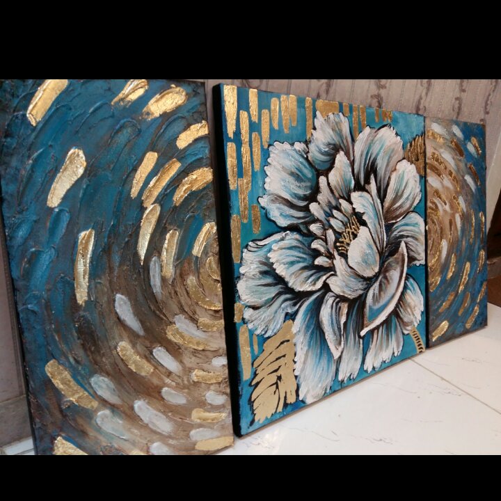 تابلو نقاشی کار دست.اجرا به صورت تمام برجسته با اکرولیک و تکسچر و ورقطلا روی بوم .سایز 120*60 .دو بوم 30*60 و یک بوم 60*60 .رنگ ثابت.ست دکوراسیون فیروزه ای و طلایی و کرمی .با قاب طلایی ✨ عزیزان اثر سفارشی و با عشق براتون اجرا میشه و قبل ارسال براتون عکس میفرستم.عزیزان به خاطر تلاشی که برای اجرای این اثر میشه و ذوق و احساس و اجرابا متریال عالی ،از عودت معذورم🖌️🎨💖