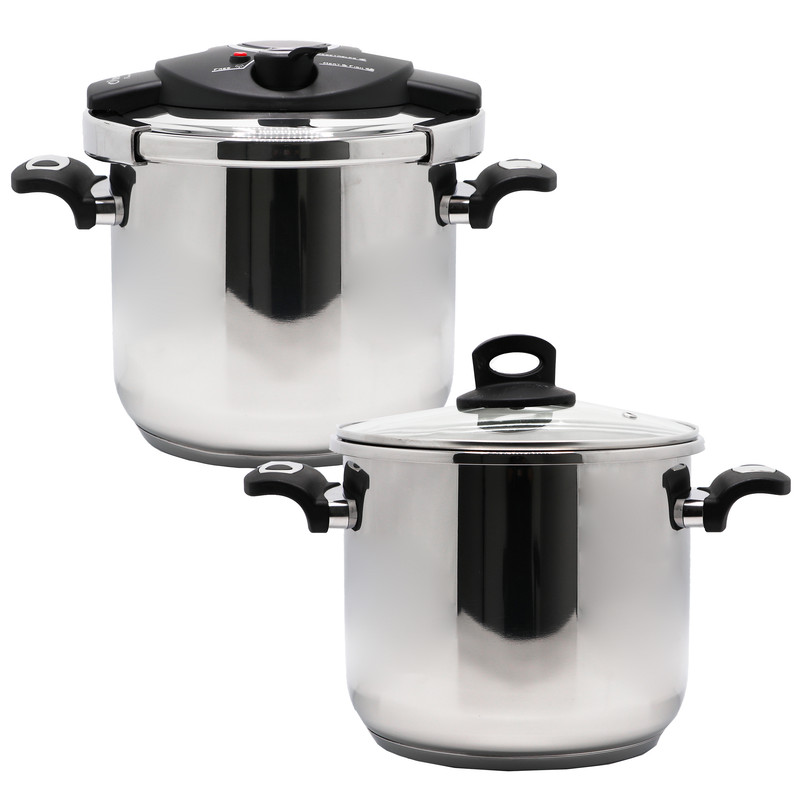 زودپز دوقلو (ساخت ترکیه) با داشتن 7 لیتر و همچنین داشتن دیگ دوم با 5 لیتر یک مجموعه بسیار عالی می باشد، چرا که هر دو دیگ را می توانید به عنوان زودپز استفاده کنید، به طوری که زمانی نیاز به دیگ 7 لیتری داشتید می توانید از درب زودپز استفاده کرده و همچنین از دیگ 5 لیتری با درب پیرکس به عنوان قابلمه معمولی جهت پخت و پز استفاده نمایید و یا بالعکس، دستگیره های از جنس باکالیت این زودپز در مقابل حرارت مقاومت خوبی داشته و با داشتن دستگیره های تاشو عنوان زودپزی منحصر به فرد را یدک می کشد، سیستم امنیتی این زوپز نیز با داشتن دو سوپاپ اطمینان، امنیت بالا و راحتی شما را فراهم می کند، به طوری که سوپاپ اطمینان آن در صورت افزایش بیش از حد بخار در داخل زودپز فعال شده و در مواقع اضطراری بخار را خارج خواهد نمود. دیگر سیستم امنیتی این زودپز تا زمان خارج شدن بخار امکان باز کردن درب را نخواهد داد از اینرو از سوختگی ناگهانی دست جلوگیری خواهد نمود. این زودپز با داشتن 3 درجه، زودپز مخصوص گوشت و ماهی و ...، آرام پز جهت سبزیجات و ... و همچنین Free به صورت بخار پز یا کم فشار قابل استفاده می باشد. سیستم قفل این زودپز بسیار ساده عمل خواهد کرد به طوری که می توان با یک دست و انگشت درب آنرا باز و با فشردن دکمه بزرگ گرد وسط زودپز آنرا قفل نمود. کفه هر دو دیگ زودپز به صورت کپسولیت طراحی شده و با داشتن قطر بسیار زیاد، امکان پخش و نگهداری حرارت را خواهد داشت.