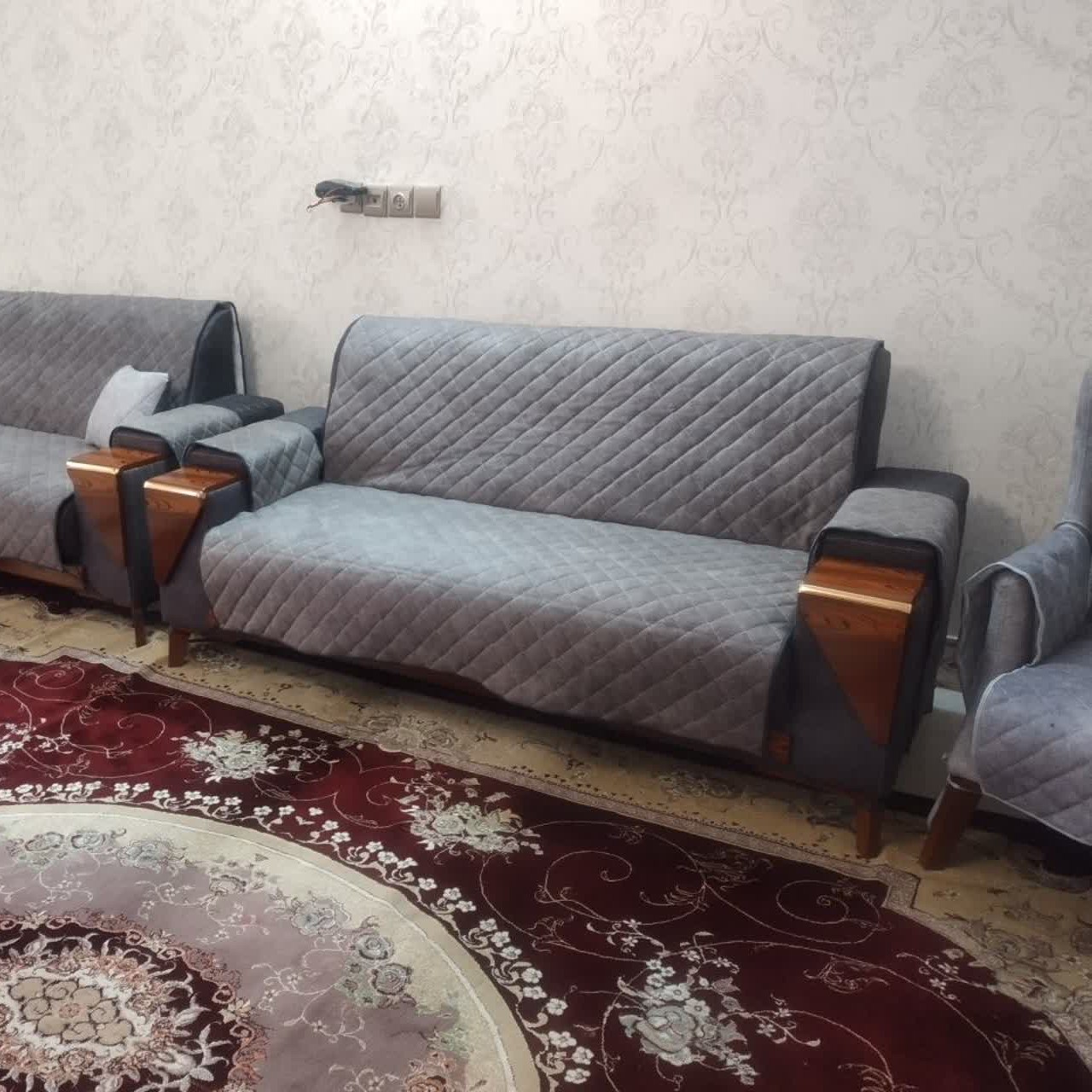 طرح نیم کاور مبل با پارچه مطلسه سه لایه که لایه اول پارچه مبلی و لایه دوم پشم شیشه و لایه سوم تترون هست کیفیت بالایی داره کارایی خیلی خوبی داره مبل کامل پوشیده نمیشه و زیبایی منزلتون دو چندان میشه ....... قابل سفارش در رنگ دلخواه مشتری گرامی و ارسال برای سراسر کشور ....... میتونید خودتون اندازه مبلتون بگیرین و برام بفرستین تا براتون آماده کنم