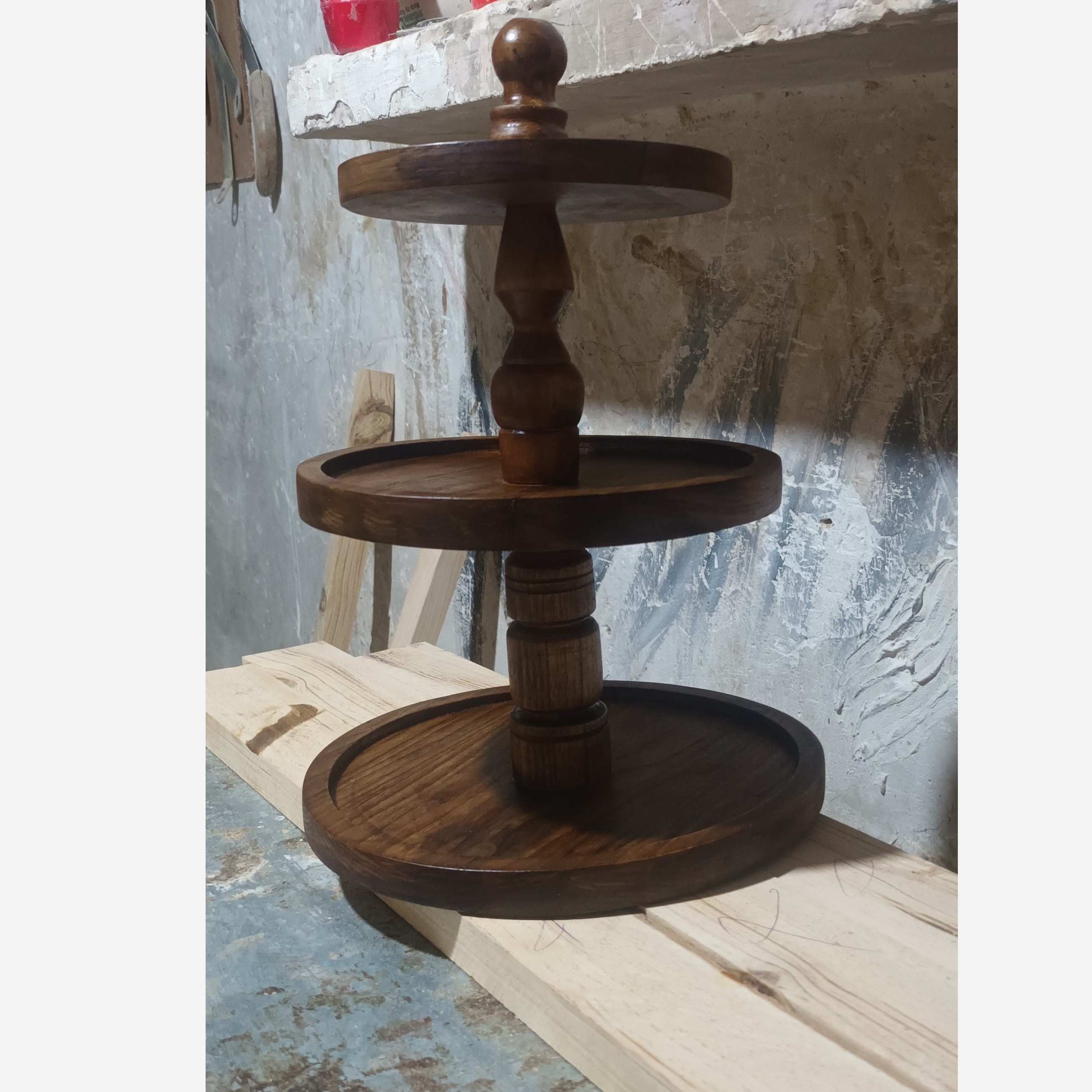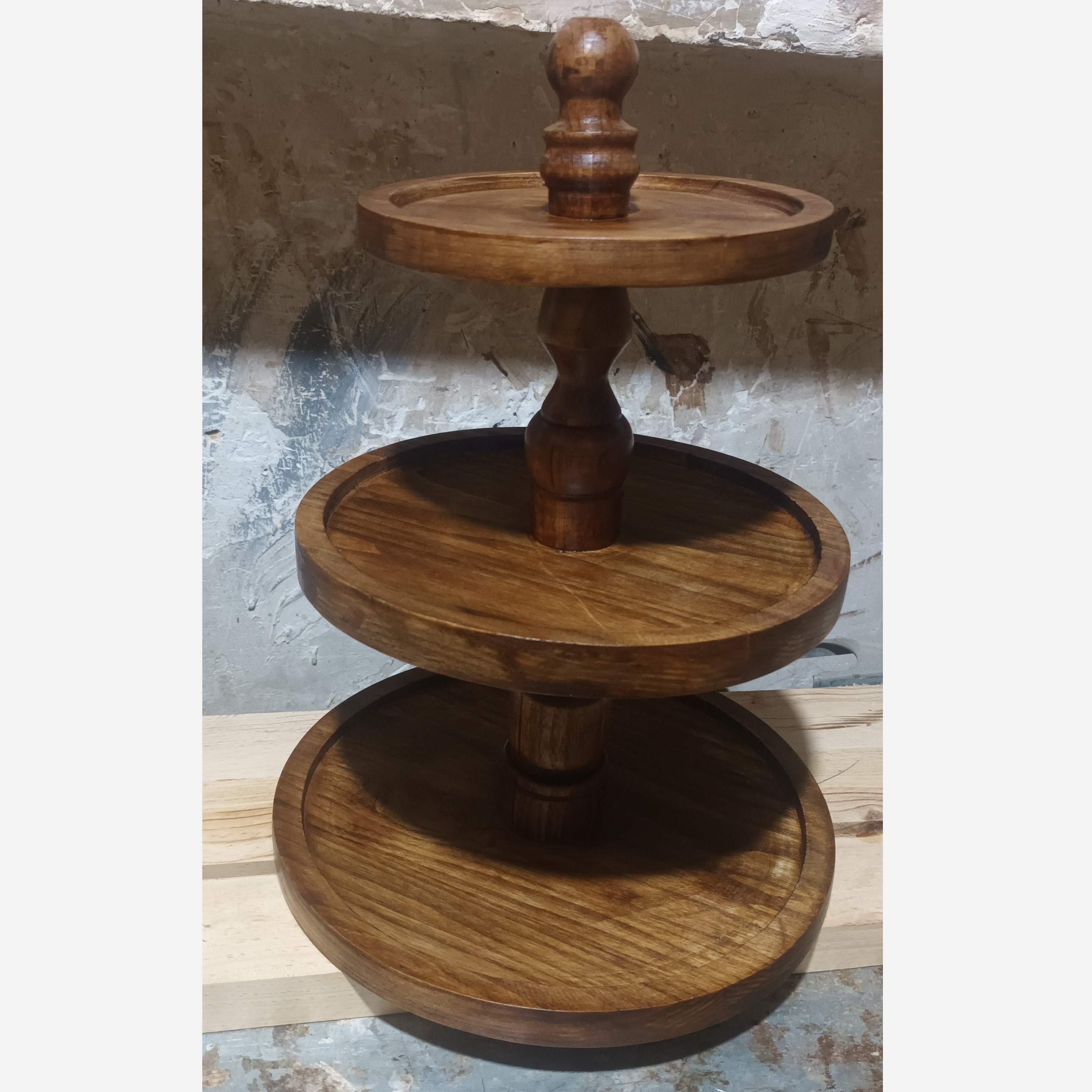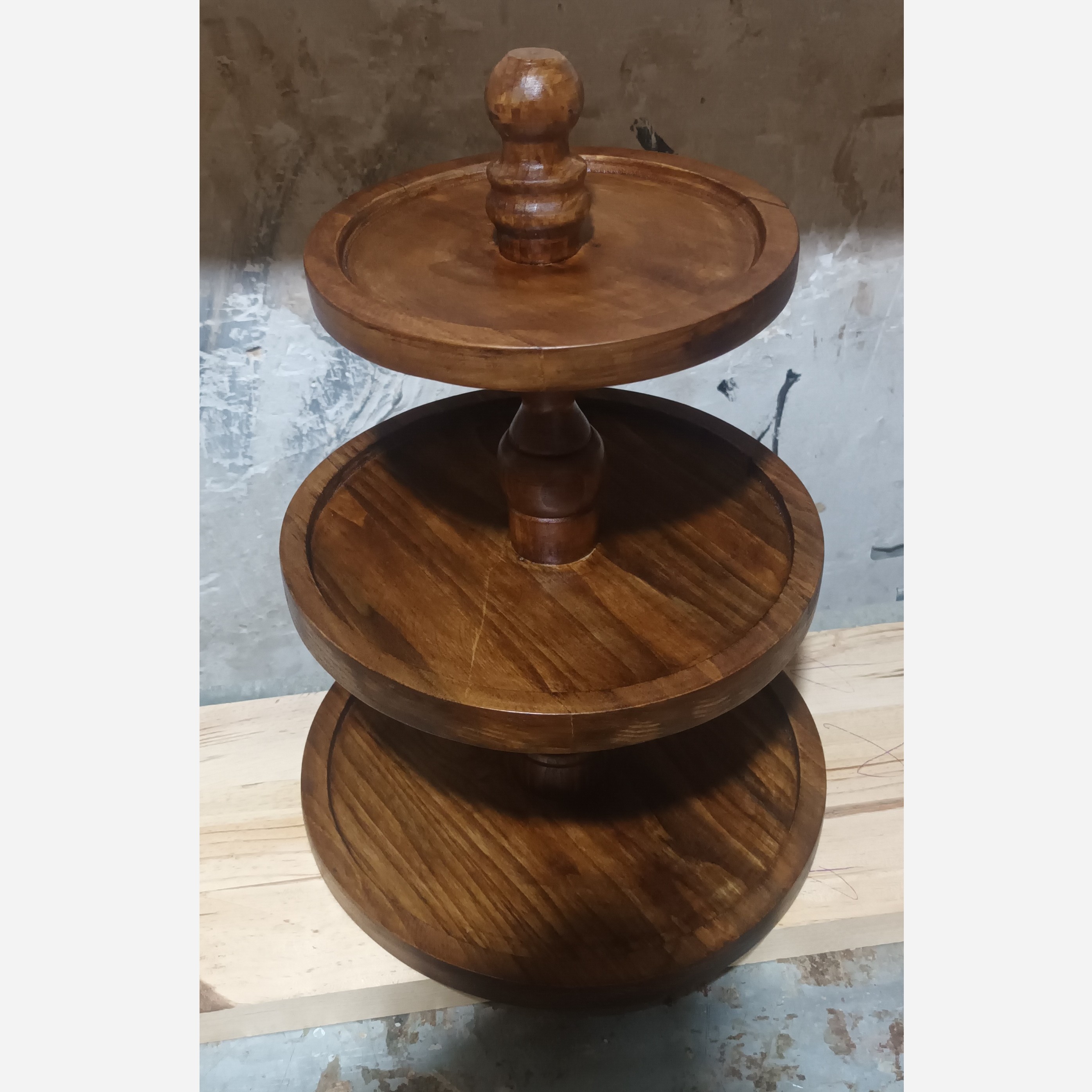 ظرف پذیرایی چوبی سه طبقه طبقات گرد اتصالات میانی خراطی شده بسیار شیک و کاربردی مناسب چیدمان میز و شیرینی خوری میوه خوری حتی فینگرفود و بسیاری خوراکی های گرم و سرد قابل شستشو با آب به صورت دستی و پس از آن با دستمال نخی خشک شود هر از چند گاهی با روغن های گیاهی خوراکی مثل زیتون روغن کاری سطحی شوند باعث دوام و طول عمر محصول میشود و از خاصیت آبگریزی آن کاسته نمیشود طرح و نقش محصول امکان تغییر دارد چون این کار یک محصول چوبی طبیعی است پرداخت کاری بسیار عالی کاملا سنگین و مقاوم