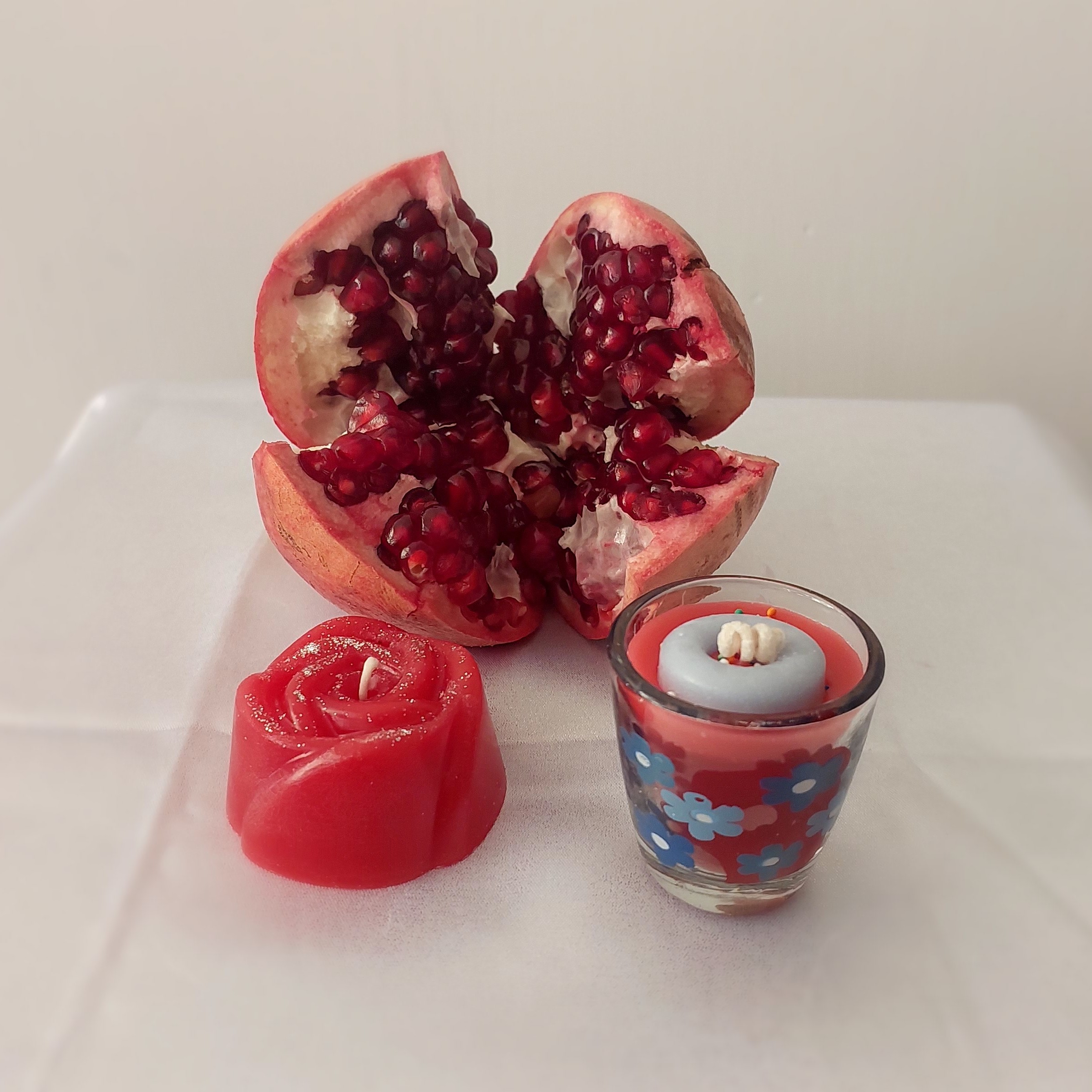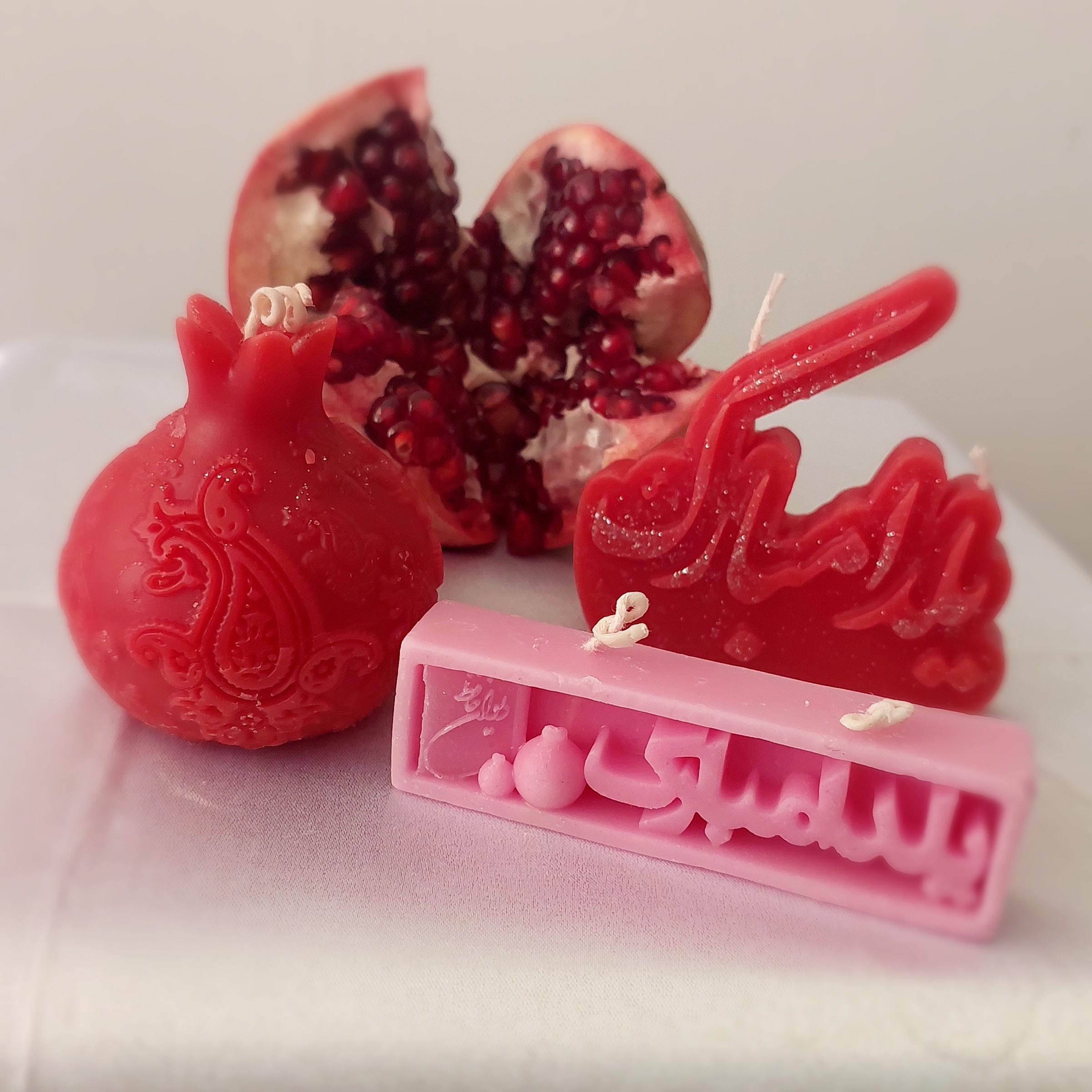 پک شمع های یلدایی،شامل ،انار،یلدامبارک،شمع لیوانی کوچک، گل رز، در بسته بندی شیک وتمیز