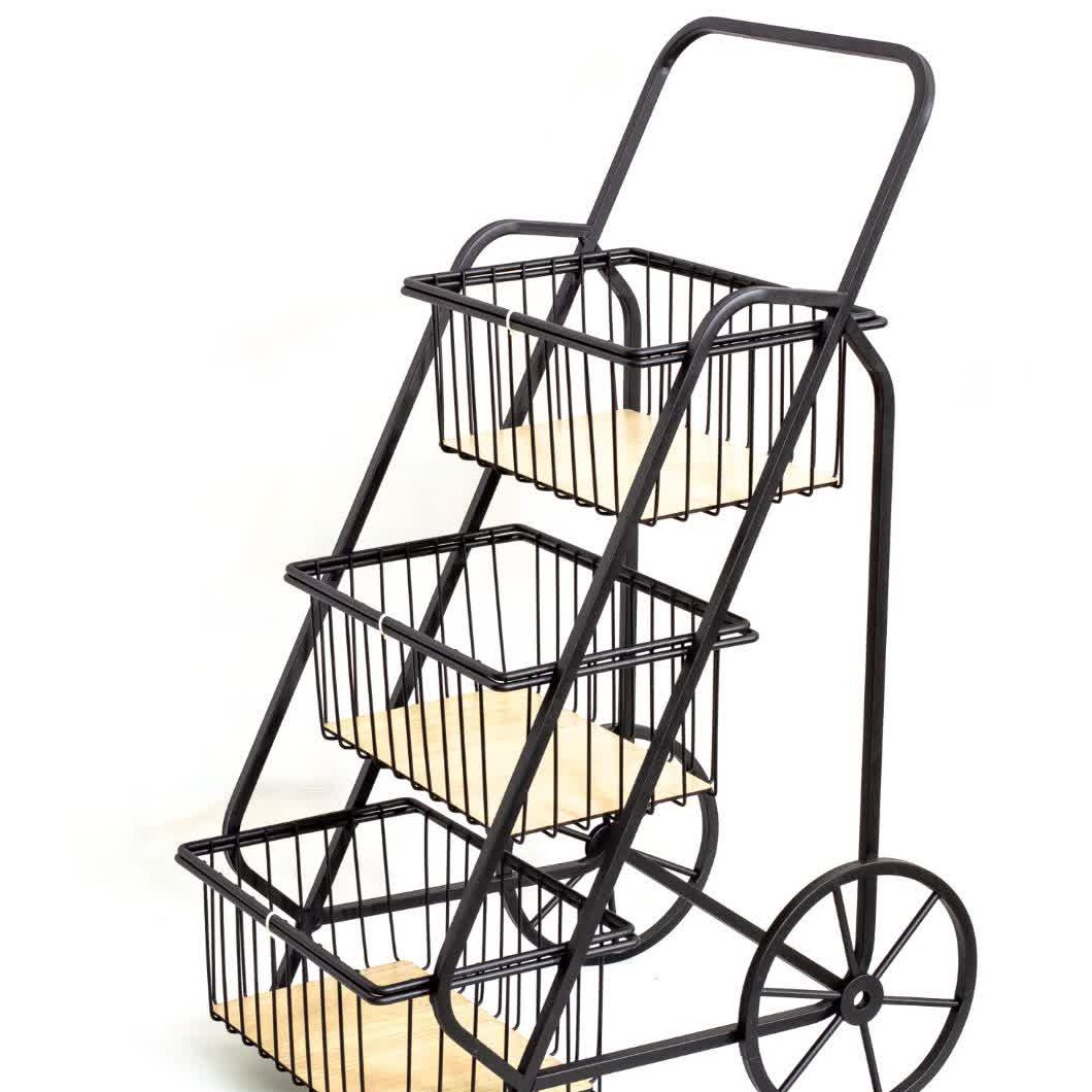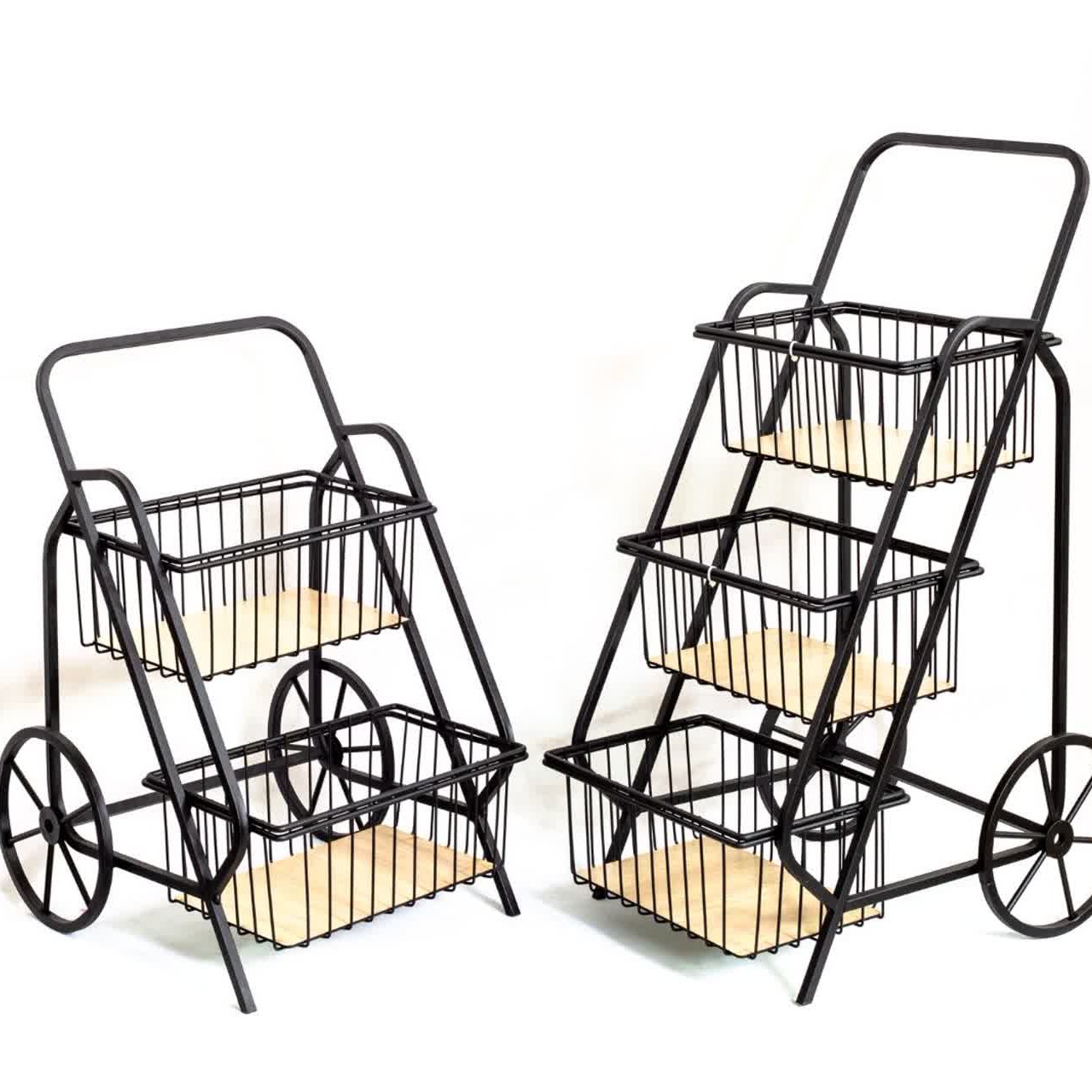 سبد سیب زمینی و پیاز طرح کالسکه بدنه فلزی سبد کفی دار چوبی سه طبقه مناسب هر چیدمانی سایز قوطی فلزی ده در ده فریم سبد مفتول ۶ توری سبد ۲.۵ جوش ادغامی CO2 +نگ نقطه جوش رنگ الکترو استاتیک ثابت قابل شستشو وزن سه طبقه ۳.۹۰۰ گرم