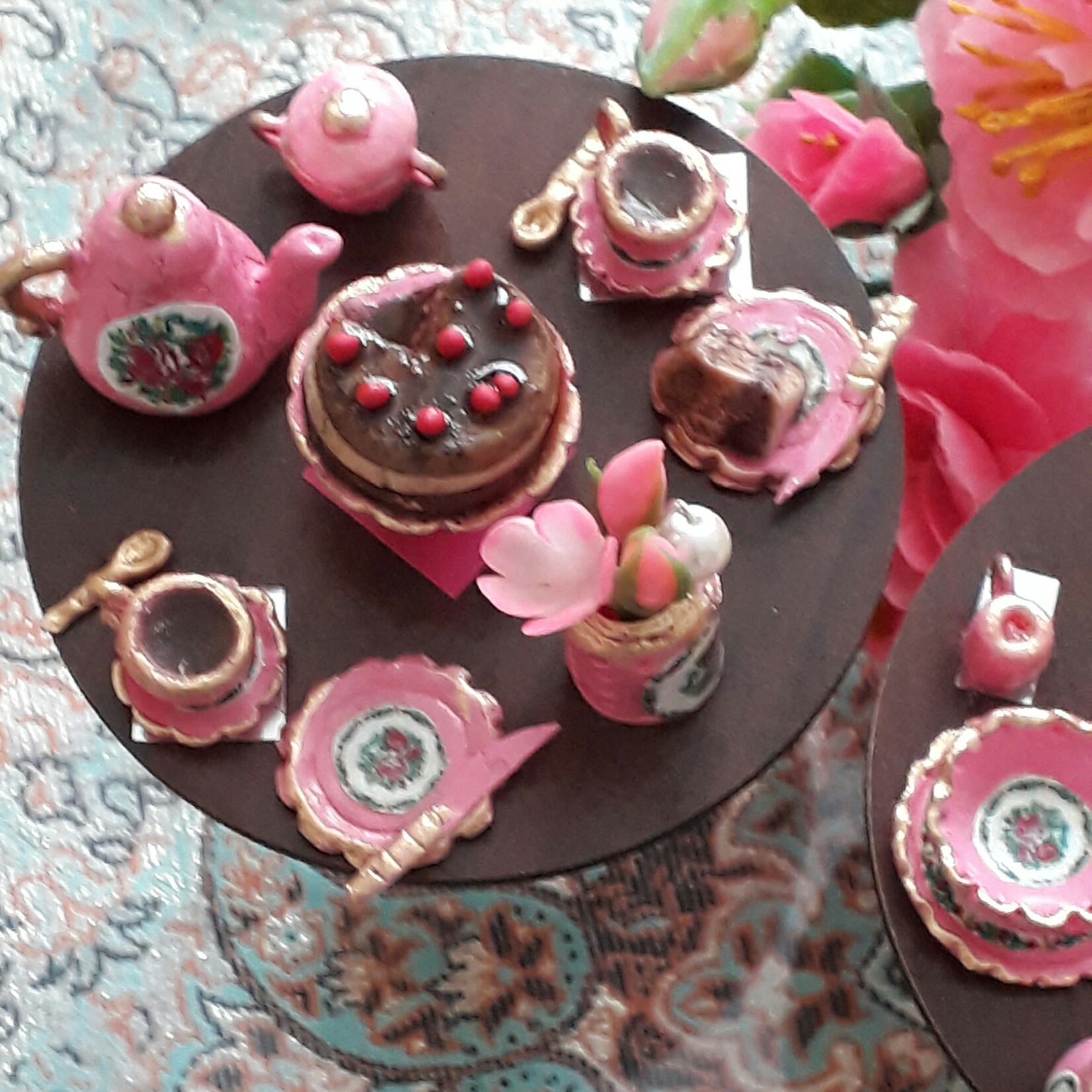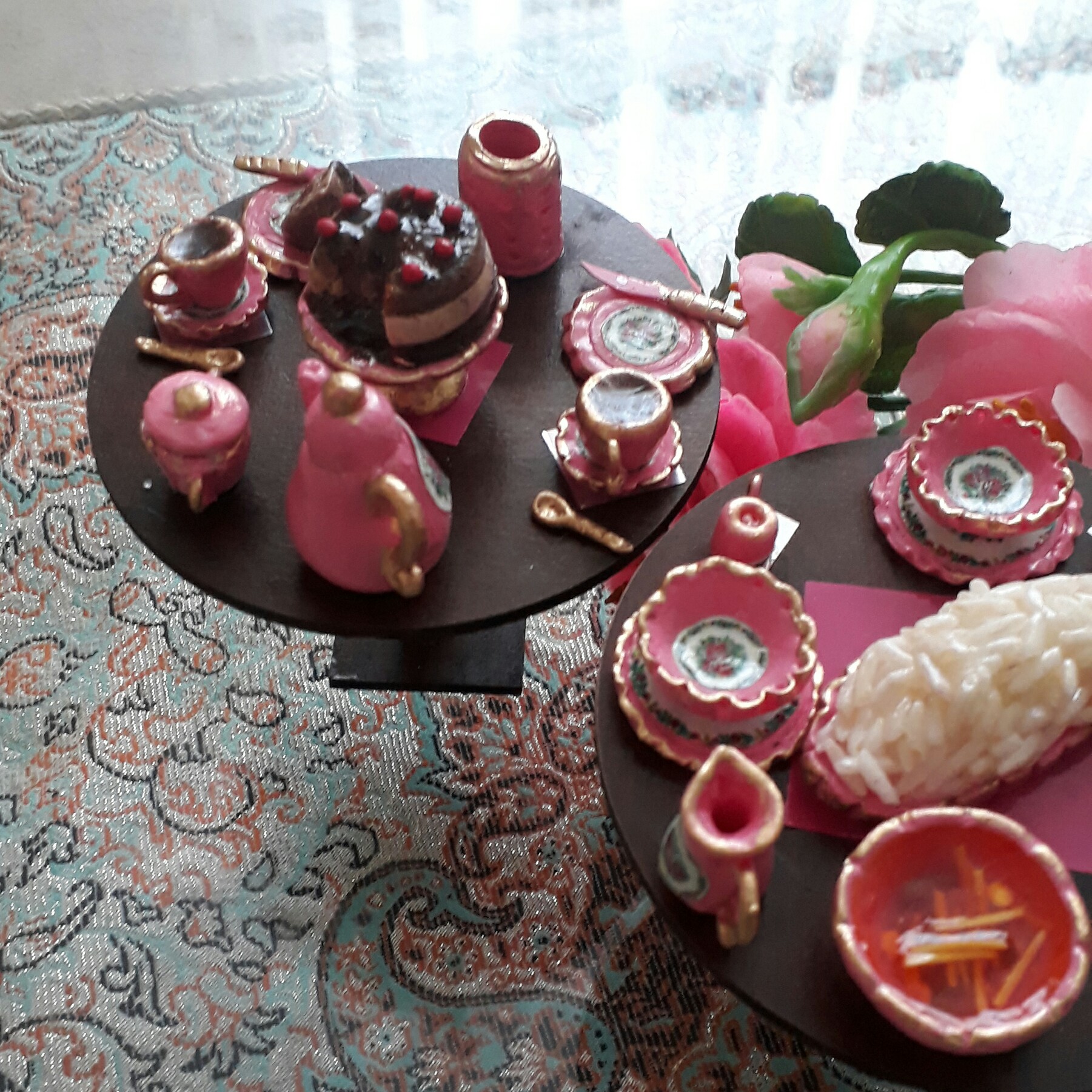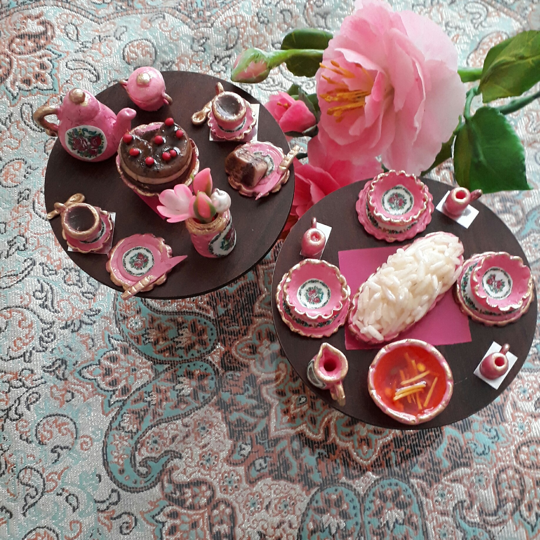 دوعدد میز گرد به همراه وسایل عصرونه کیک و قهوه و بشقاب کیک خوری چاقو و قاشق و میز نهار به همراه غذا و بشقاب و پارچ مبلمونسرا مدل 217263