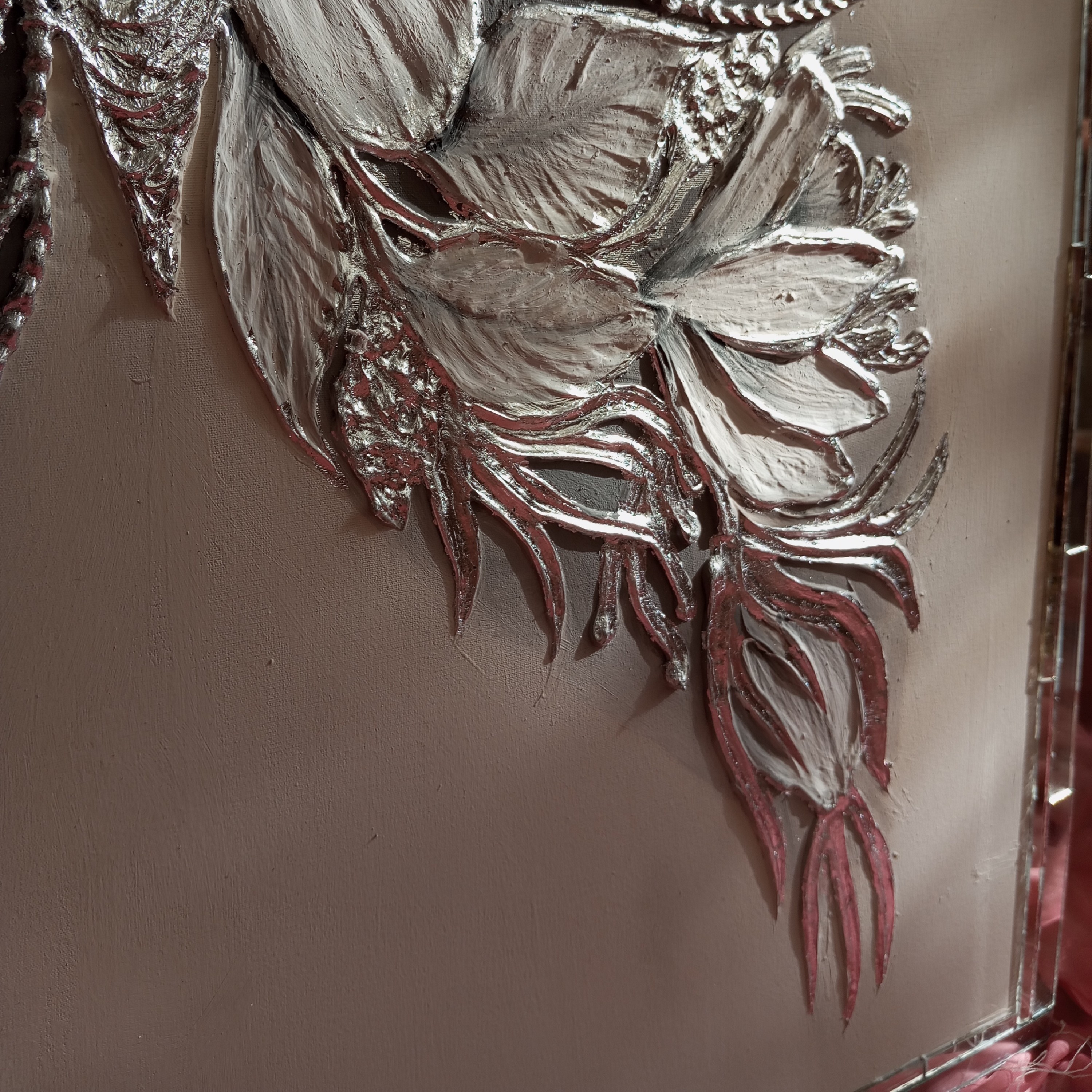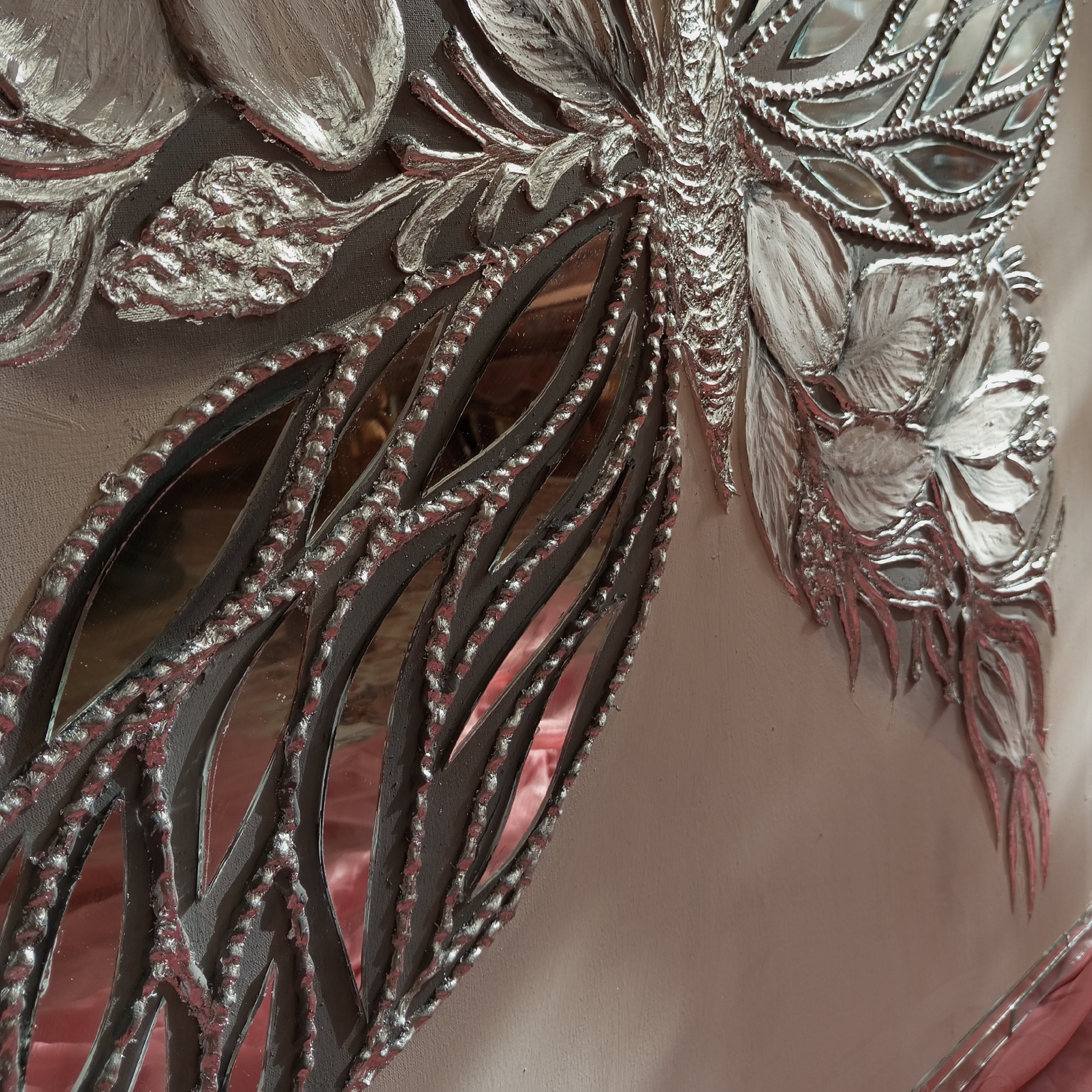 تابلو نقاشی پروانه تماما برجسته شده با خمیر تکسچر سرامیک و نقره کوب شده آینه کاری شده با آینه های دومیل پست نقره ابعاد 70 در 70 با قابنما آینه کاری اجرا شده روی بوم نقاشی درجه یک کانواس با زوار چوب اجرا شده