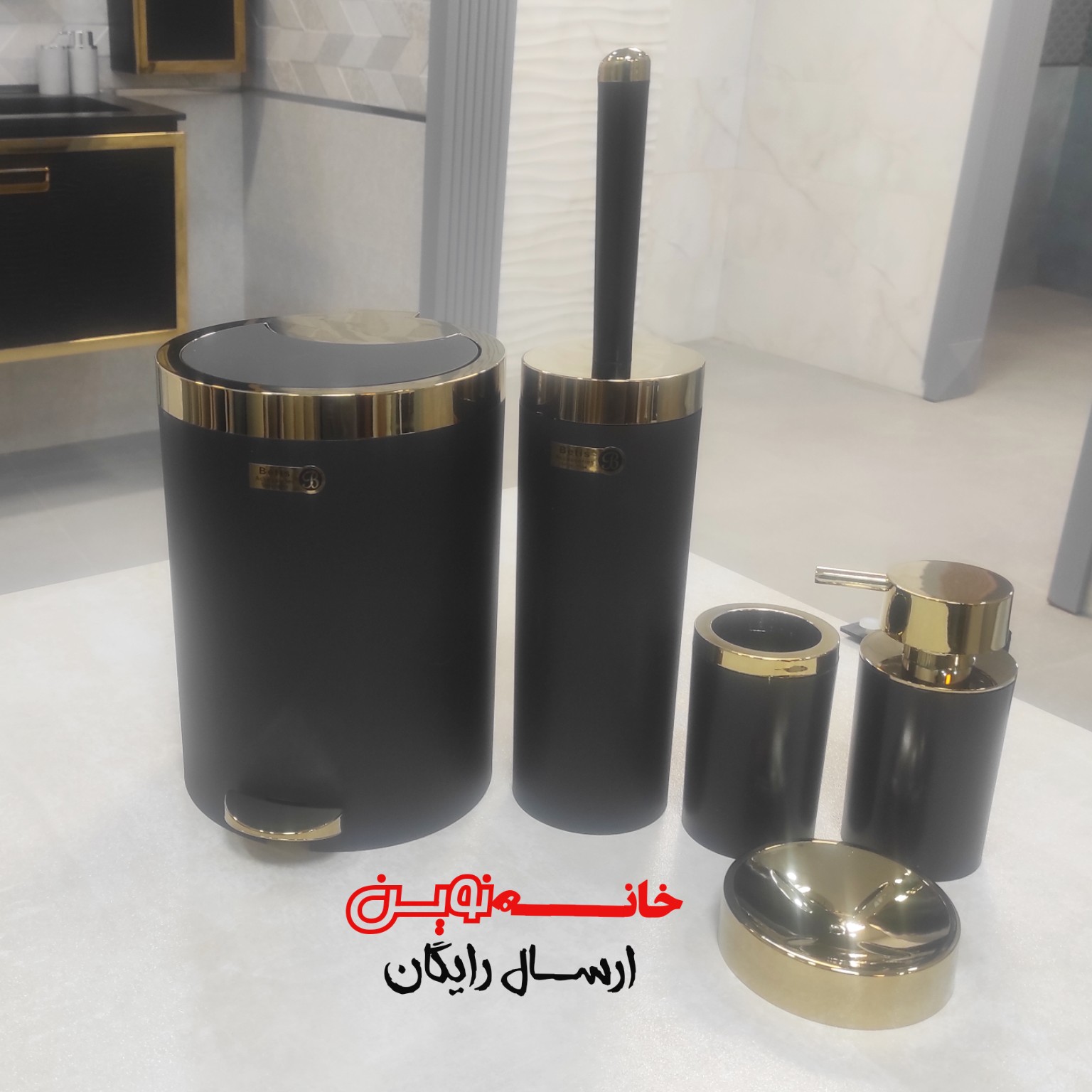 ست 5 پارچه سرویس بهداشتی بتیس مدل شاین رنگ مشکی طلایب درب دوحالته پدالی و بادبزنی مبلمونسرا مدل 265942