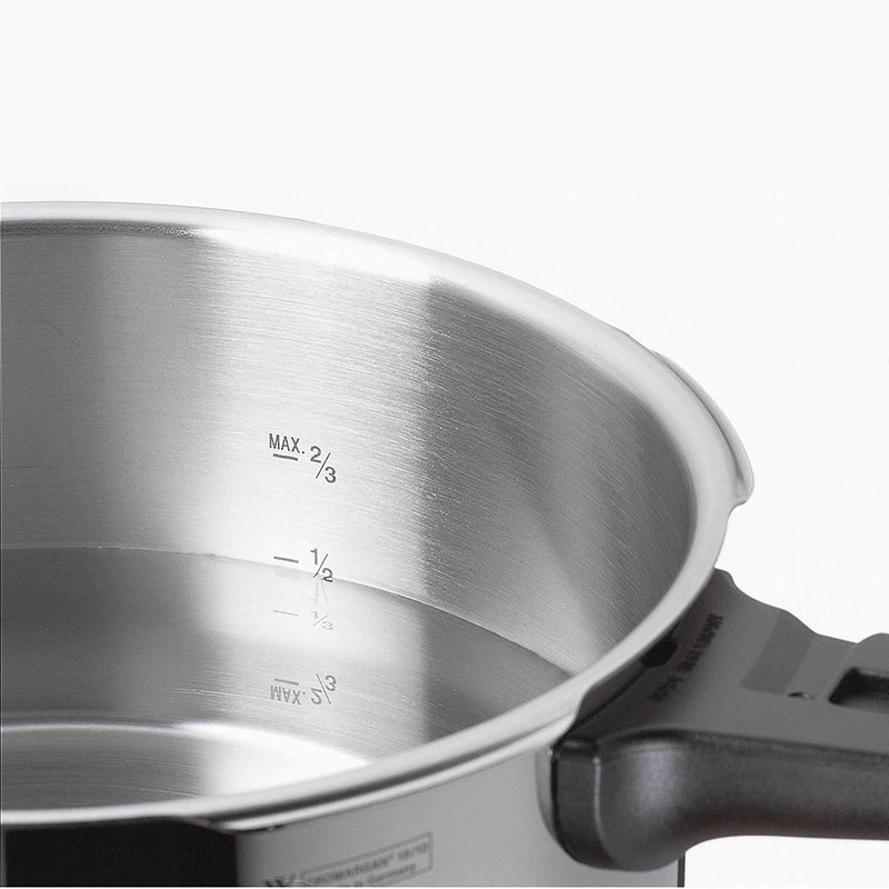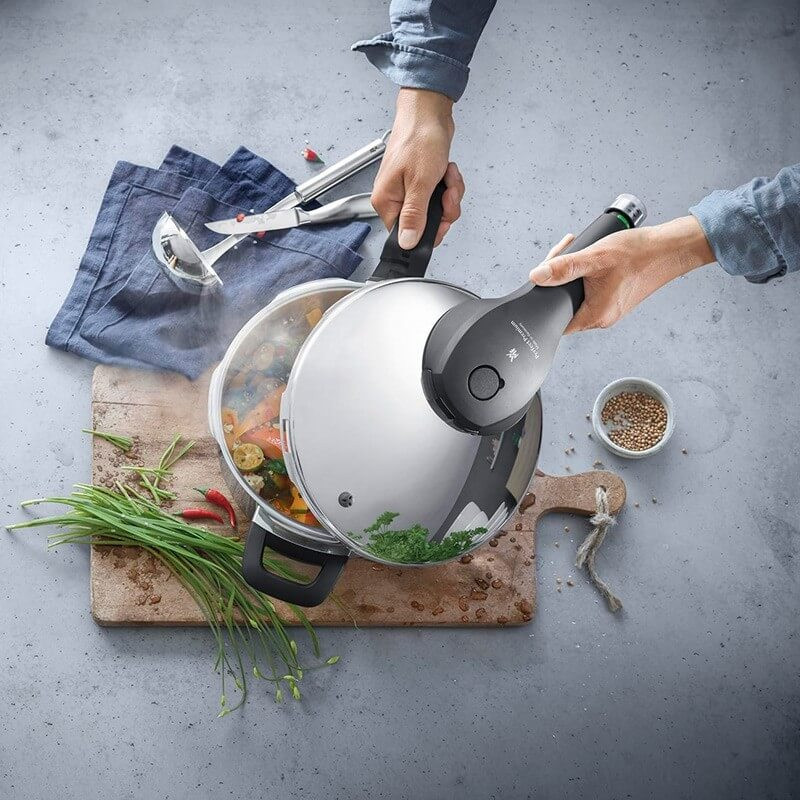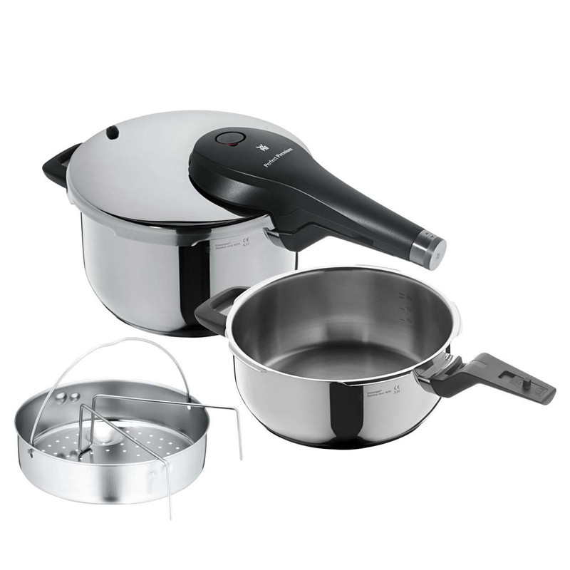 زودپز دوقلو WMF مدل WMF PERFECT PREMIUM Pressure Cooker & Basket 4,5L + 3L خروج خودکار بخار و ایمنی فشار باقی مانده برای باز شدن درب را فراهم می کند . این سرویس شامل یک زودپز 3 لیتر و یک زودپز 4.5 لیتر و یک دسته همراه درب مشترک می باشد که داخل زودپز مقیاس اندازه گیری درج شده است تا آشپزی را راحت کند . نشانگر سازگاری با 2 کد رنگی برای تنظیم پخت و پز (110 درجه سانتیگراد/119 درجه سانتی گراد) . دسته درب قابل جدا شدن جهت نظافت ساده است . جنس فولاد ضد زنگ Cromargan ضد زنگ 18/10 قابل شستشو در ماشین ظرفشویی ، تمیز کردن آسان ، ایمن در فر ، بی مزه ( مزه غذا در این قابلمه ها تغییر نمی کند ) و مقاوم در برابر اسید غذایی می باشد . تهیه غذا در زودپز مدرن ، سریع و سالم است . فشار شدید و دمای بالا ، زمان پخت معمولی را تا 70 درصد کوتاه می کند . با صرفه جویی همزمان انرژی در حدود 50 درصد از ویتامین ها ، مواد مغذی و مواد معدنی تا حد زیادی با پخت ملایم حفظ می شوند و غذاها مقوی و خوشمزه هستند . قابلمه های پرسرعت تقریباً برای تهیه همه غذاها و سبزیجات ، گوشت و ماهی ، غلات و حبوبات ، سوپ ها و خورش ها مناسب هستند . طراحی کلاسیک آن جاودانه است و عملکرد آن همیشه با جدیدترین فناوری مطابقت دارد .
