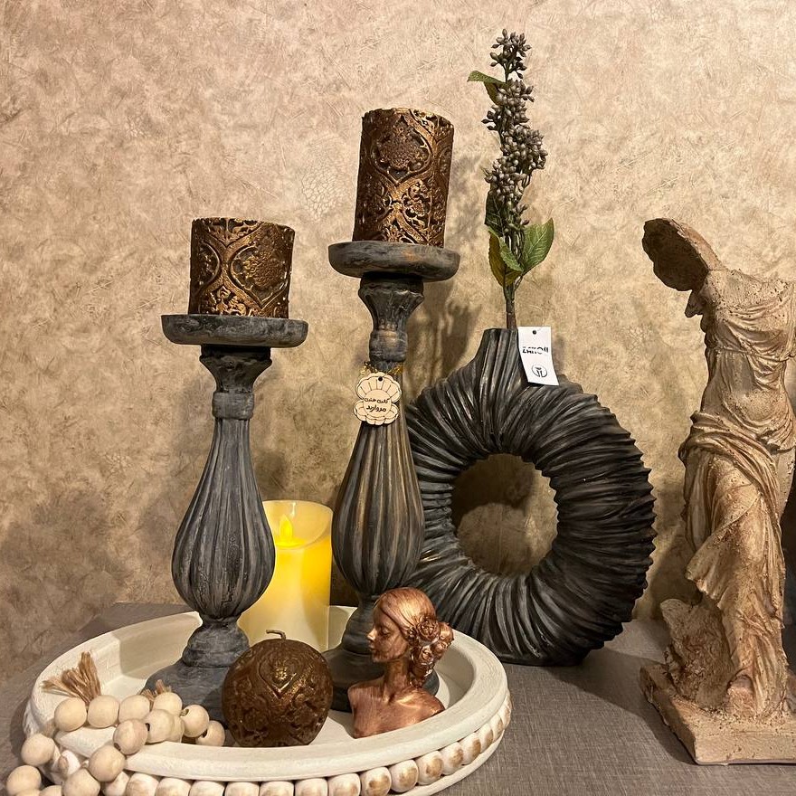 شمعدان پلی استر پتینه شده ست دوتایی ارتفاع سی و سه و بیست و هفت سانت قابل اجرا در رنگ و پتینه دلخواه مبلمونسرا مدل 284040