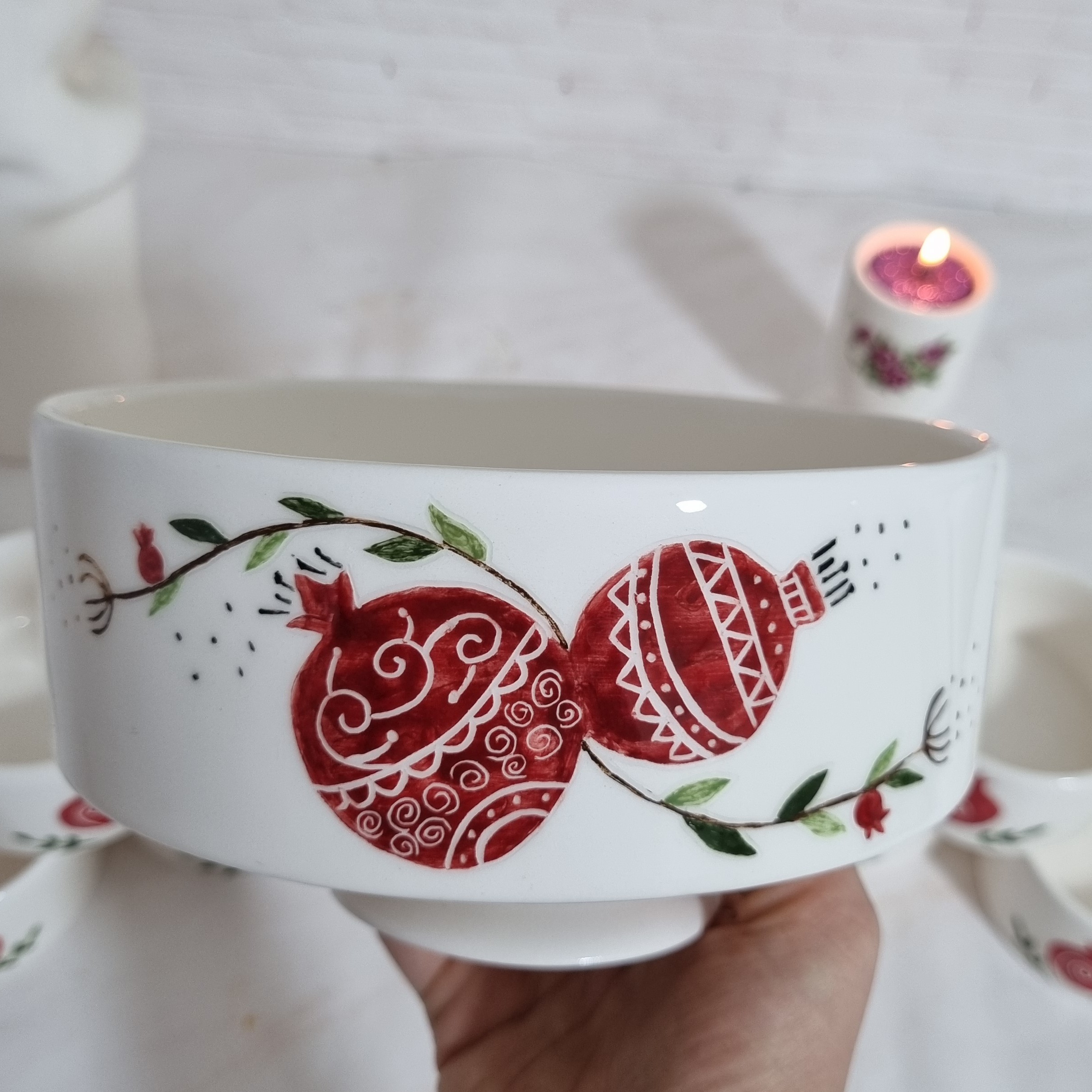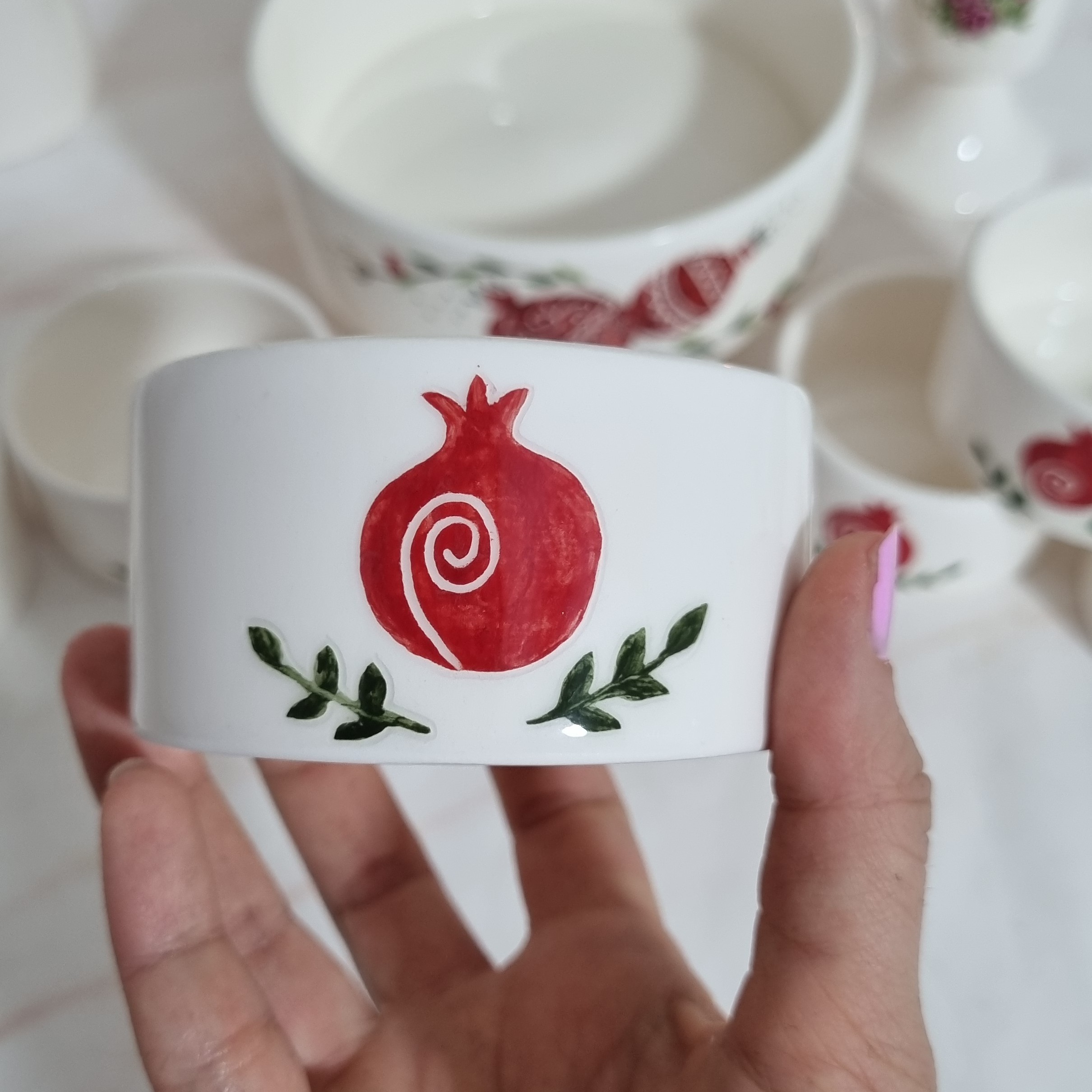 ظروف یلدایی بسیار شیک و کاربردی تماما نقاشی شده با دست رنگ ثابت قابل استفاده در ماشین ظرفشویی قطر کاسه بزرگ پایه دار 16 سانت قطر کاسه های کوچک 8 سانت لطفا به اندازه های ظرف دقت کنید