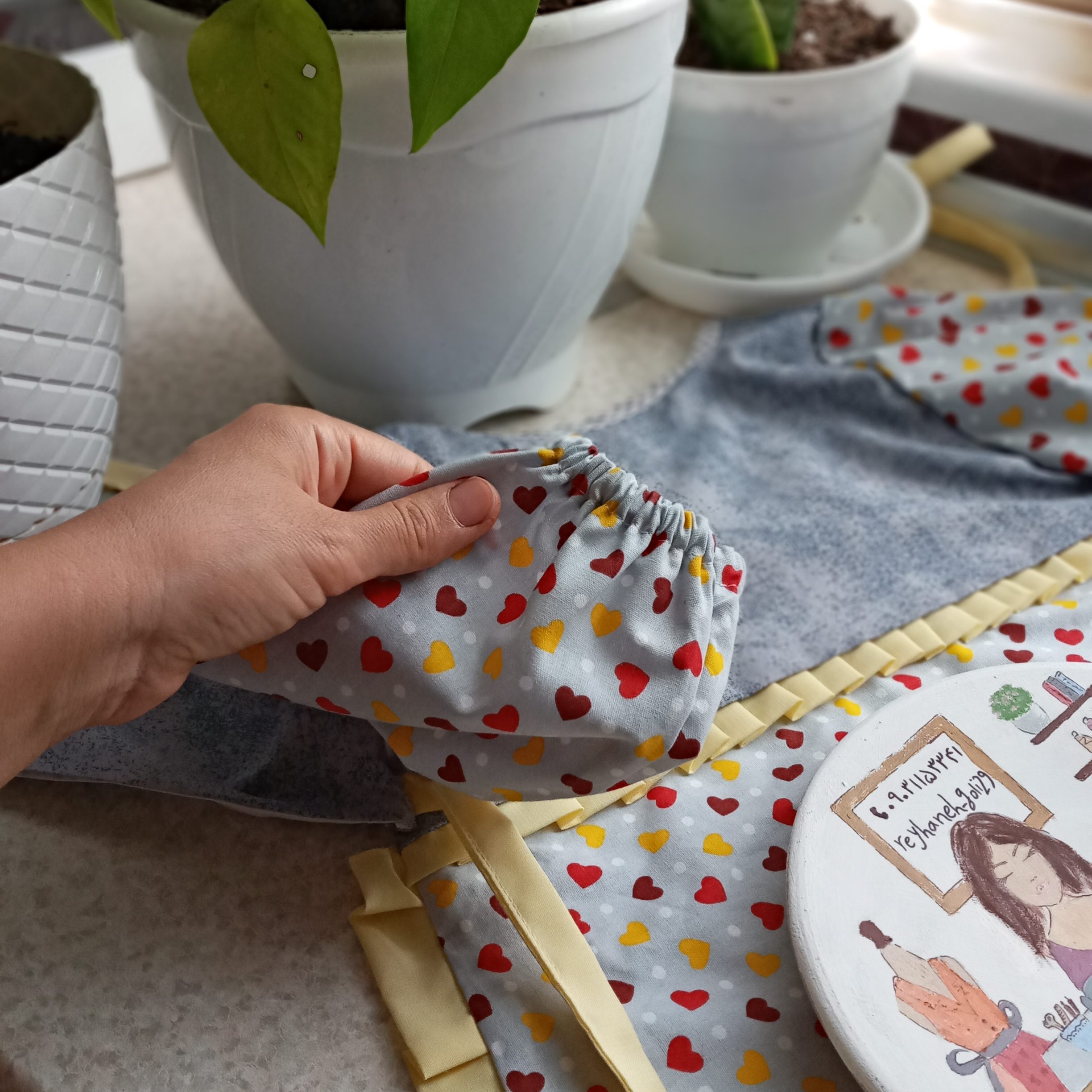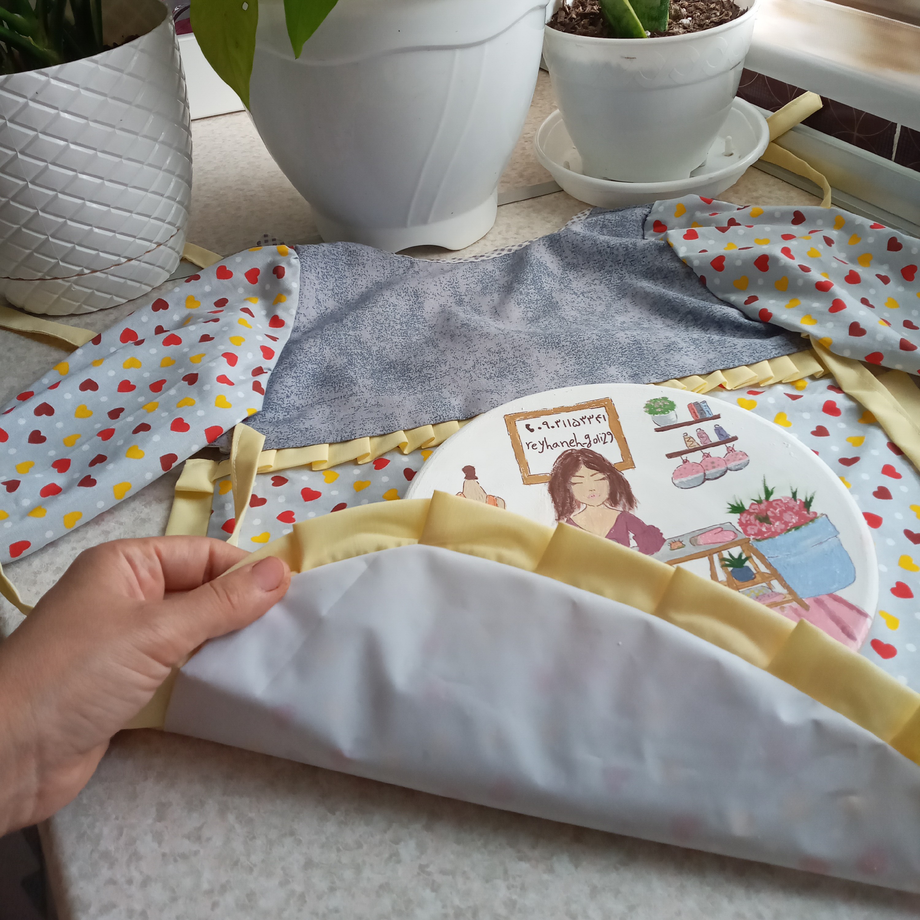 پیشبند آستین دار دو لایه ضد آب کودک با پارچه کتان نخ و مشما برزنت دوخت شده و این پیشبند دور چین دار است
