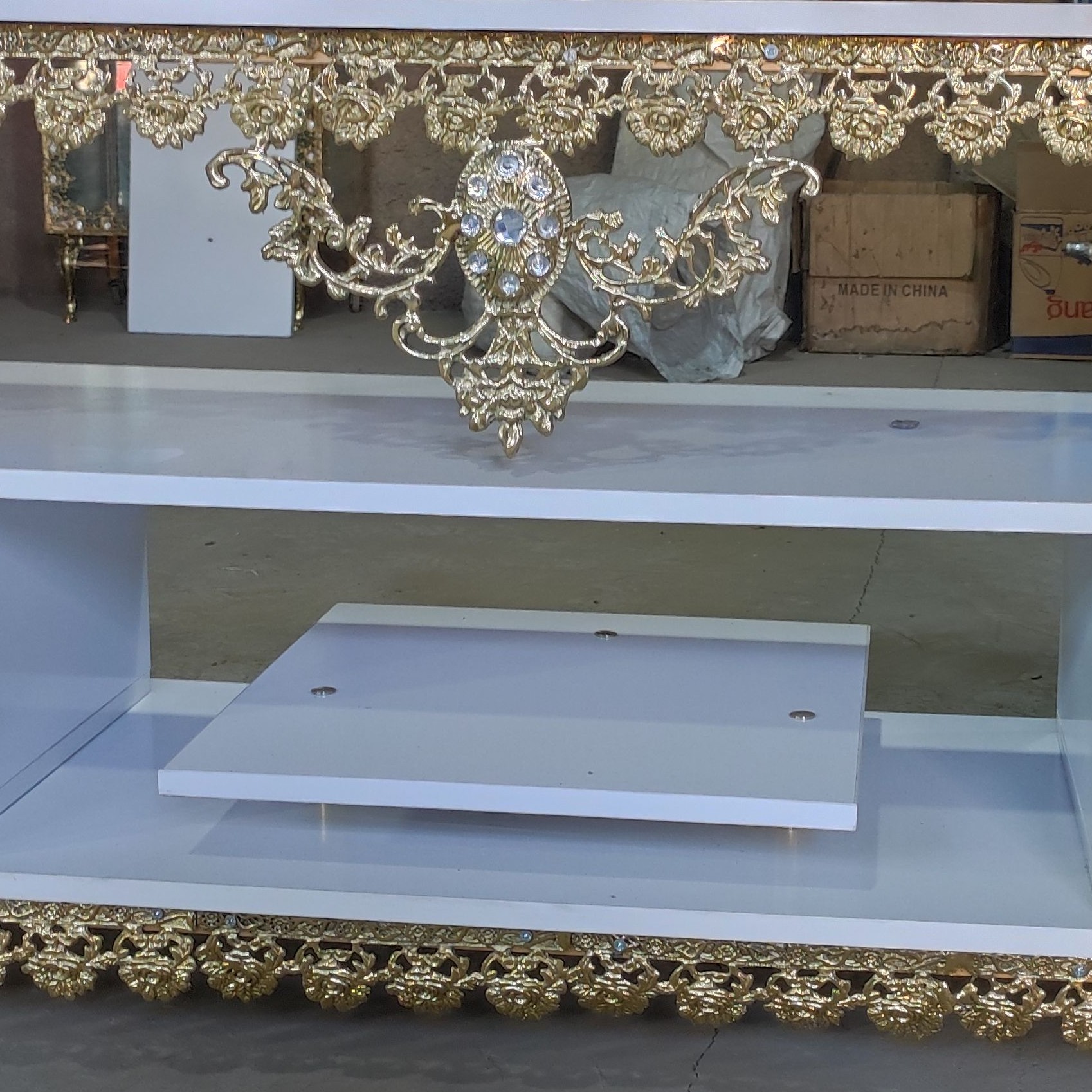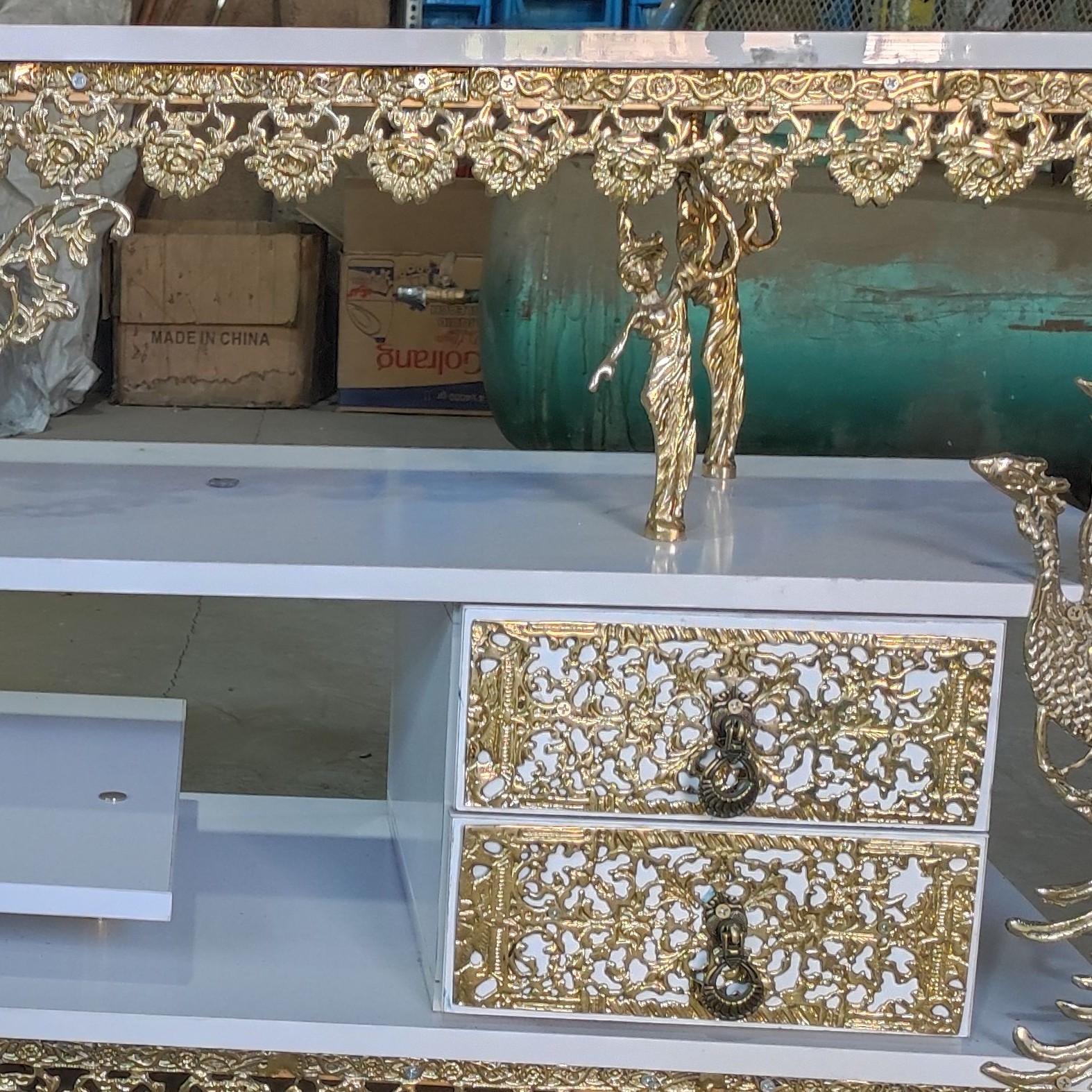میز تلویزیون برنجی تخت کشو دار سایز 140 گل رز طاووس دار کد 339 مبلمونسرا مدل 224498