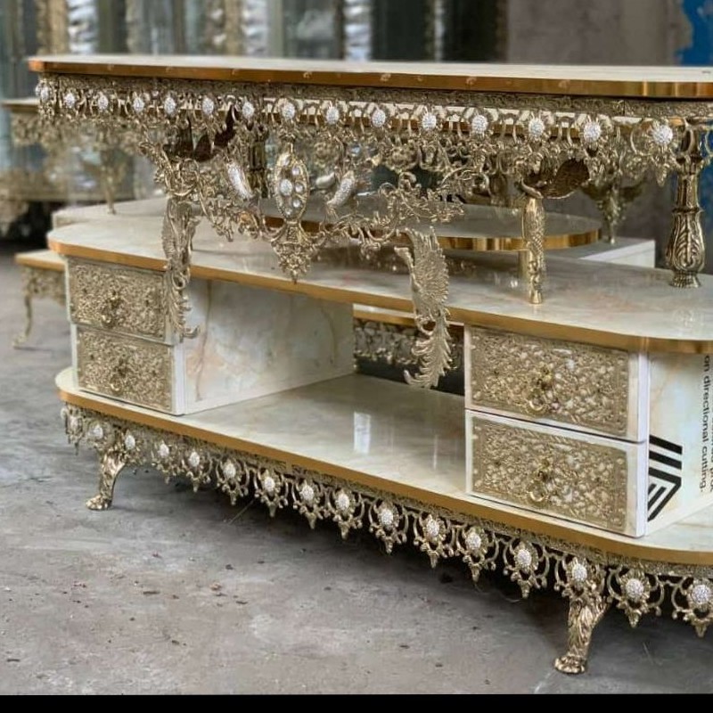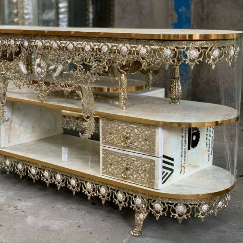 میز تلویزیون برنجی سایز 140 گل آفتابگردان بغل گرد طاووس دار ستون سرایی و ملایکه کد 340 مبلمونسرا مدل 220227