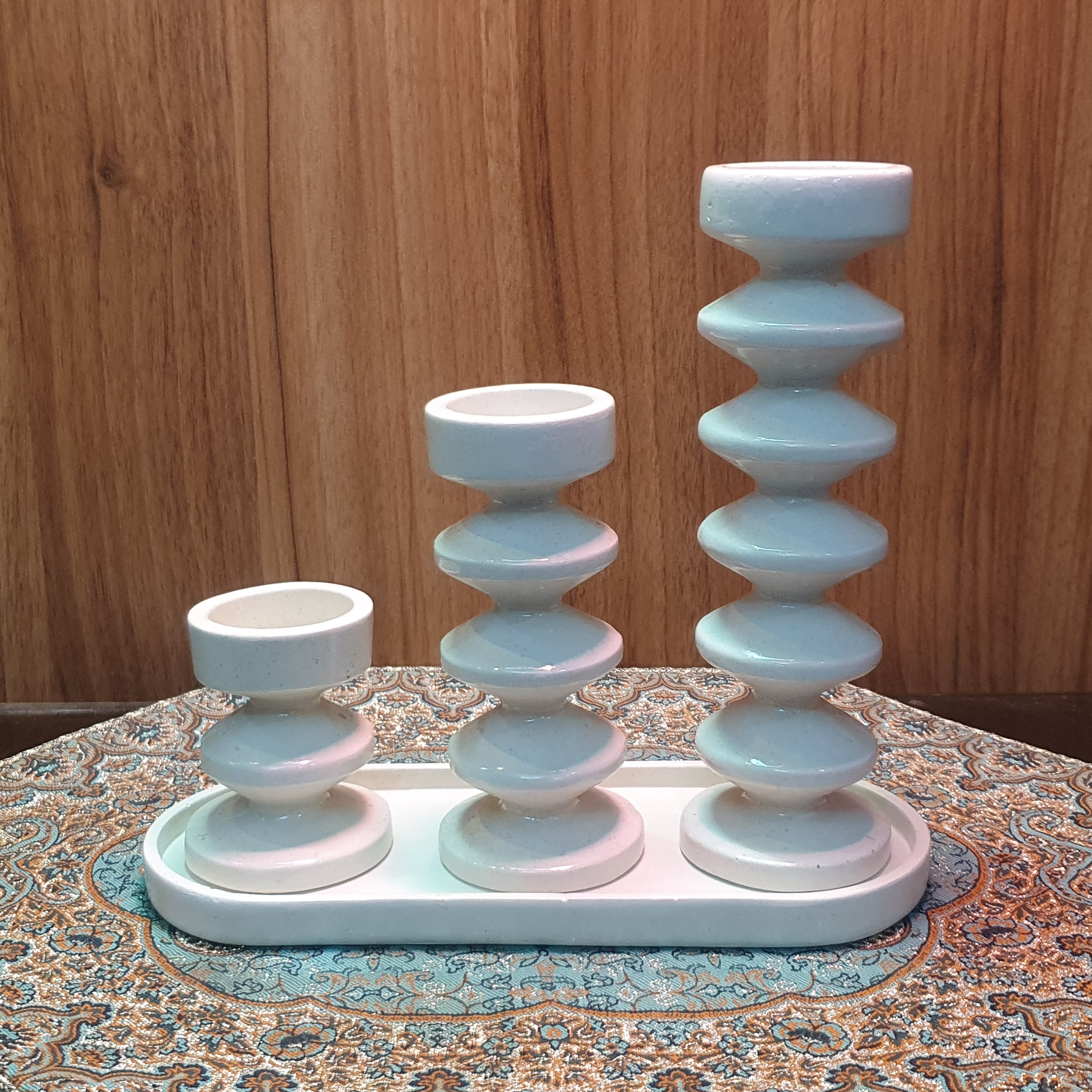 ارتفاع جا شمعی ها: ۲۰ سانتی متر، ۱۴ سانتی متر، ۸ سانتی متر ؛ سینی: طول ۲۳ سانتی متر و عرض ۹ سانتی متر