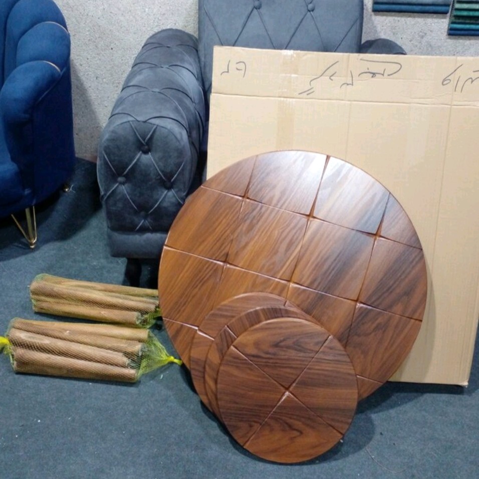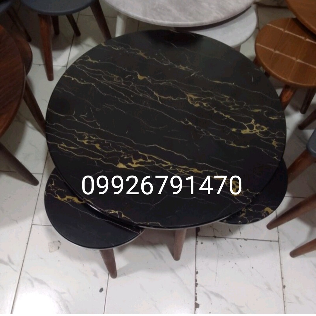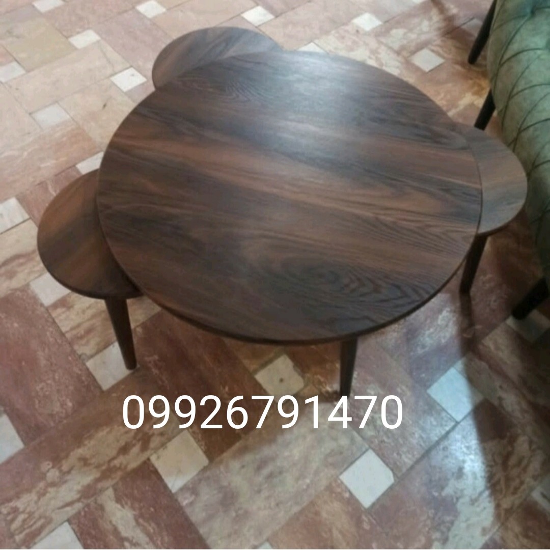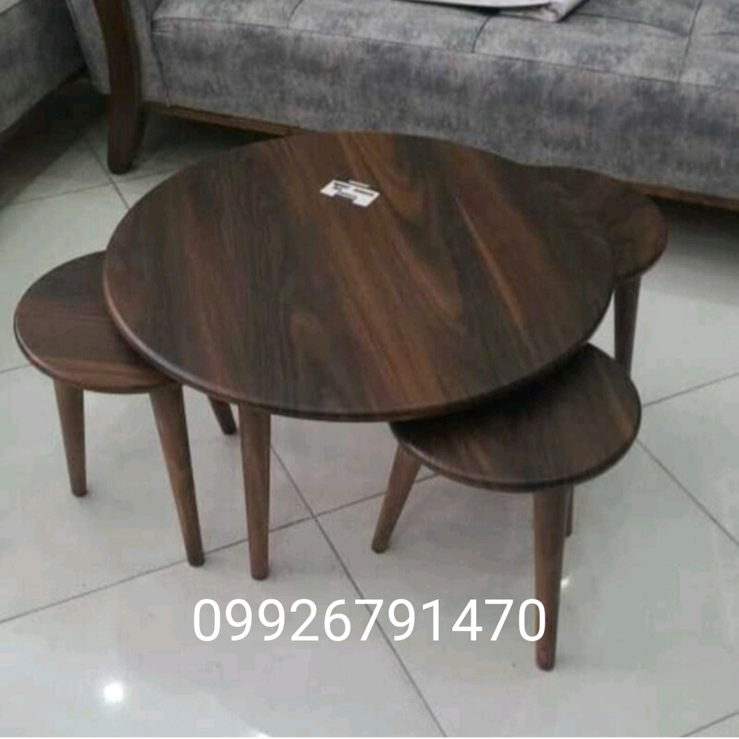 جلو مبلی عسلی وکیومی زد خش پایه چوبی پیچی 3 تا عسلی کوچیک یک میز بزرگ مربع گرد کروی مستطیل ..... رنگ طوسی سفید فندقی ....