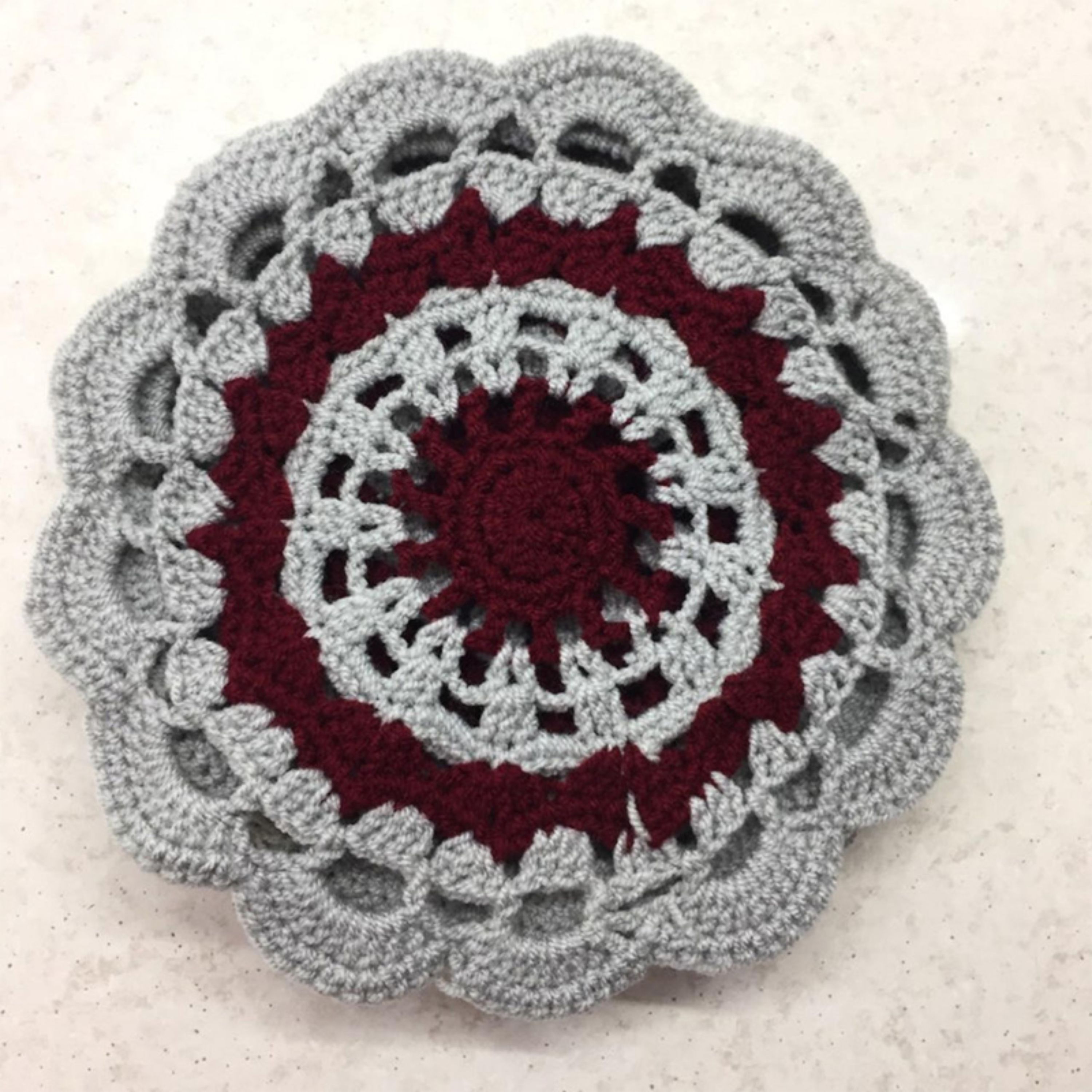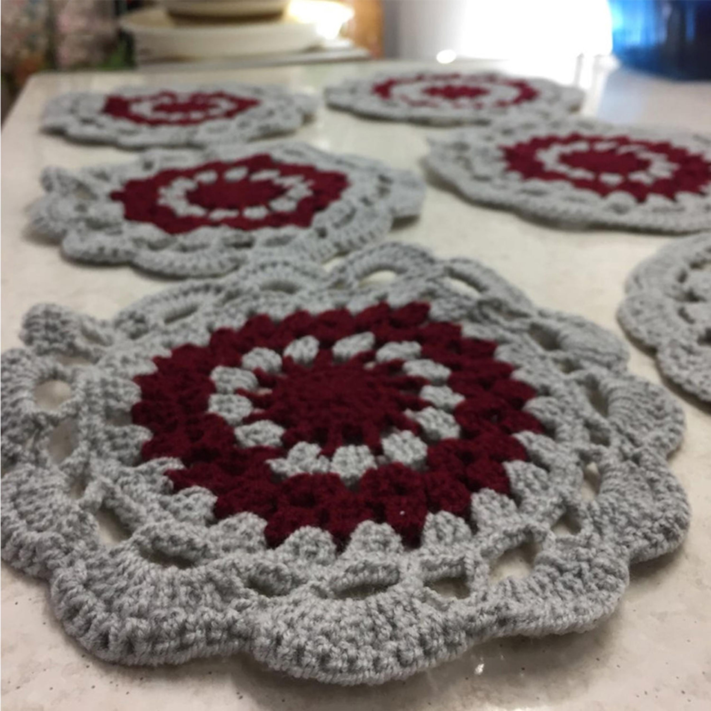 نوع بافت قلاب بافی شده جنس کاموا شکل دایره سایر مشخصات زیر لیوانی یا زیر پیش دستی ست 6 عددی قلاب بافی شده با نخ کاموا دو رنگ طوسی و زرشکی قابل شستشو با دست یا ماشین لباسشویی بافت و گره محکم رنگ ثابت بافته شده با دست
