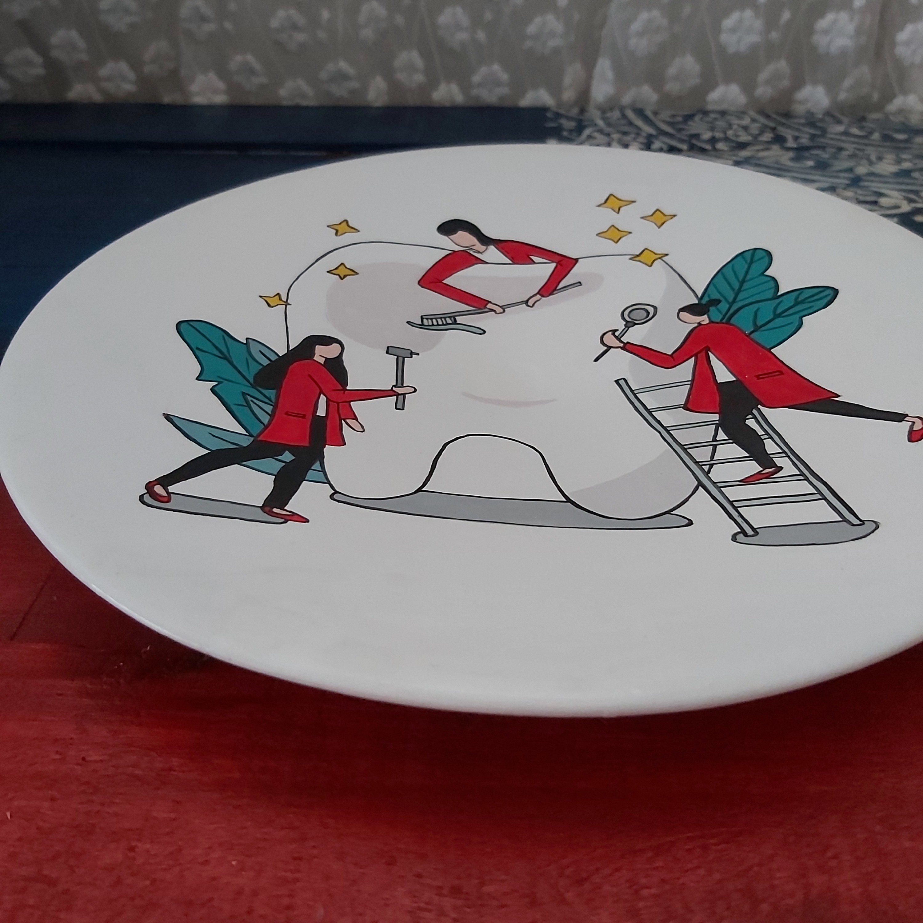 بشقاب سفالی دیوارکوب آویز دندان پزشک دکتر خانم قطر 20 و 25 و 30سانتیمتر کاردست قابل شستشو نصب آسان مبلمونسرا مدل 259114