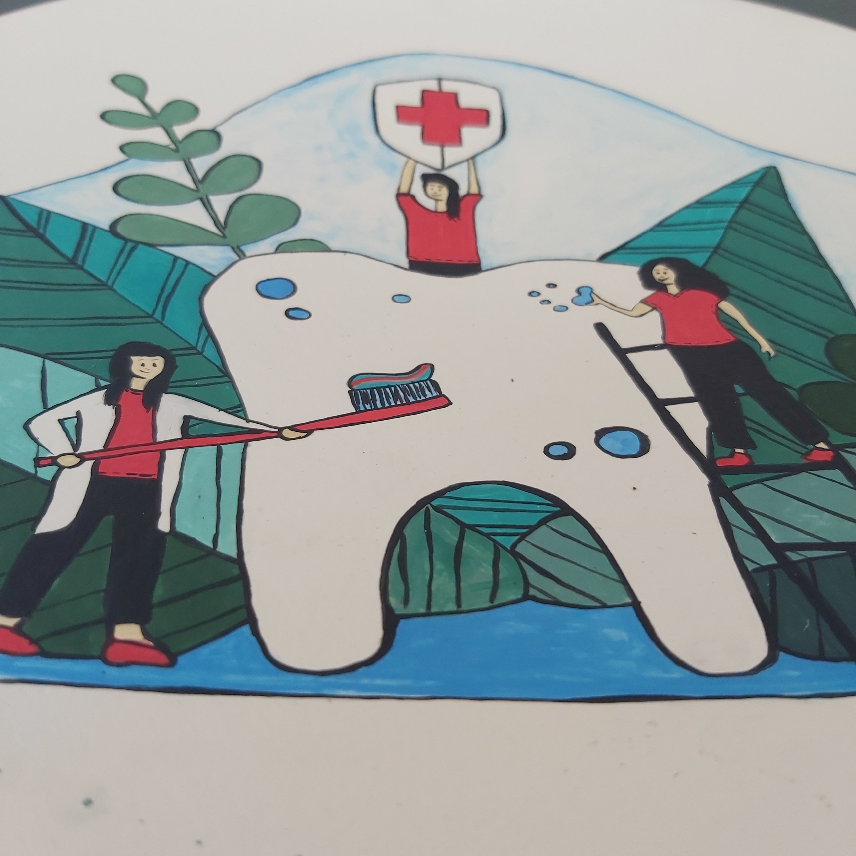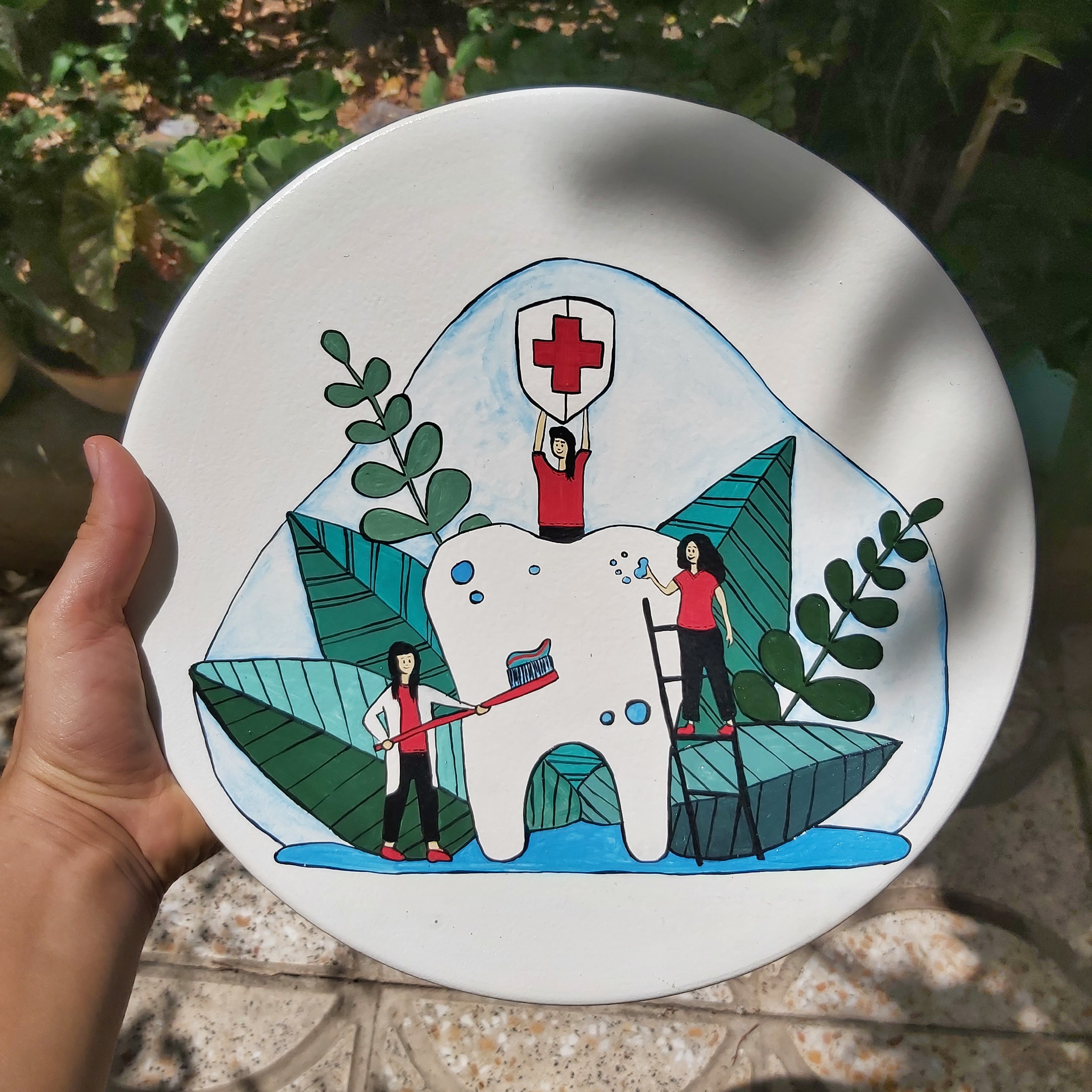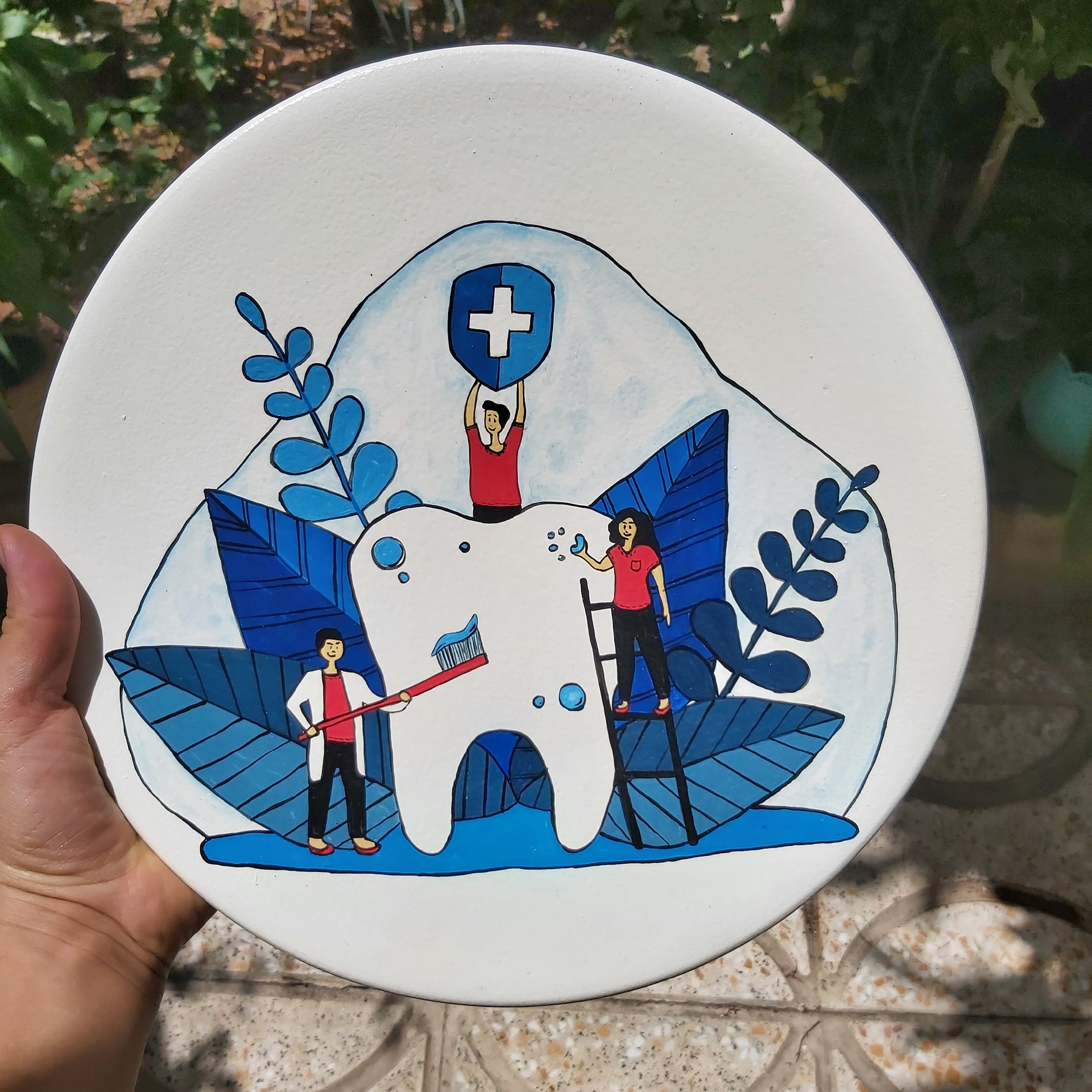 بشقاب سفالی دیوارکوب آویز دندان پزشک قطر 30سانتیمتر کاردست قابل شستشو دارای مفتول در پشت کار برای نصب آسان مبلمونسرا مدل 259118