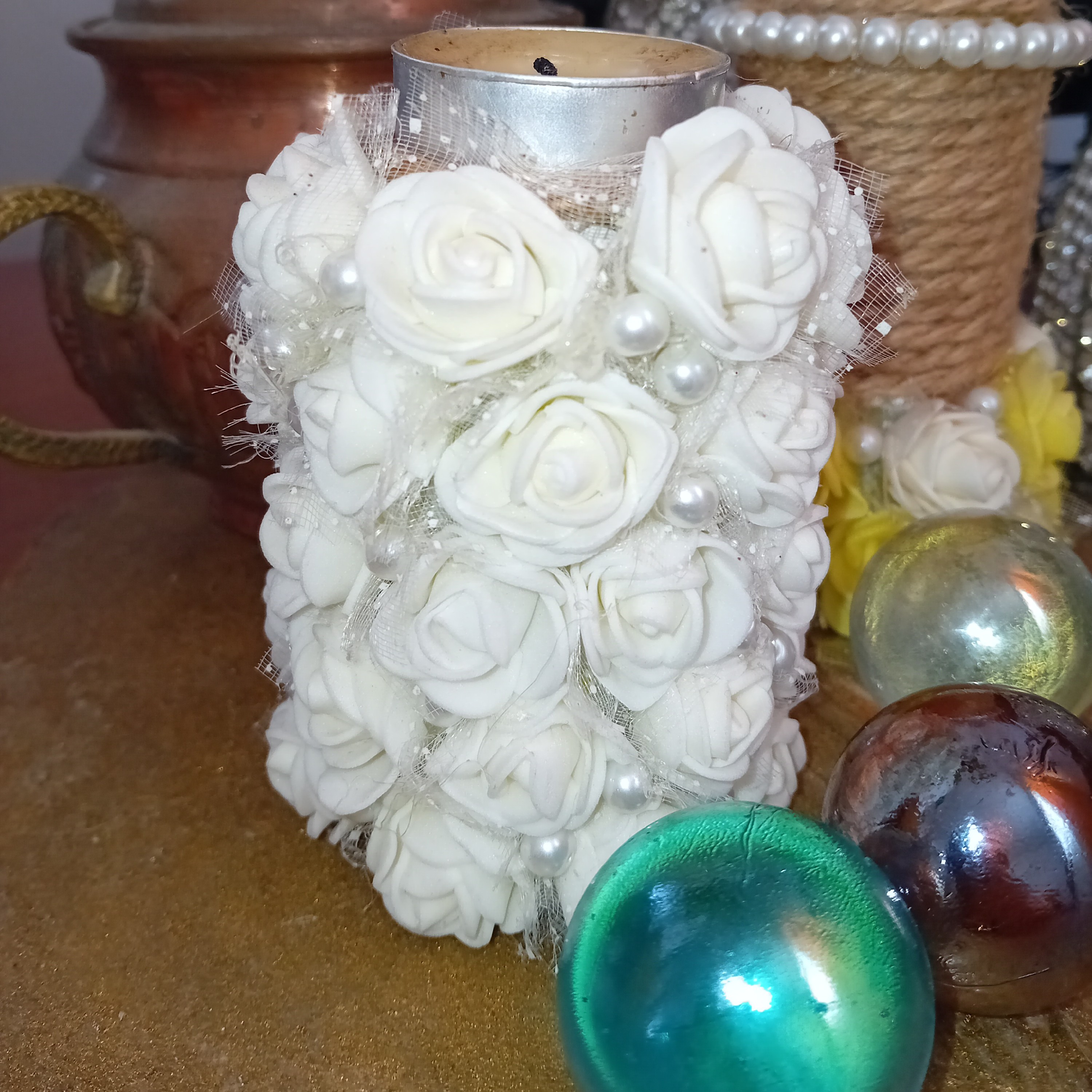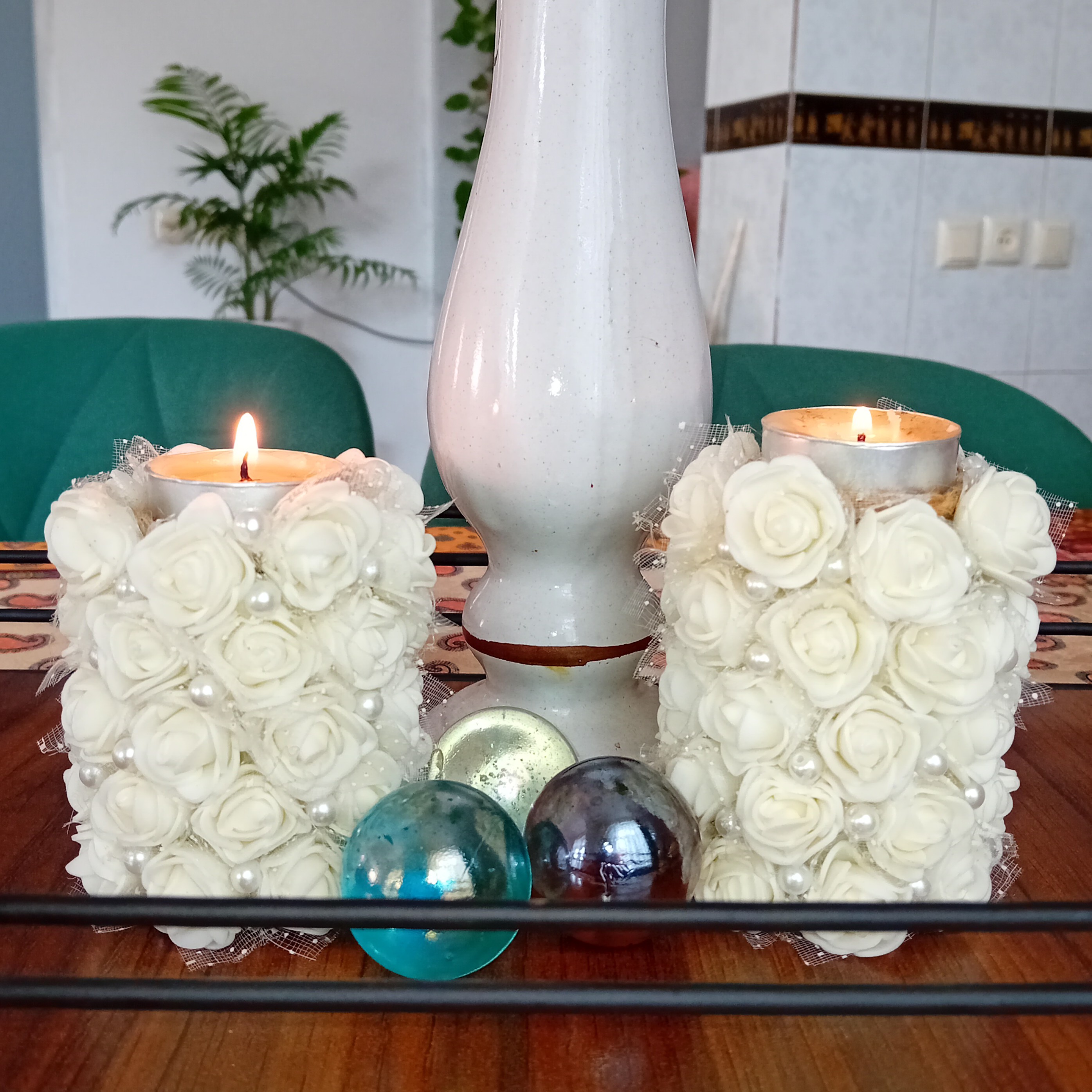 این جامعی جفت کار بسیار زیبا و فانتزی هست که میتونین برای تزئین کردن مراسمات خودتون یا روی میز استفاده بشه برای مراسمات مثل سالگرد ازدواج و تولد بسیار فصا را براتون زیباتر خواهد کرد تهیه شده از گل فومی و مروارید