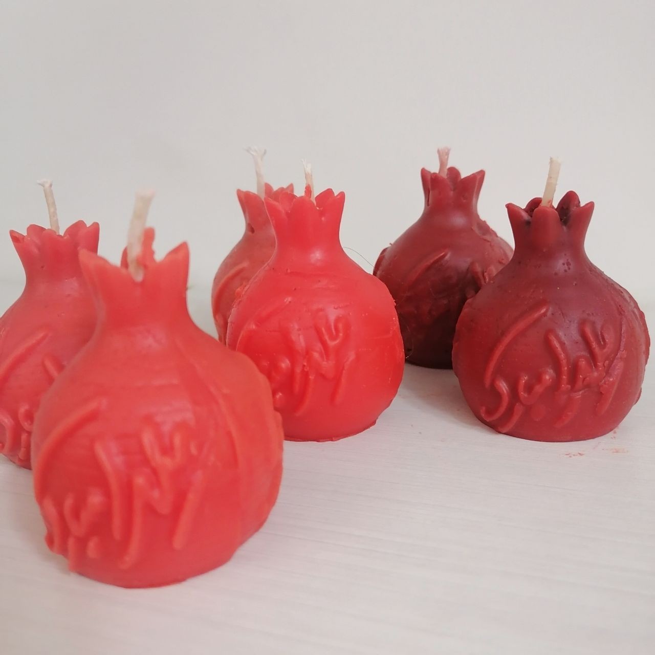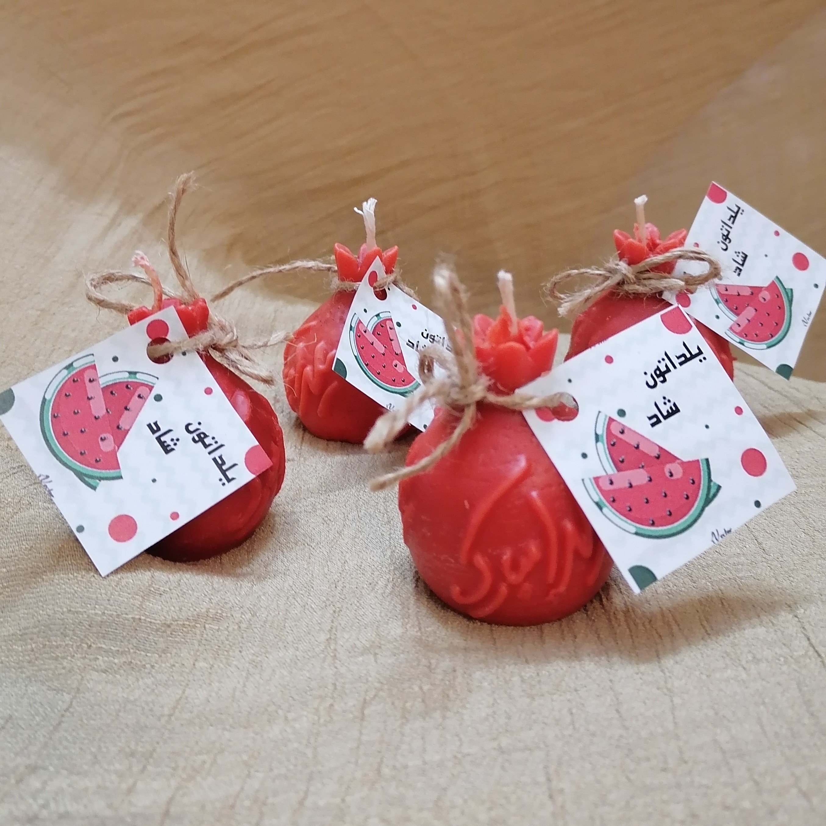 شمع انار با نوشته یلدا مبارک در دو رنگ قرمز روشن و تیره همراه با لیبل یلدا مبارک