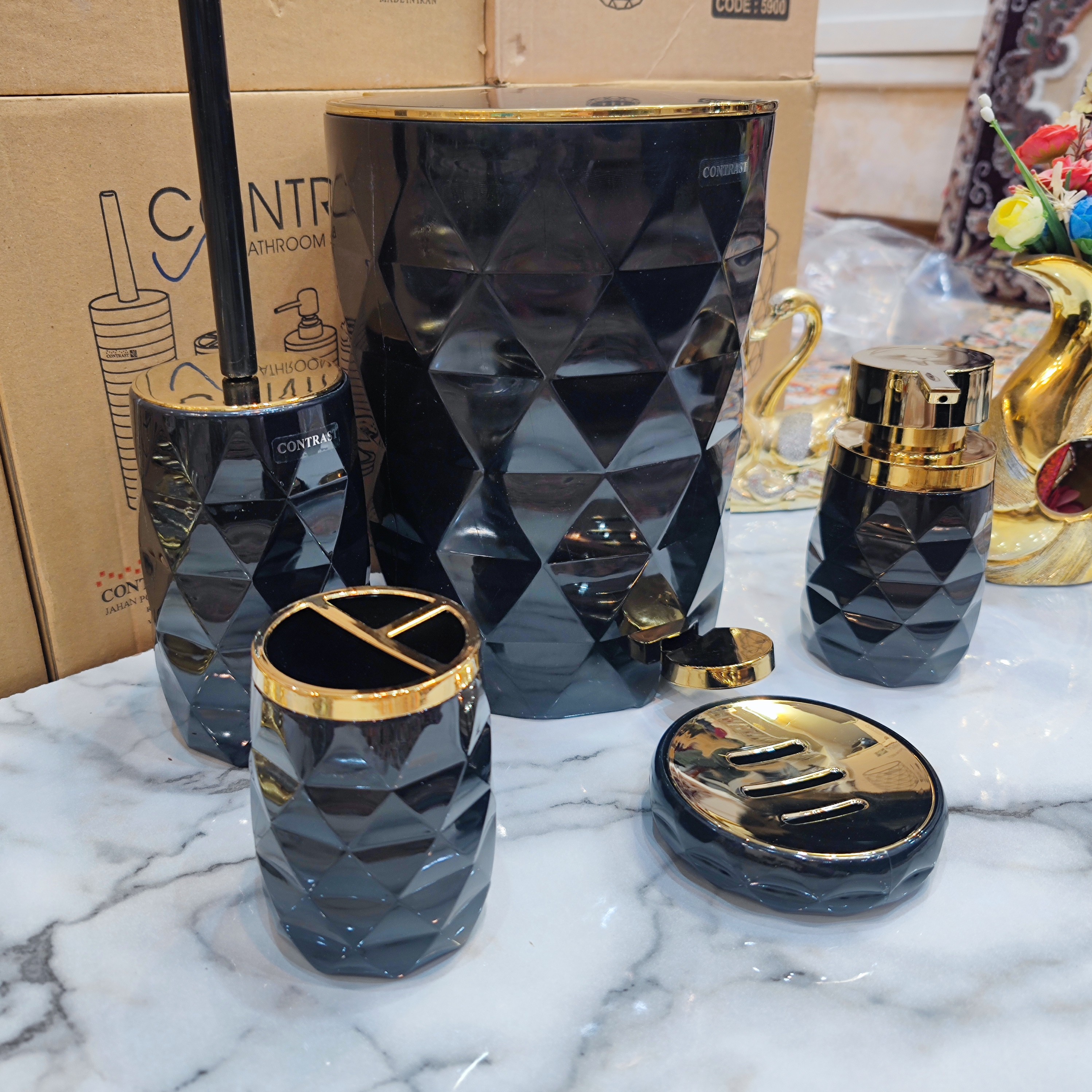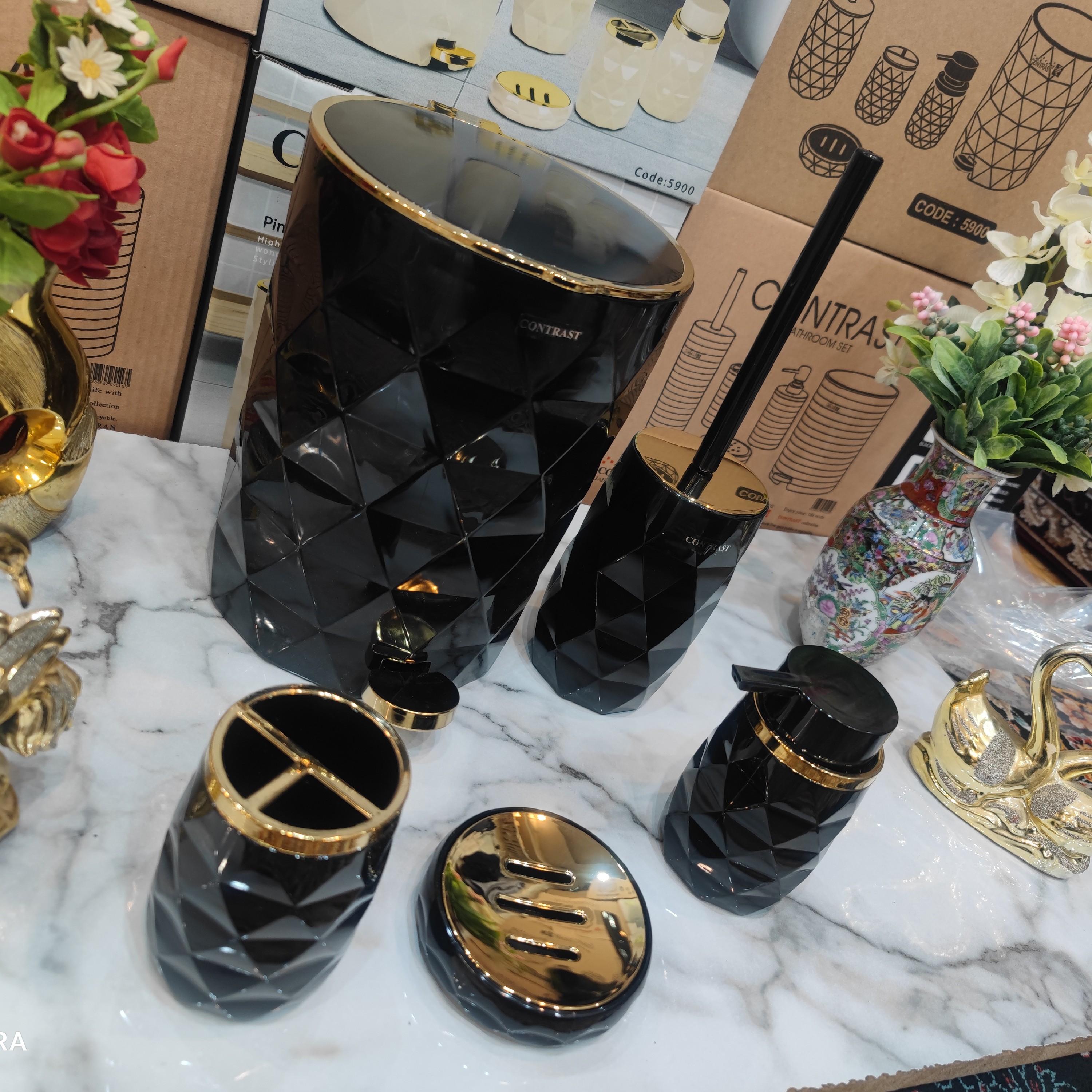 ست سرویس بهداشتی 5 پارچه طرح آناناسی رنگ بسیار زیبا و پرطرفدار مشکی طلایی برند کنتراست نو آکبند طرح و رنگ بسیار زیبا و شکیل و پرفروش ست سرویس بهداشتی شامل سطل زباله با درب آرامبند و تویی سطل جداگانه برس مخصوص شستشوی سرویس بهداشتی جامایع دستشویی با سرپمپ باکیفیت و آبکاری شده جای مسواک و خمیردندان ارسال سریع به سراسر کشور با تیپاکس و پست پیشتاز