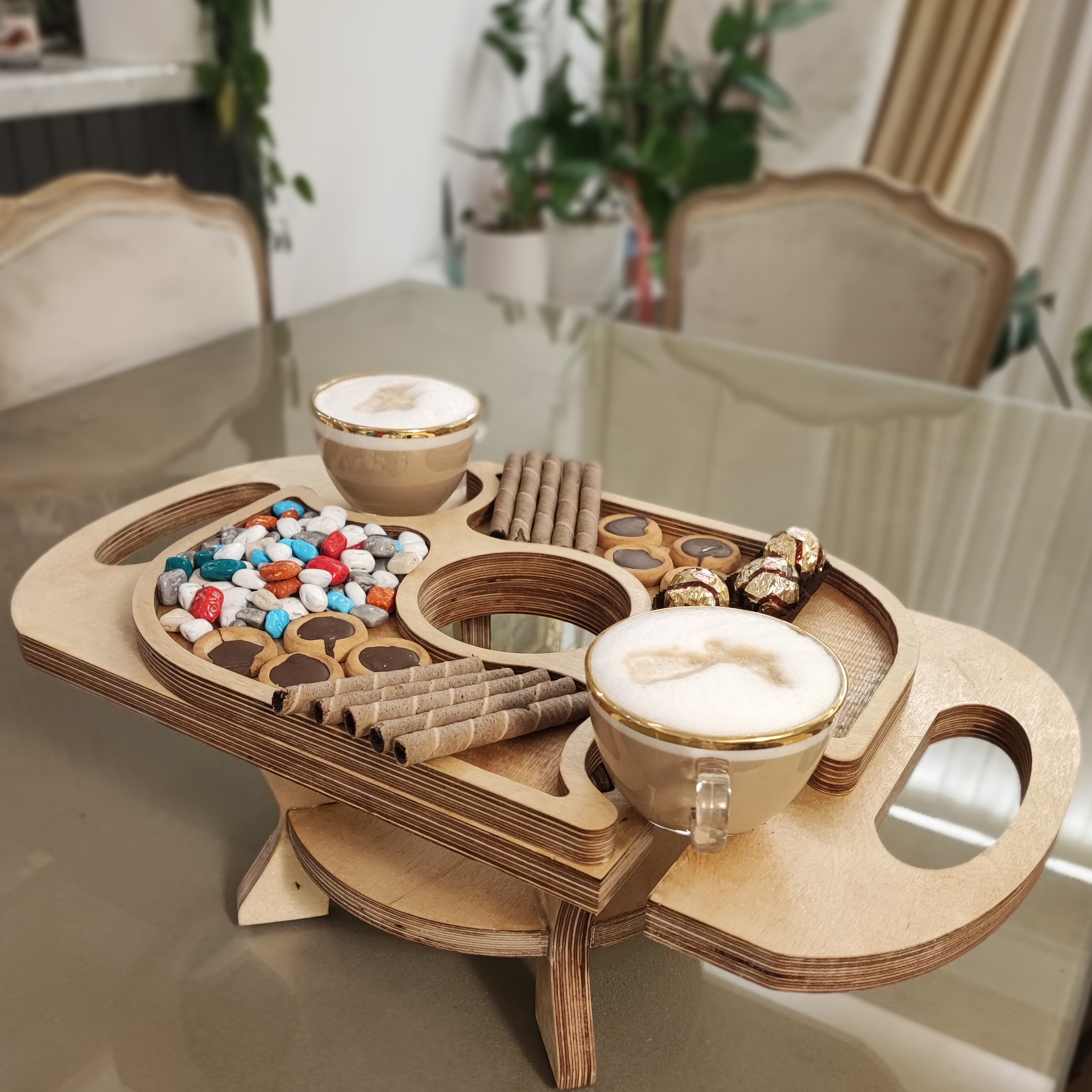 ۱)برای سرو نوشیدنی گرم سرویس چای و قهوه محل قرار دادن قوری و فنجان و محل قراردادن شمع وارمر ۲)برای سرو نوشیدنی سرد محل قرار دادن بطری ۱.۵لیتری و لیوان و گیلاسی قطعات مینی بار قابل جداشدن هستند اجزاء مینی بار: یک سینی بزرگ یک تکه یک سینی اردو خوری پایه و محل وارمر