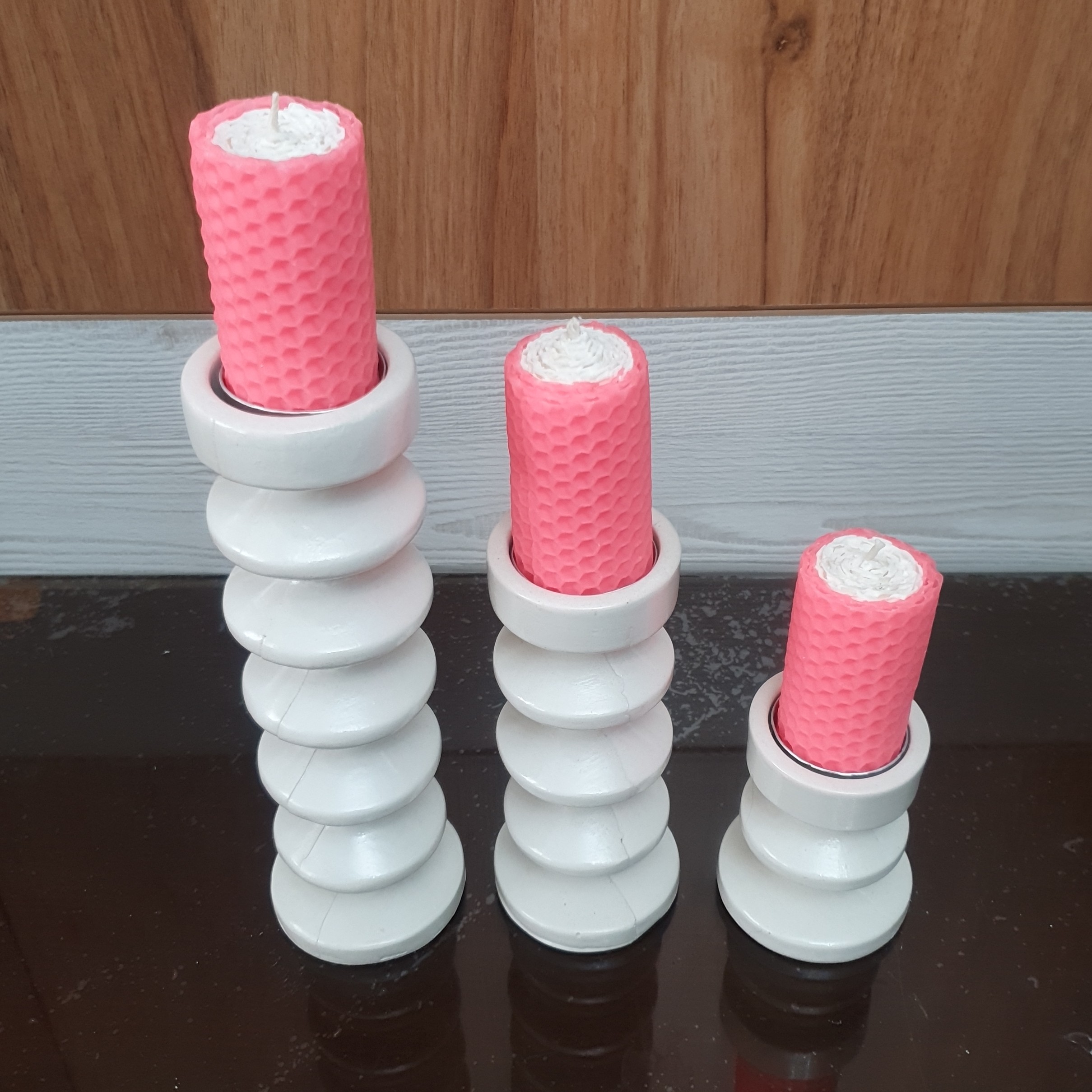 ارتفاع جا شمعی ها: ۲۰ سانتی متر، ۱۴ سانتی متر، ۸ سانتی متر، قطر دهنه: ۴ سانتی متر ؛ شمع ها: ارتفاع ۷ و قطر ۳.۵ سانتی متر