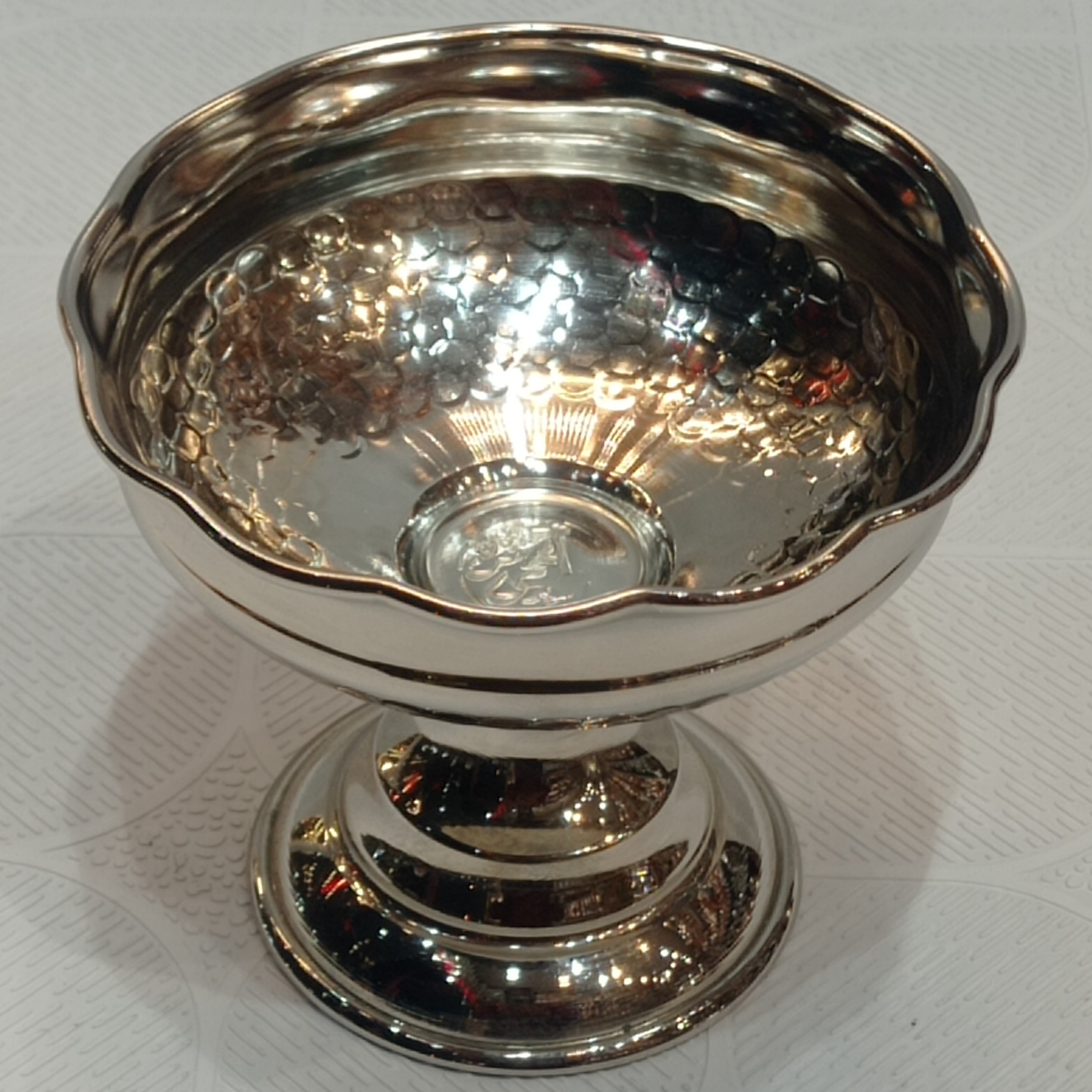 بستنی خوری مسی کروم اسدی زنجان درجه یک و ضخیم طرح دیبا قطر : ۱۰ سانتی متر ارتفاع : ۸ سانتی متر