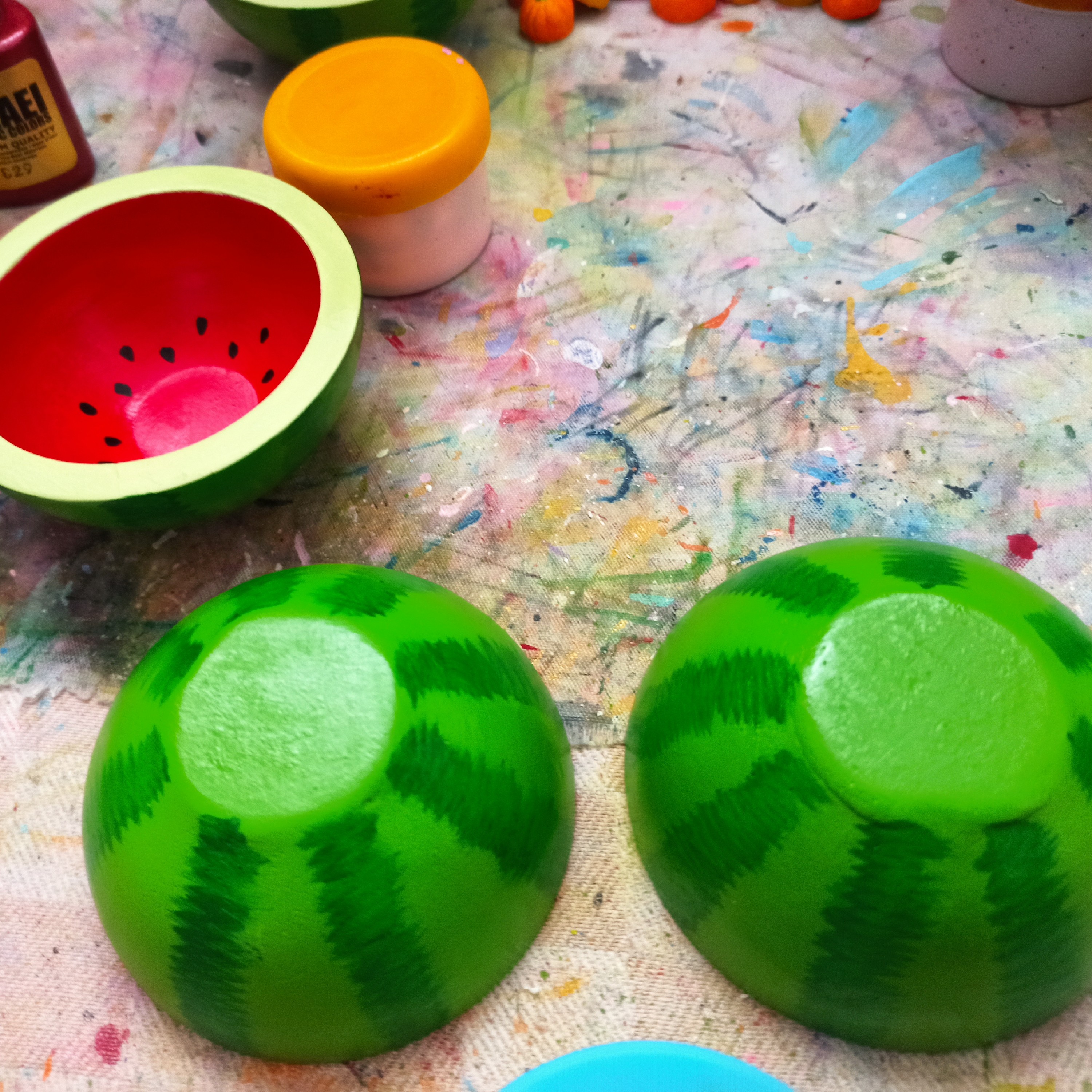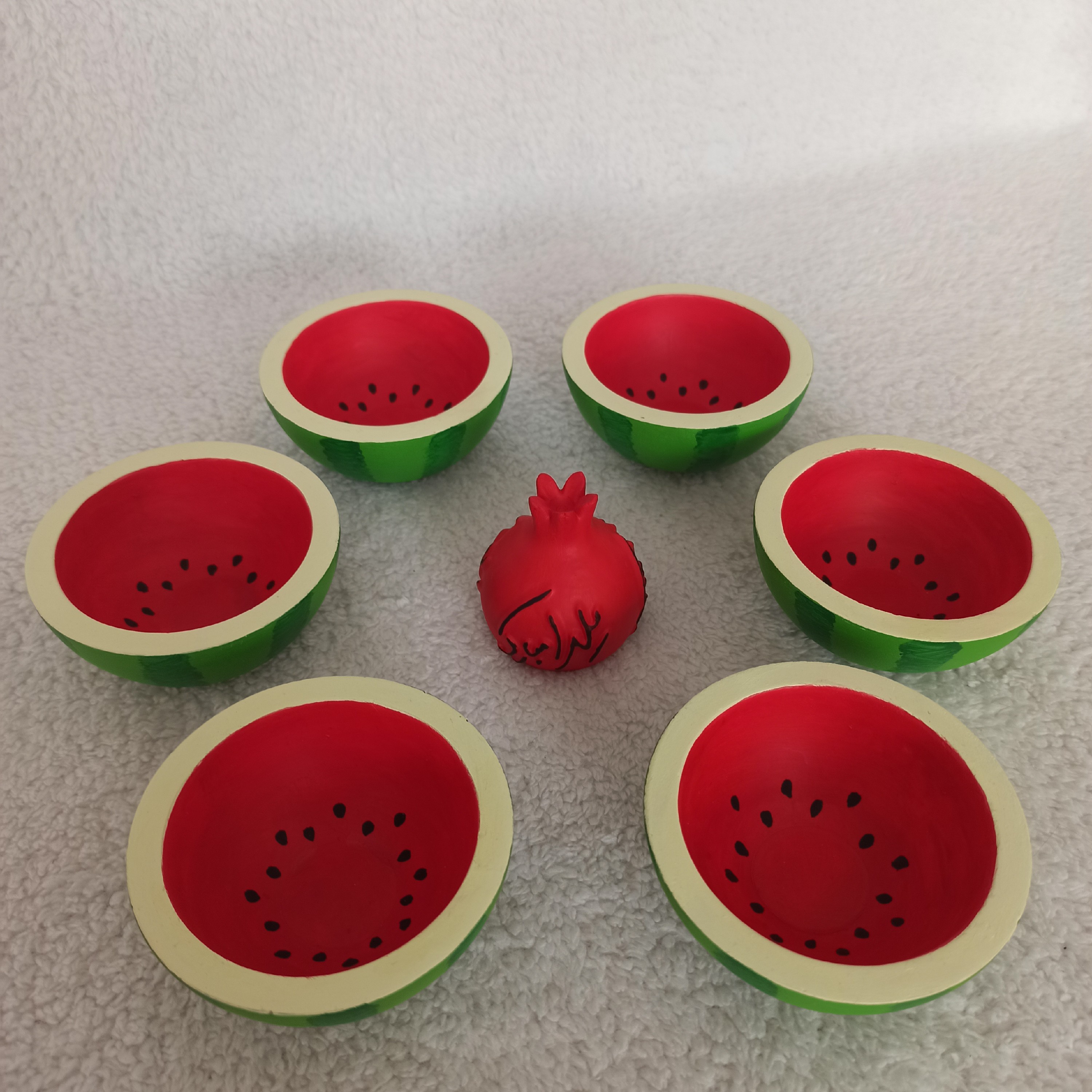 ست یلدایی طرح هندونه ای شامل ۶ عدد پیاله و ۱ عدد انار جنس پودر سنگ هنری متا قابل شستشو رنگ اکریلیک