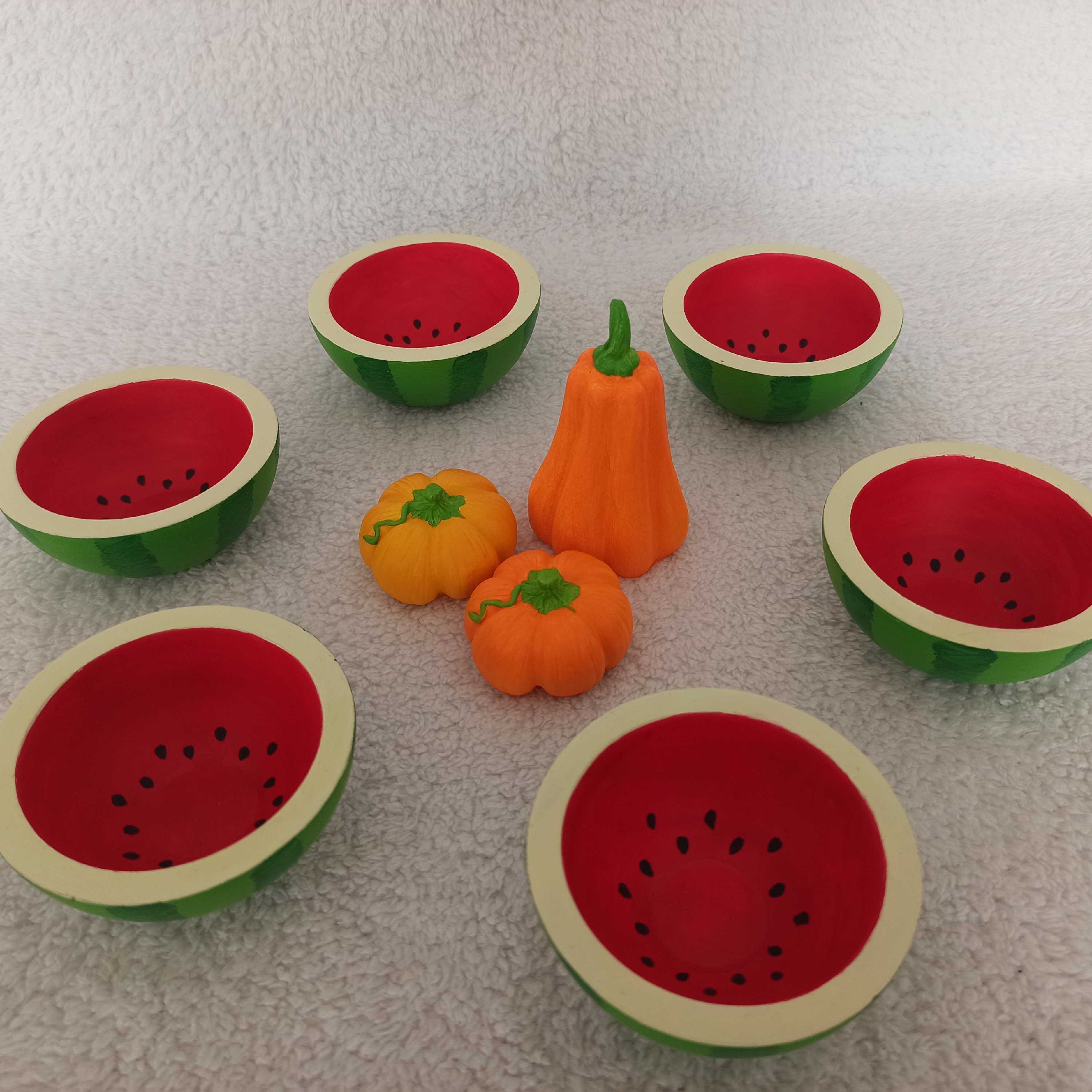 ست یلدایی طرح هندونه ای شامل ۶ عدد پیاله و ۱ عدد کدو بلند و ۲ عدد کدو پهن جنس پودر سنگ هنری متا قابل شستشو رنگ اکریلیک