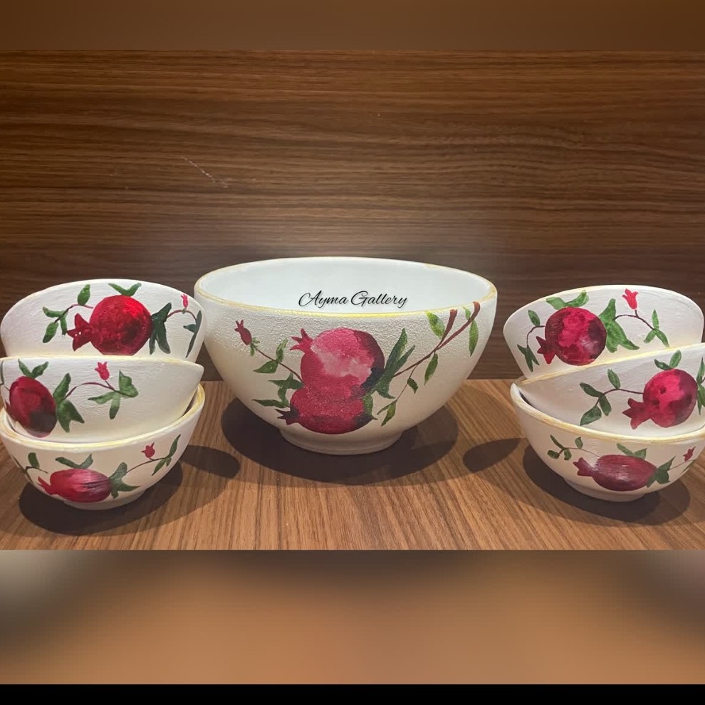 ست شش تایی کاسه بزرگ و شش عدد کاسه کوچک انار خوری جنس از سفال نقاشی شده رنگ ثابت است