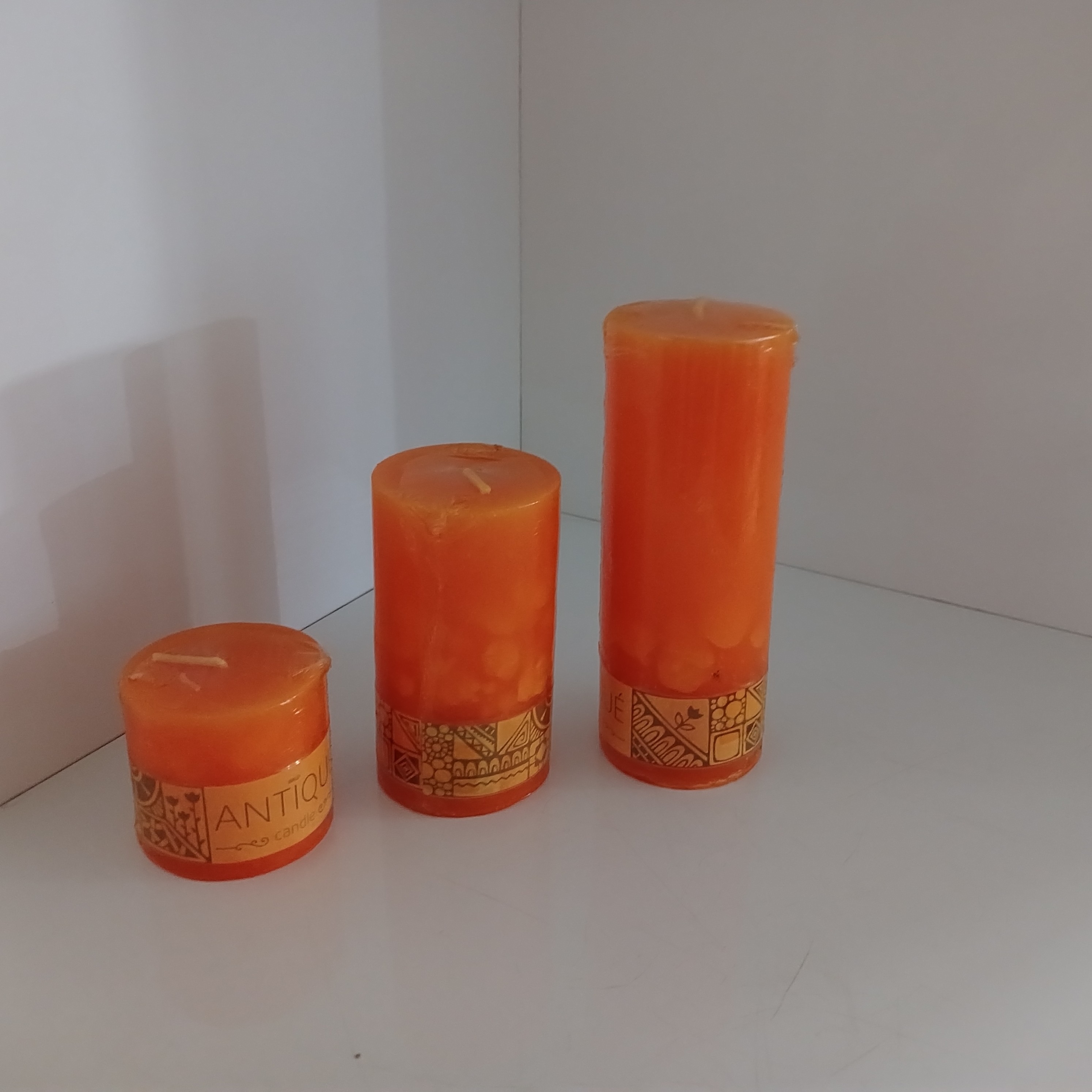 شمع استولنه ای مدل سه تایی رنگ نارنجی اندازه شمع ها به ترتیب: ۱۵ _۱۰_۵ سانتی متر قطر : ۵ سانتی متر