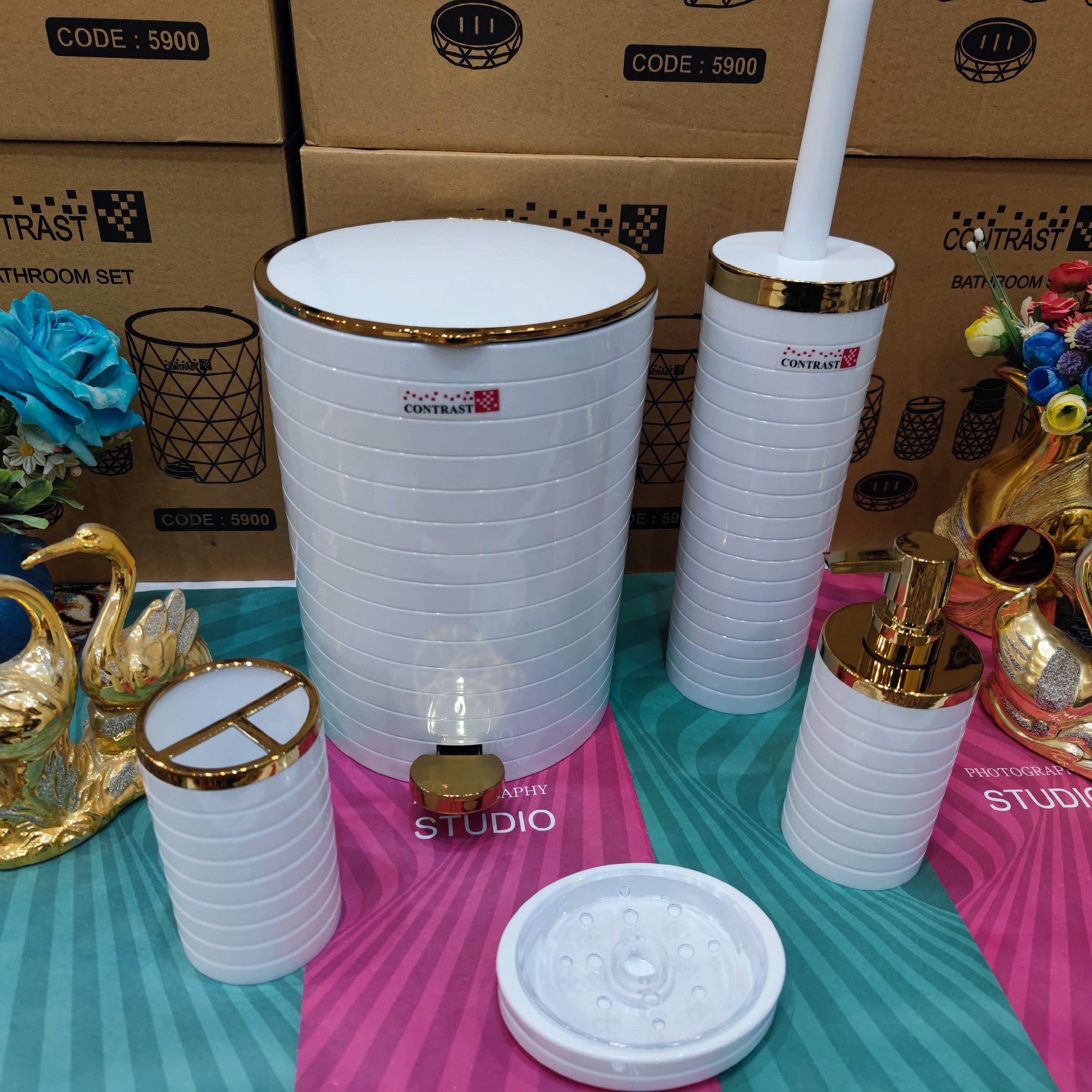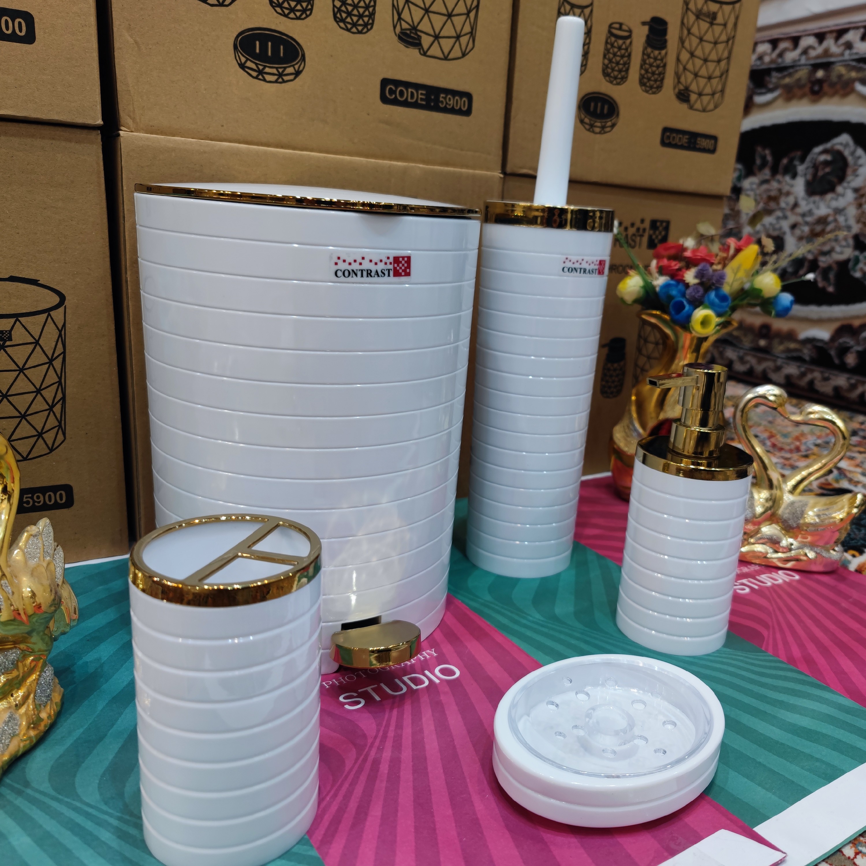 ست سرویس بهداشتی 5 پارچه طرح خط درشت برند کنتراست رنگ بسیار پرفروش و محبوب سفید طلایی نو آکبند به همراه ارسال سریع مبلمونسرا مدل 266221