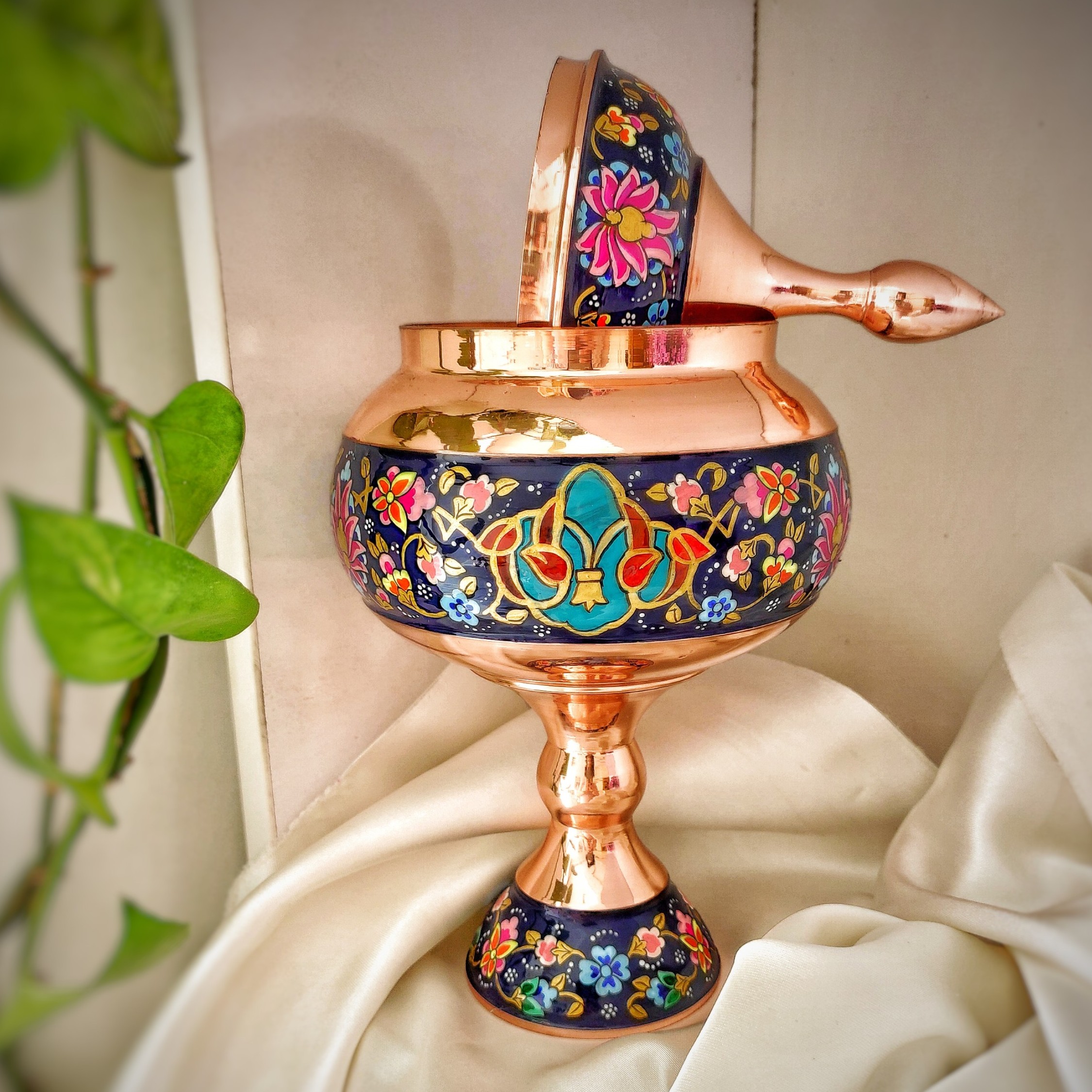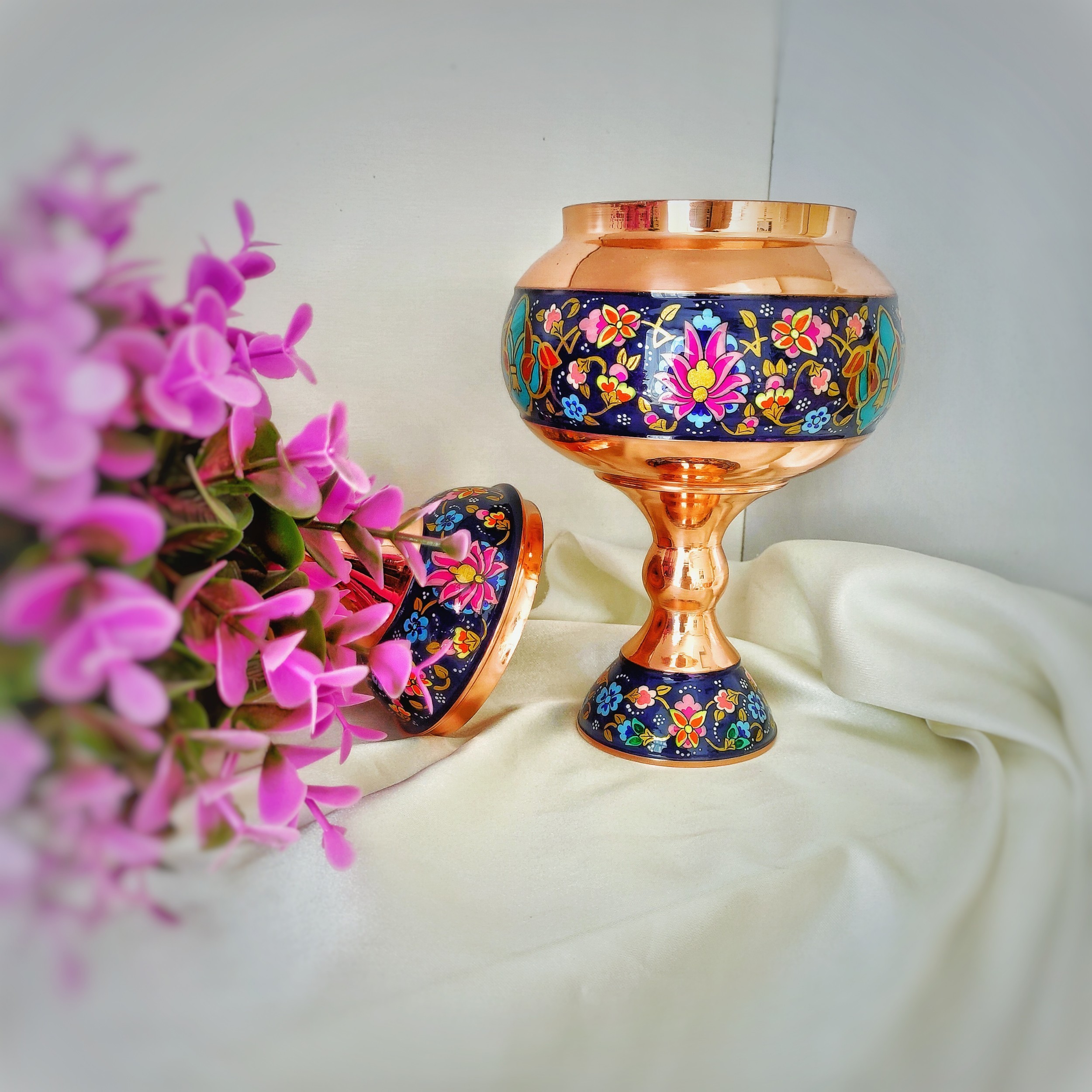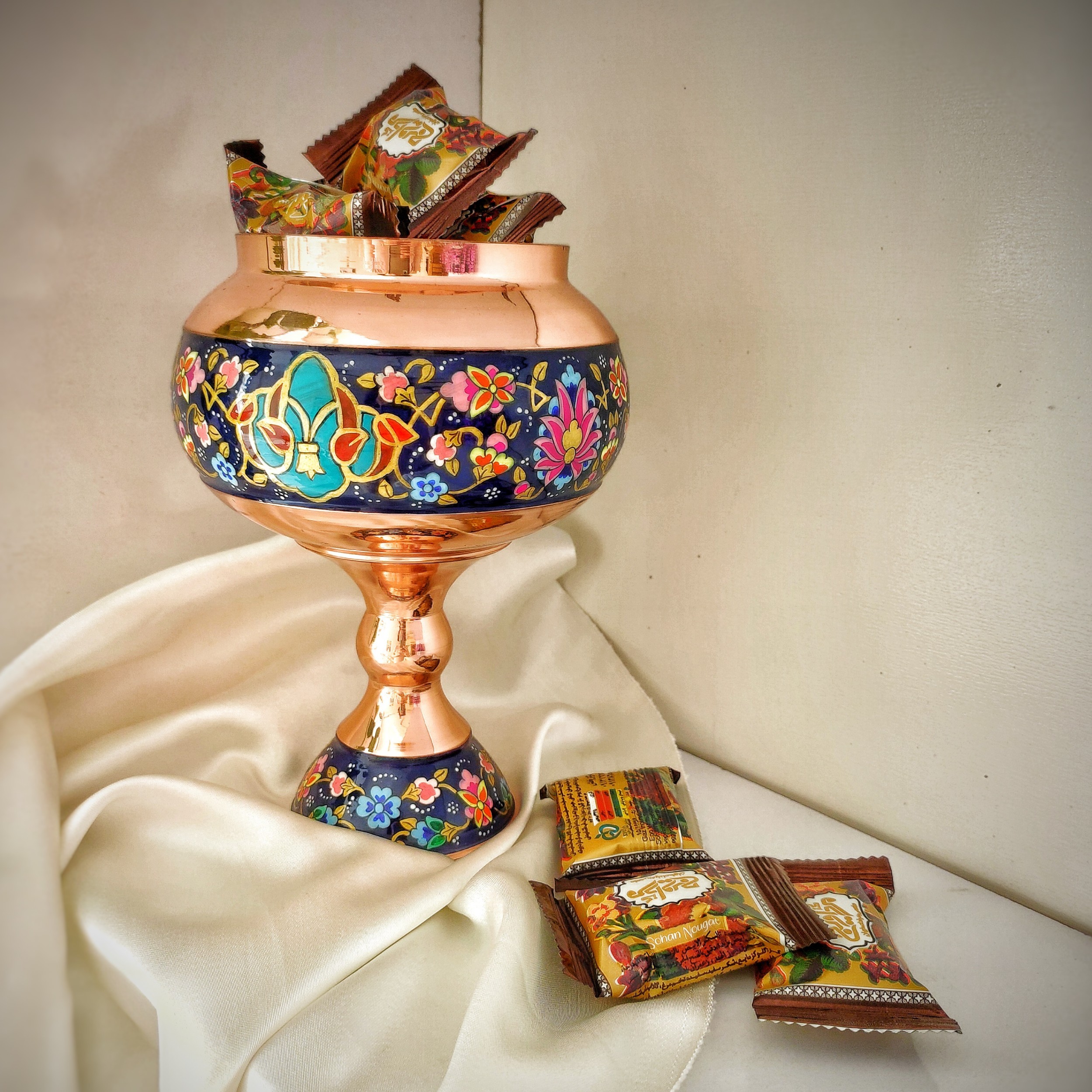 جنس بدنه این شکلات خوری از مس است که با نقاشی خوش نقش و نگاری تزیین شده است و وزن آن حدوداً 426 گرم میباشد . همنشینی دو رنگ زیبای مسی در کنار نقاشی روی آن باعث چشم نوازی هر چه بیشتر این شکلات خوری مدل پرداز شده است . فلز مس مورد استفاده در این محصول ضخامت بالا و مناسبی دارد و به شکل نهایی محصول جلوه خاصی بخشیده است. این محصول نفیس دارای پوششی از پلی استر نیز است که علاوه بر پوشش دهی مناسب سطح مس و جلوگیری از اکسید و سیاه شدن ، مقاومت آن را نیز بالا برده است . از آنجاییکه پرداخت نهایی در تولید این محصولات ماهرانه و با دقت صورت گرفته ، سطح مس نقش روی آن شفاف و درخشان است .این شکلات خوری مس و پرداز زیبا با ابعادی متوسط و کاربردی مناسب انواع تنقلات و شکلات زینت بخش مهمانی های شماست..برای تمیز کردن محصولات بهتر از دستمال نرم مرطوب استفاده کنید..