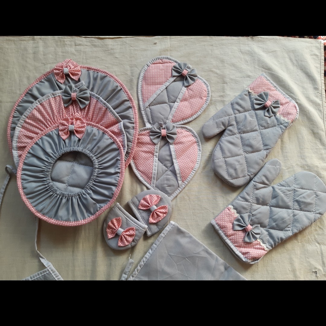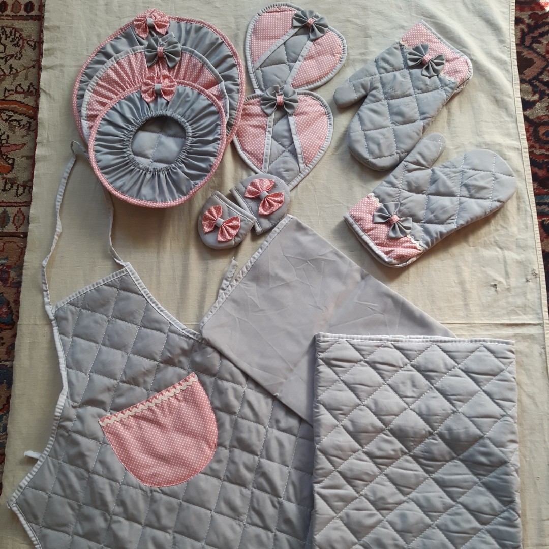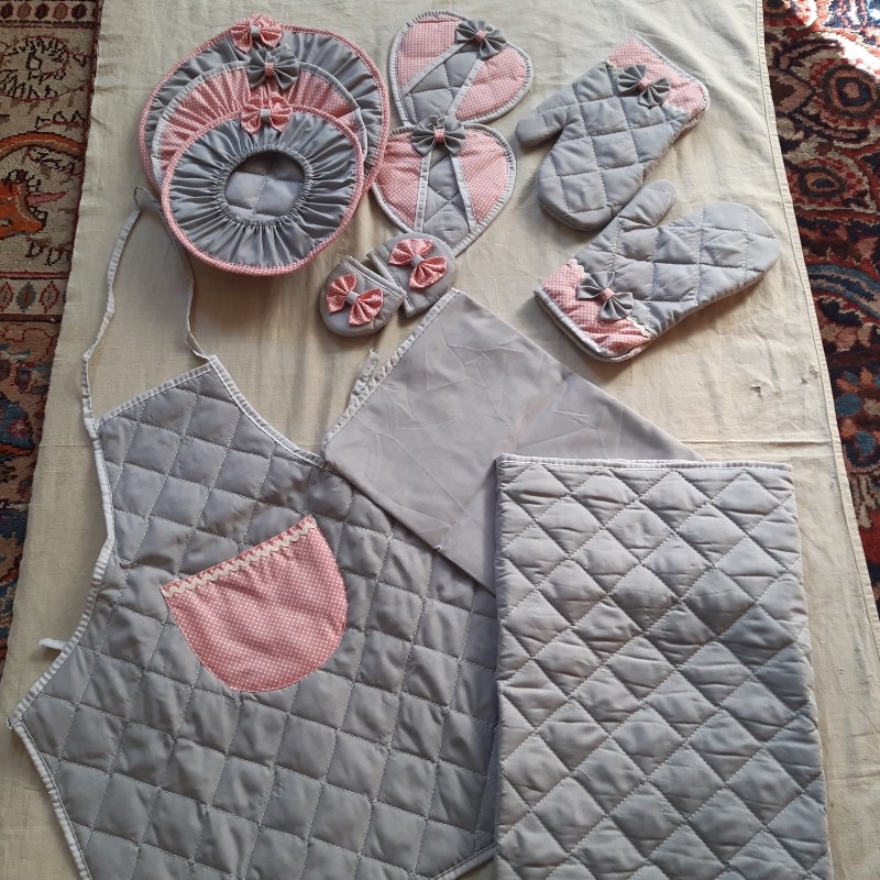 سرویس آشپزخانه زیبای تاچلی ۱۲ تکه شامل ۳ عدد دمکنی ۲ عدد دستگیره قلبی ۲ عدد دستگیره قابلمه ۲ عدد دستکش فر ۱ عدد نمگیر رو کابینتی ۱ عدد پیشبند ۱ عدد کیسه سبزی