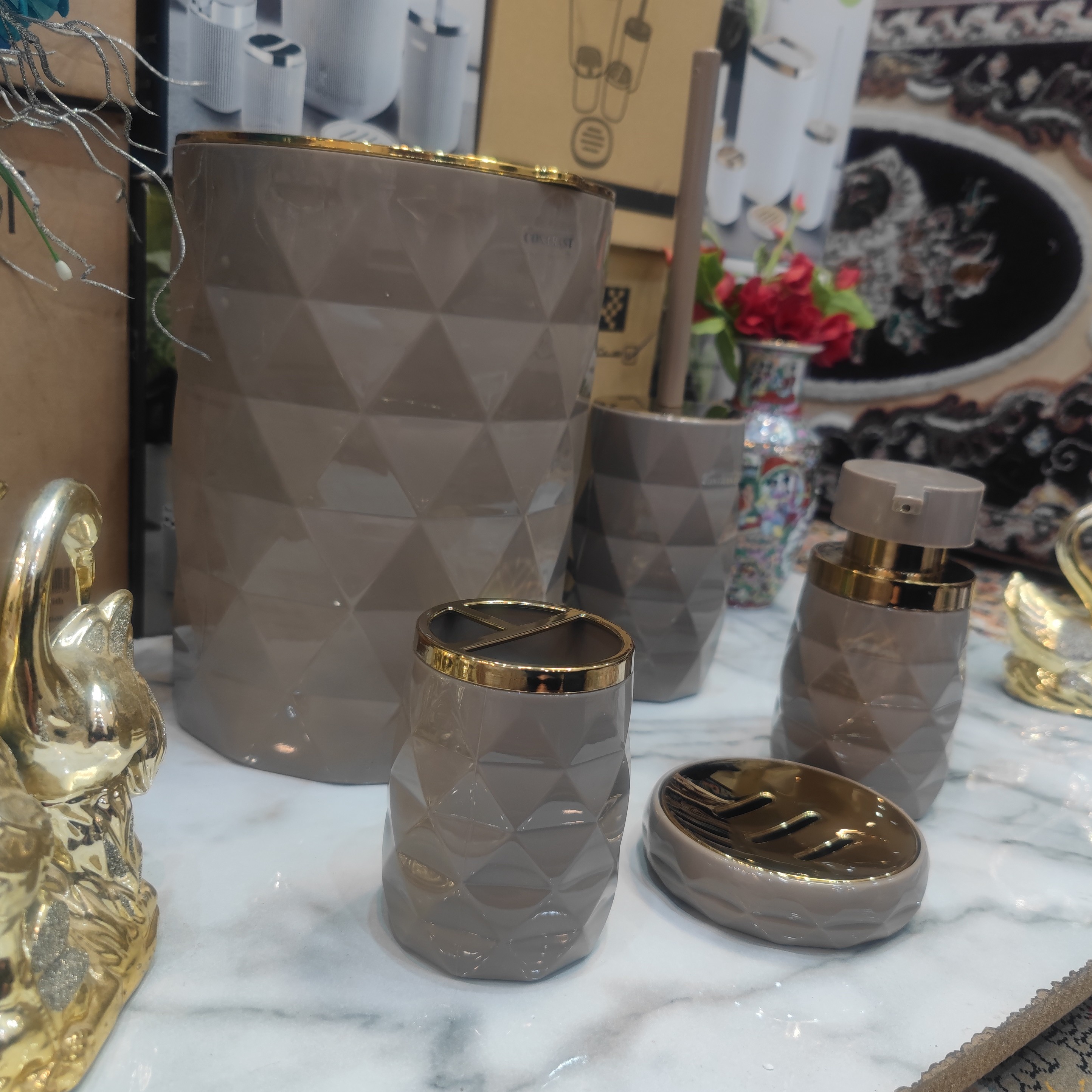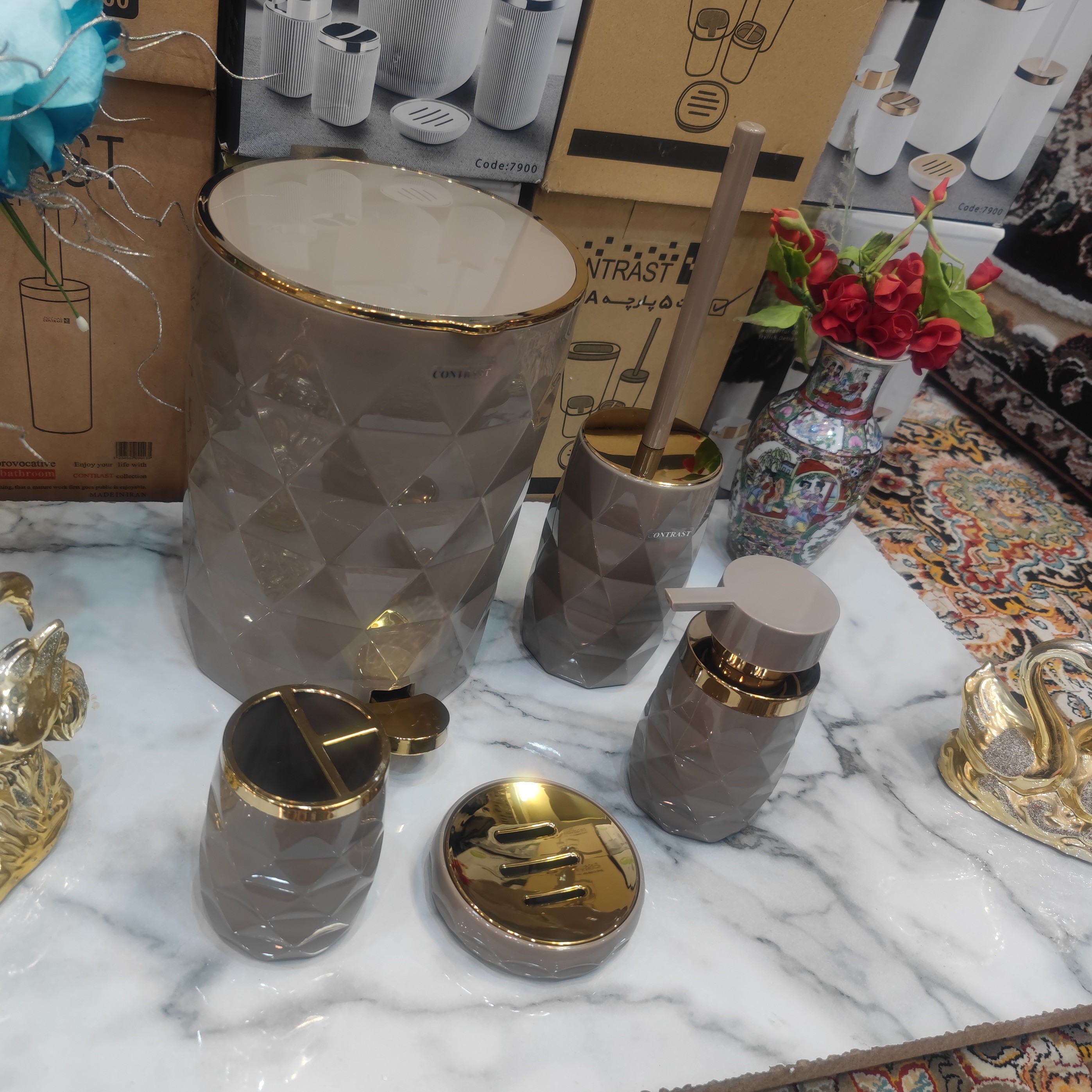 ست سرویس بهداشتی 5 پارچه طرح آناناسی برند کنتراست نو آکبند رنگ بسیار زیبا و پرطرفدار و جذاب نسکافه طلایی مبلمونسرا مدل 266509