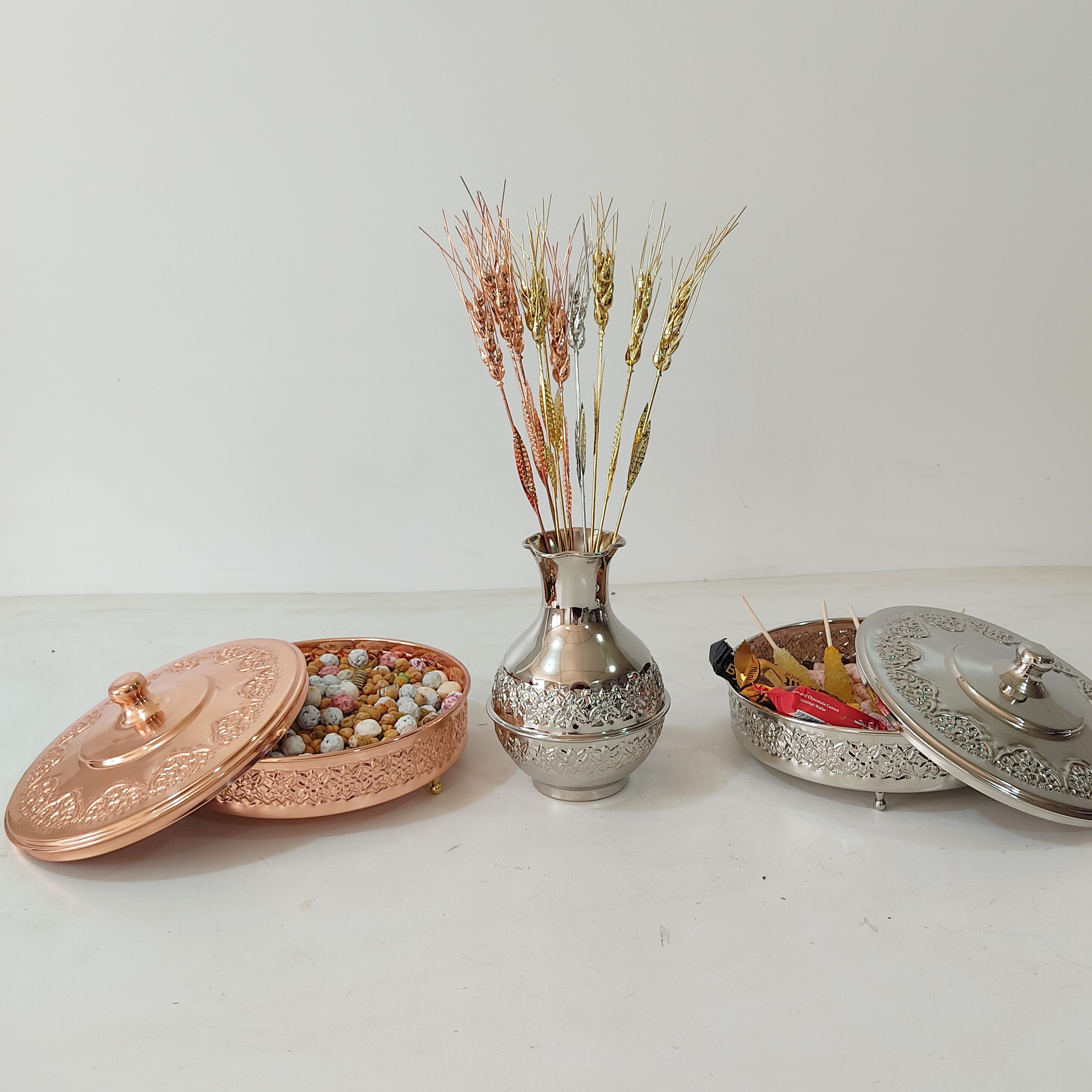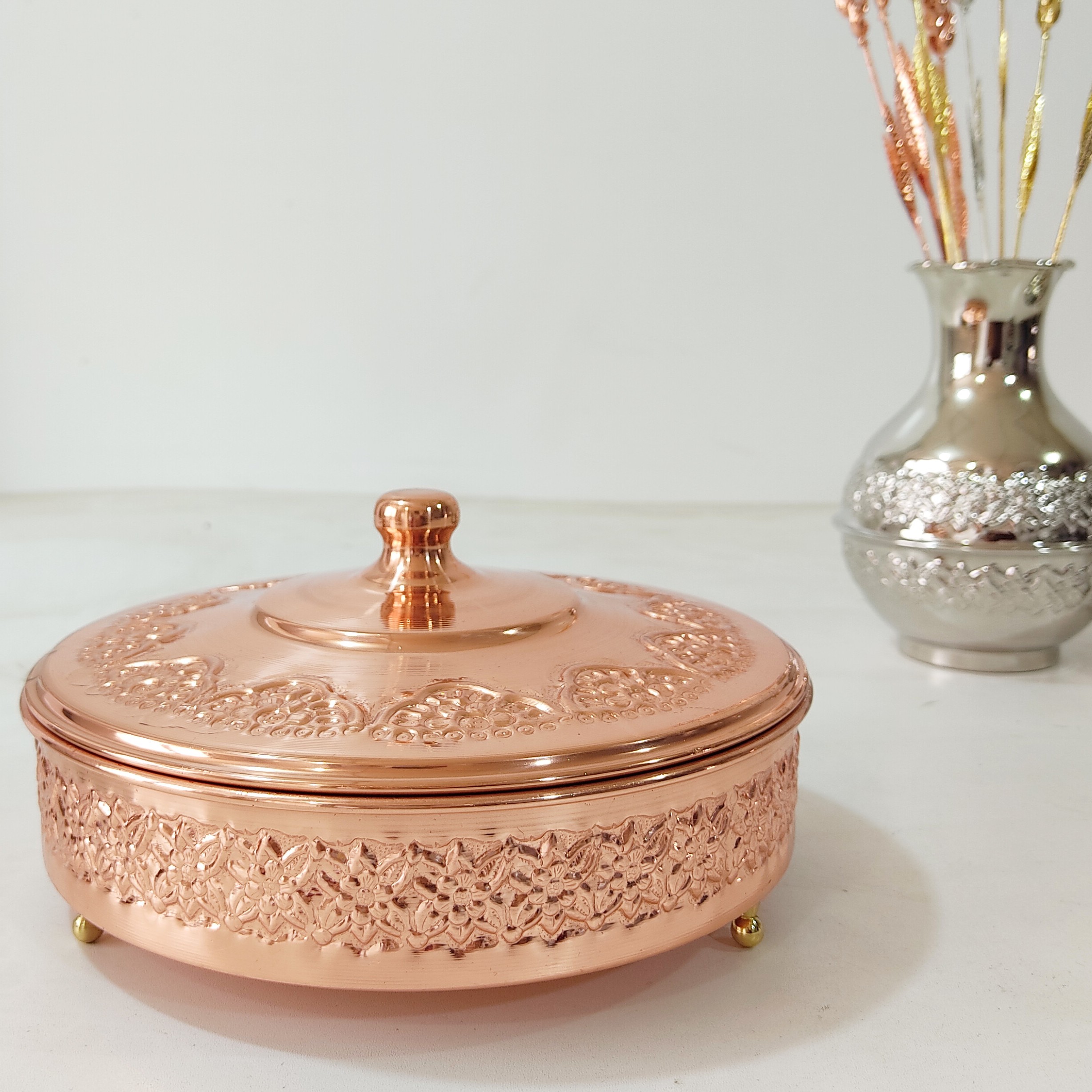 گز خوری یا تنقلات و شیرینی خوری مسی زنجان طرح برجسته کار شده رنگ ثابت در دار و مدل ۳ پایه بسیار شیک و درجه یک قطر دهانه ۲۰