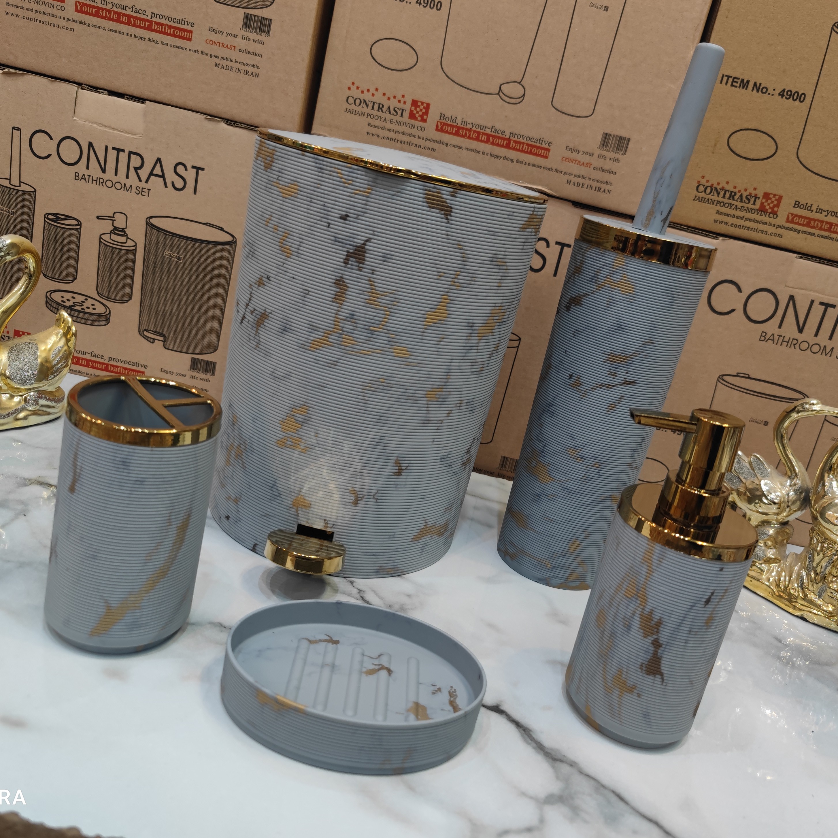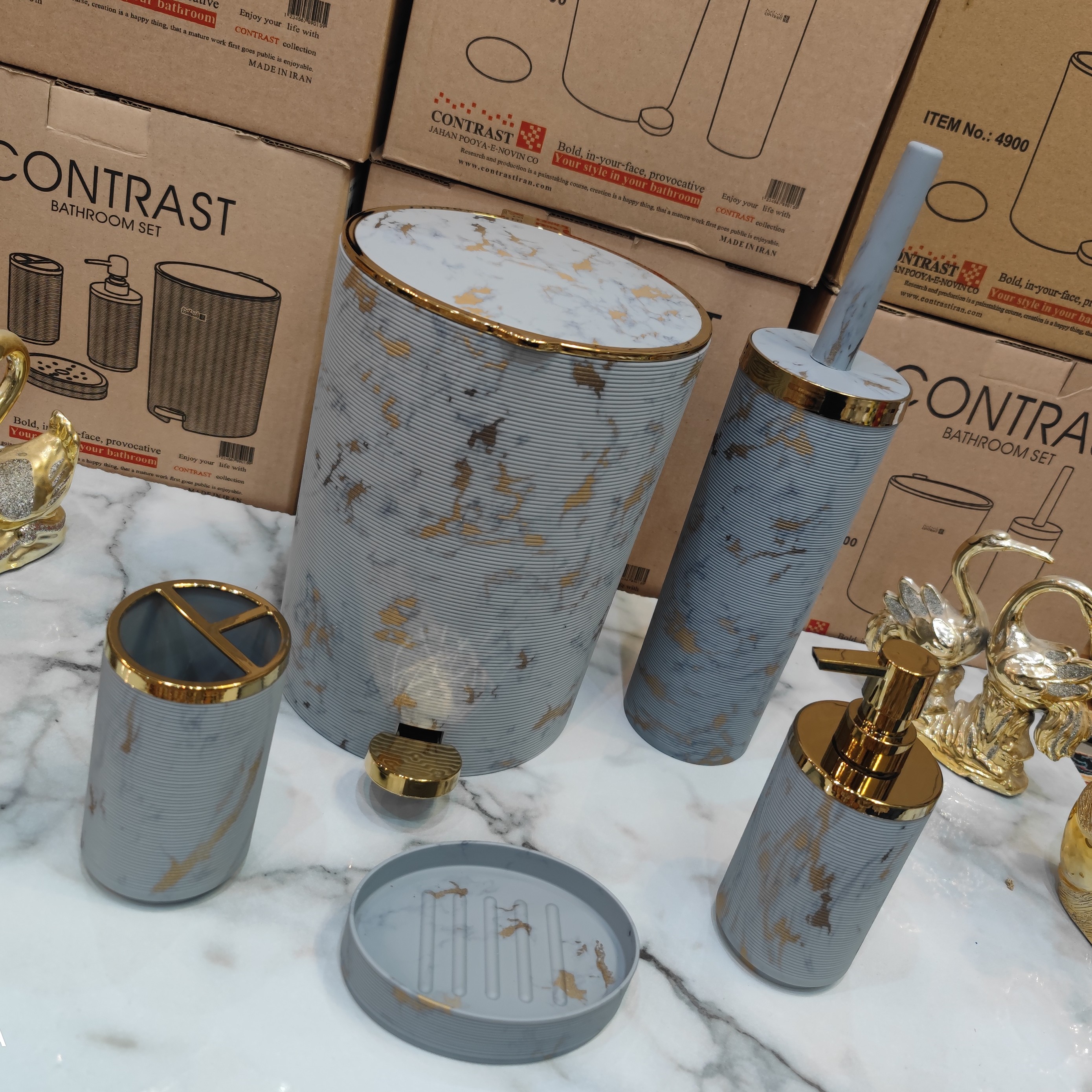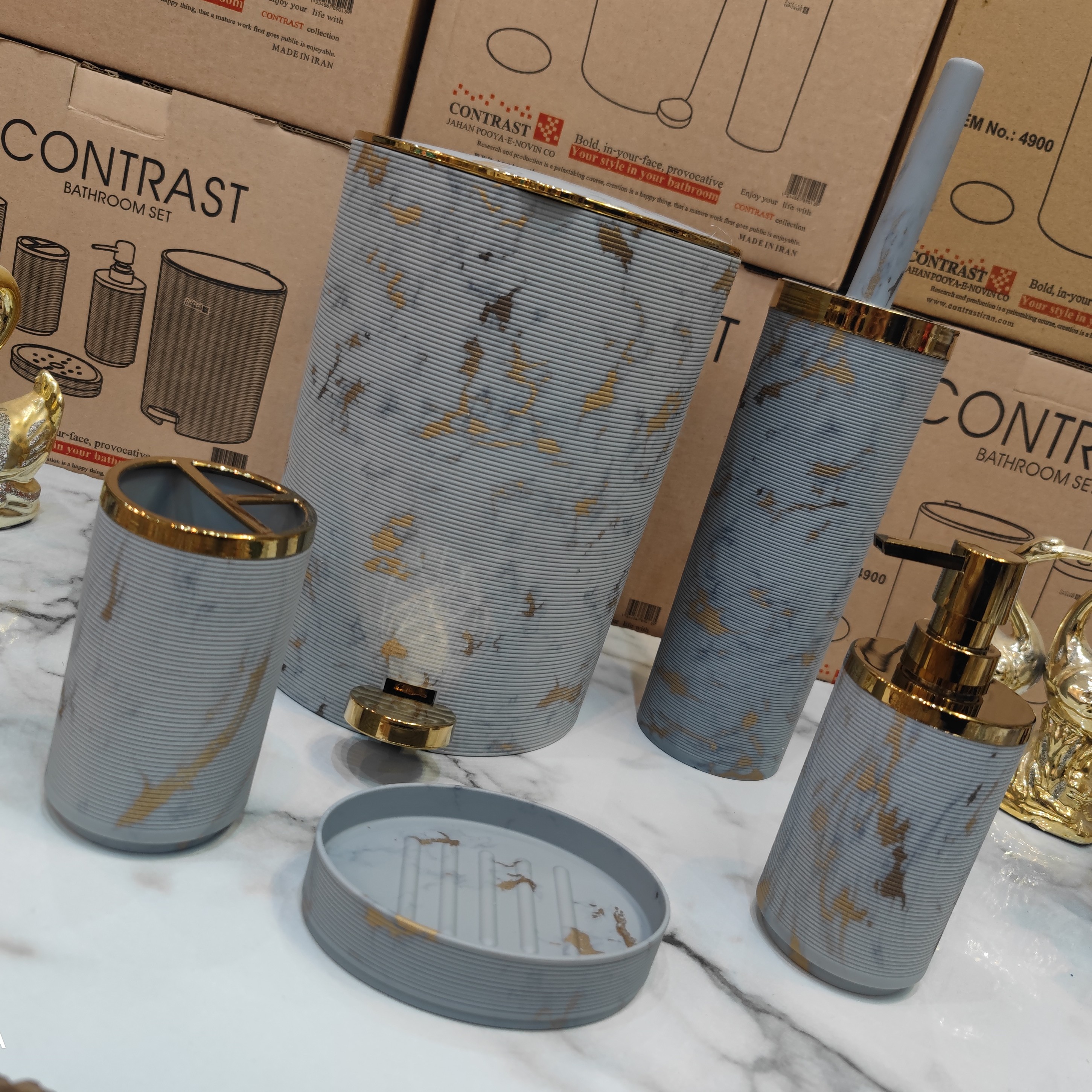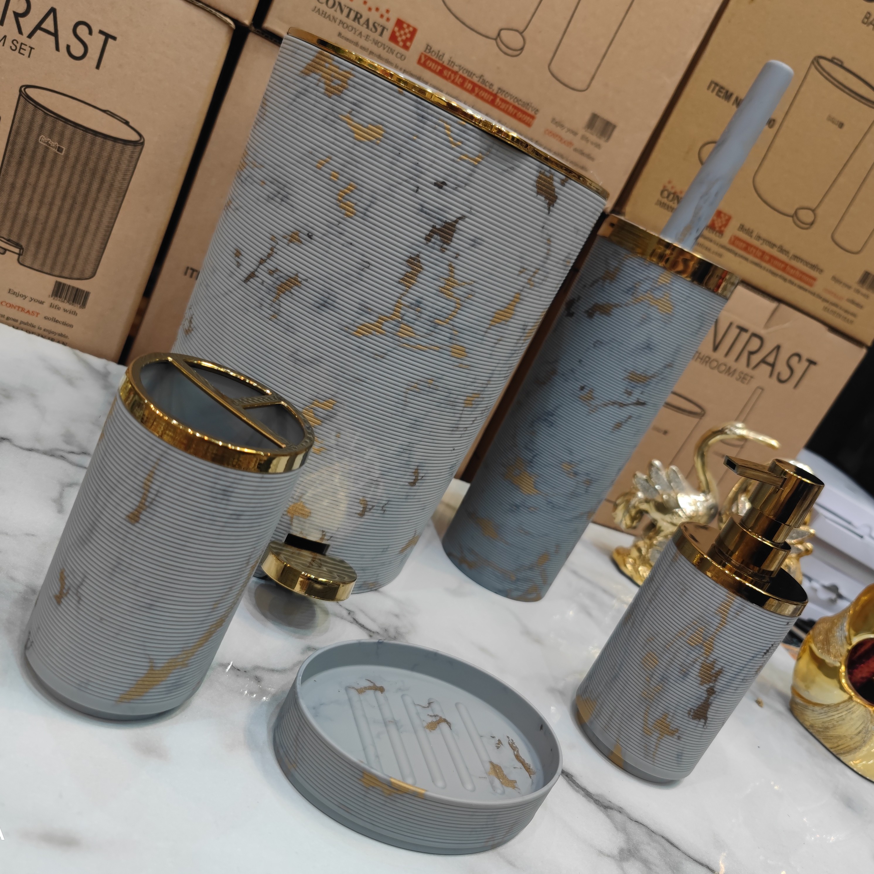 ست سرویس بهداشتی 5 پارچه طرح خط ریز برند کنتراست رنگ بسیار زیبا و پرطرفدار و خاص ماربل طوسی روشن طلایی مبلمونسرا مدل 265206