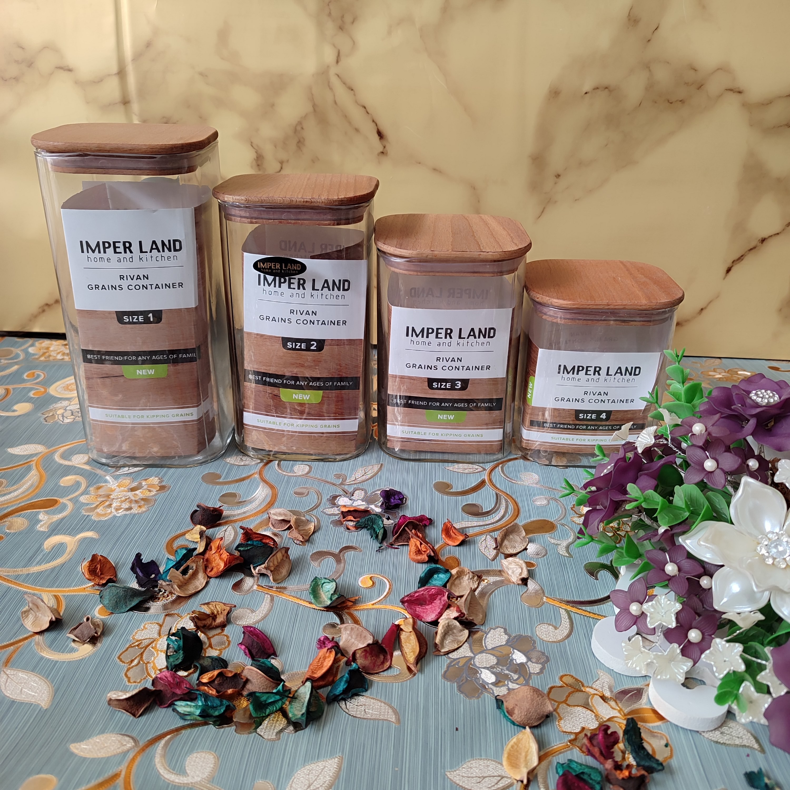 بانکه شیشه ای سایز شماره 1 بزرگ درب چوب بامبو مخصوص حبوبات و قند و پولک مربع شکل