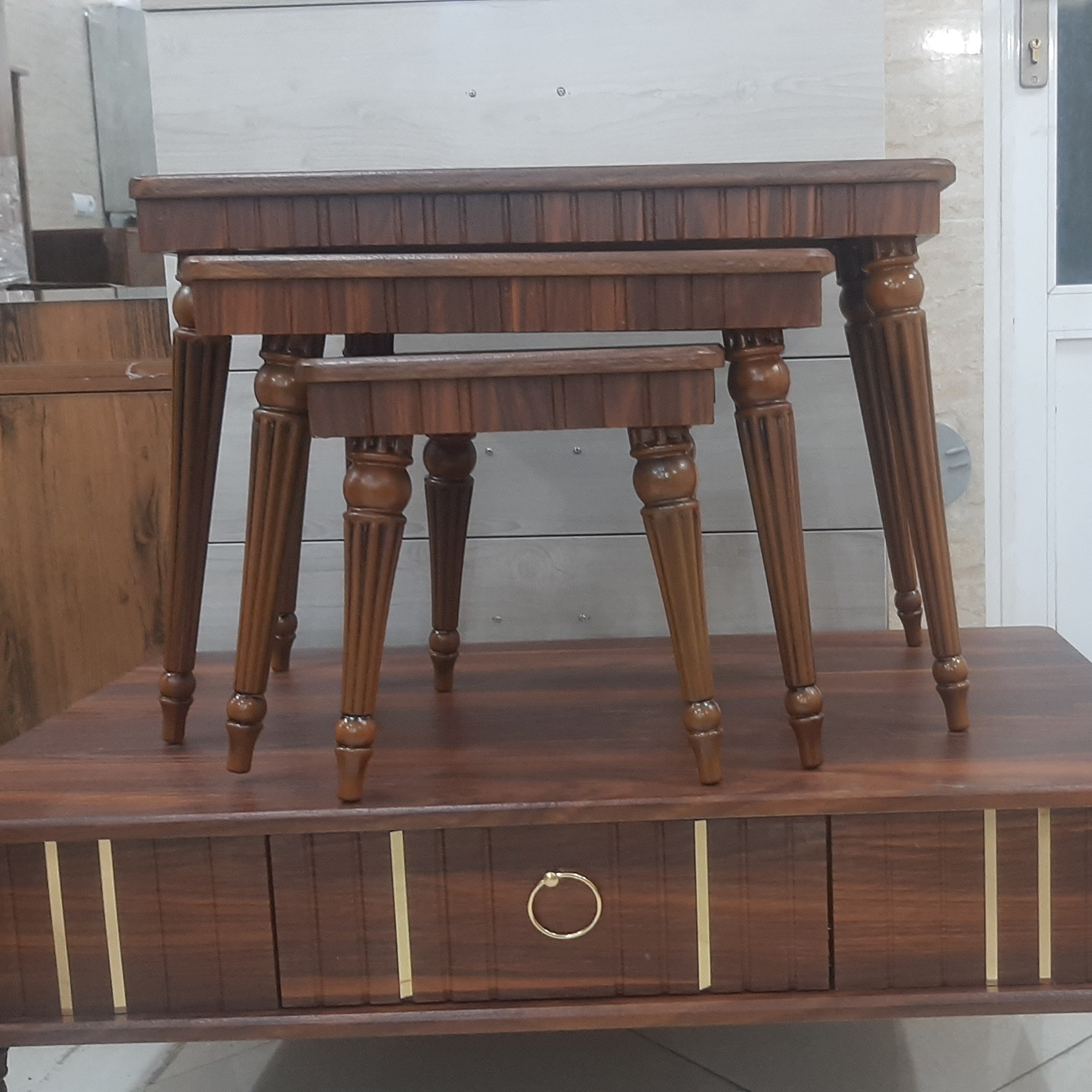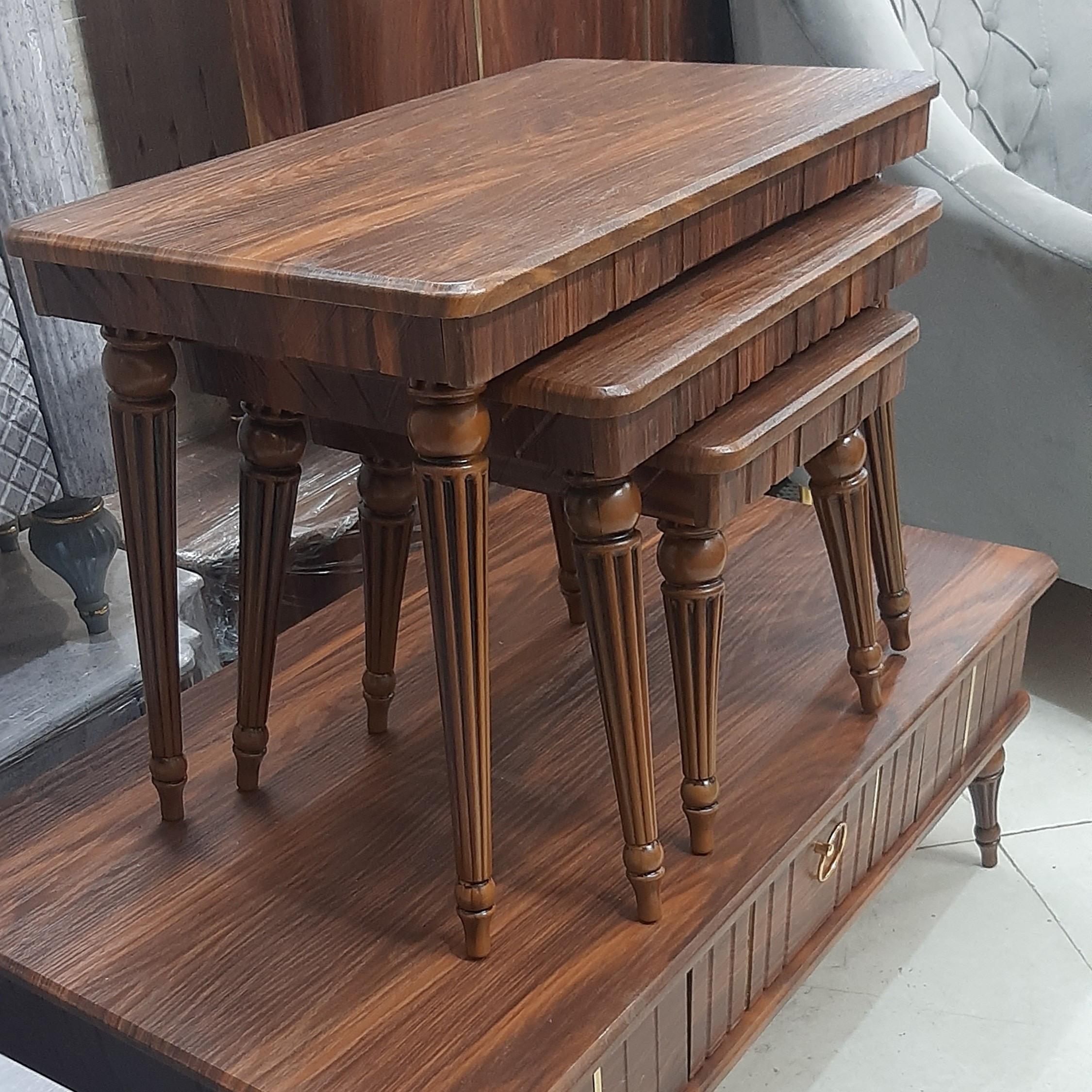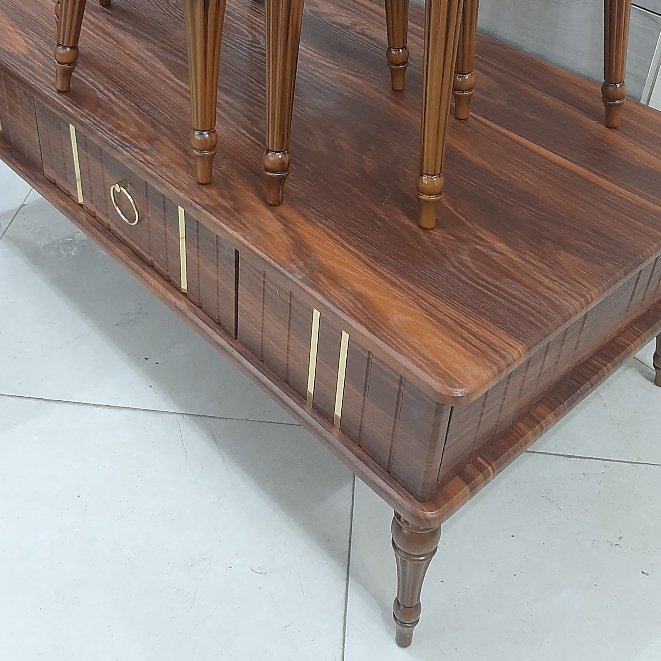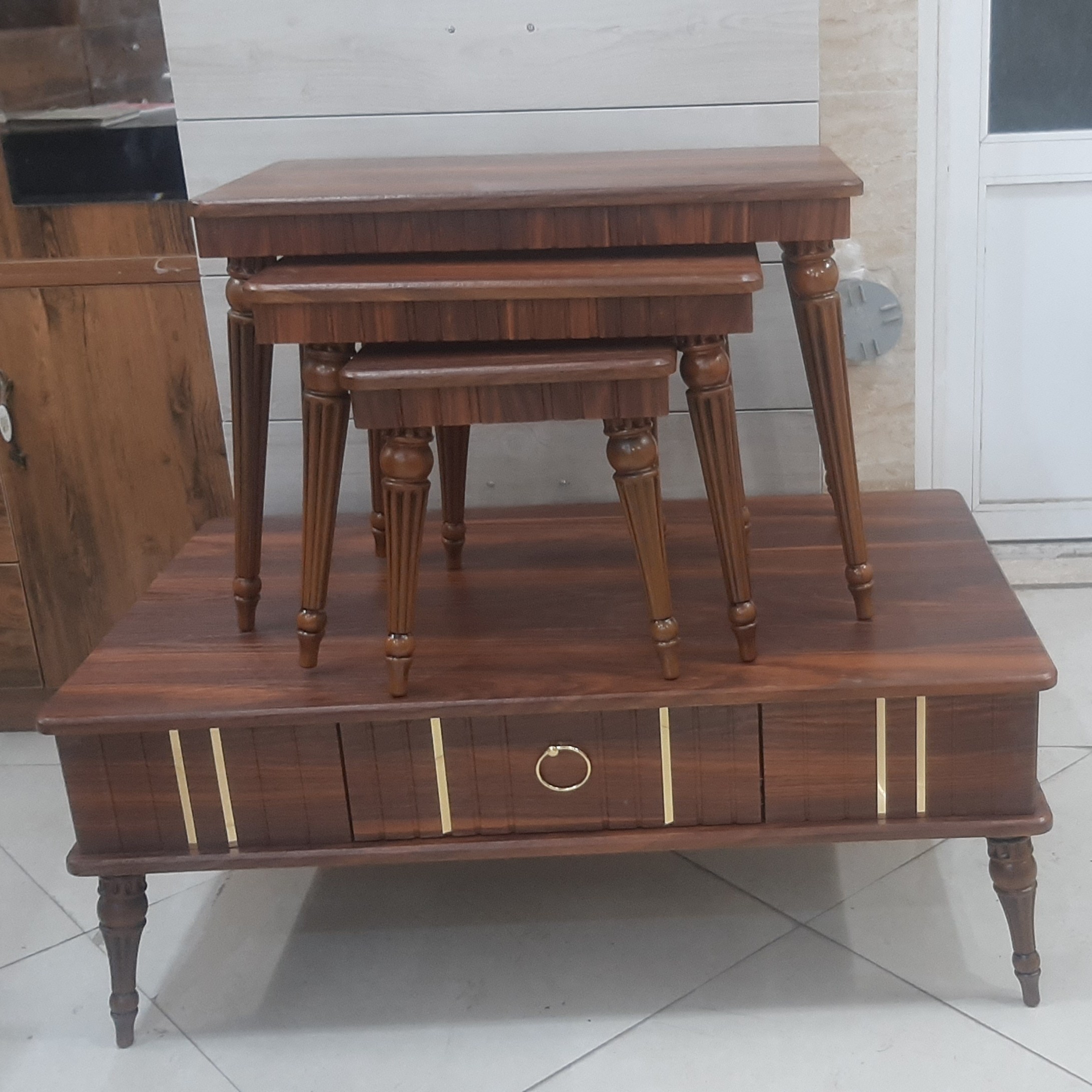 میزعسلی وکیوم شامل یک میز بزرگ و سه عدد عسلی است که عسلی ها زیر هم دیگر می روند. رنگ بندی سلیقه ای است. رنگ بندی بیشتر شامل سفید، کلیاف، والیس، بتنی ، مشکی یا دودی است. جنس رویه میز ام دی اف با رویه وکیوم ضدخش می باشد. جنس پایه ها نوعی پلاستیک فشرده محکم و بادوام می باشد . میز اصلی دارای کشو می باشد.